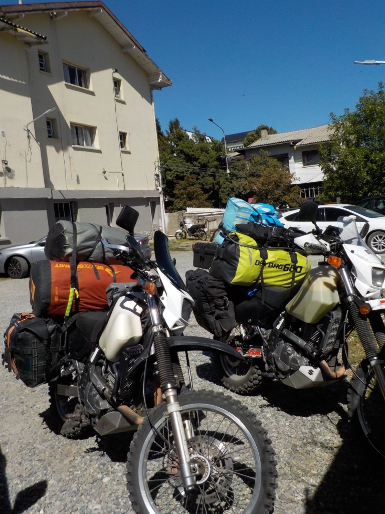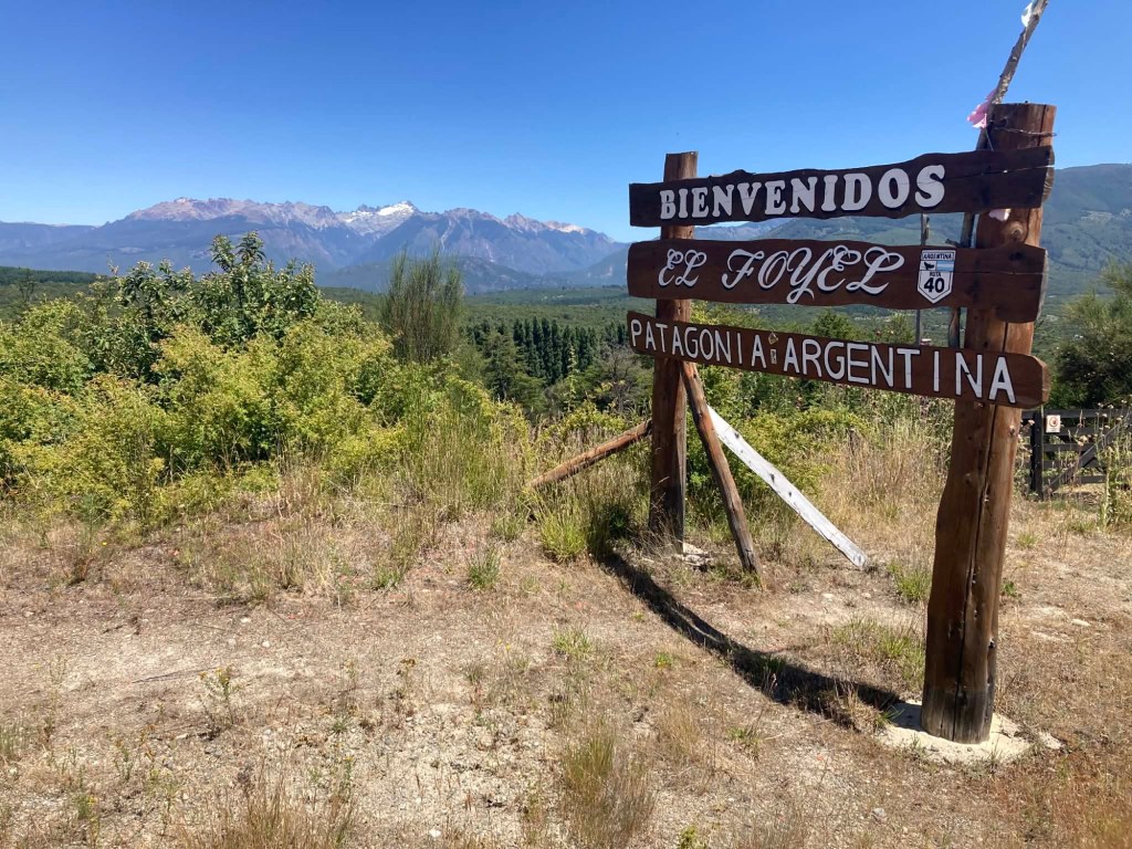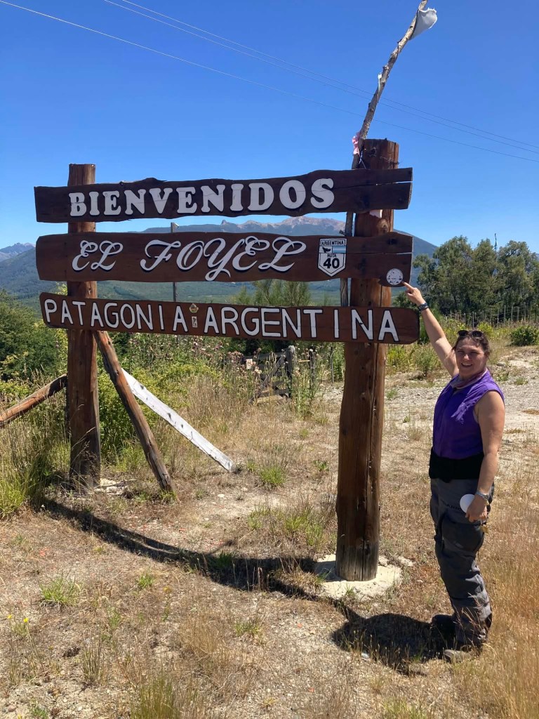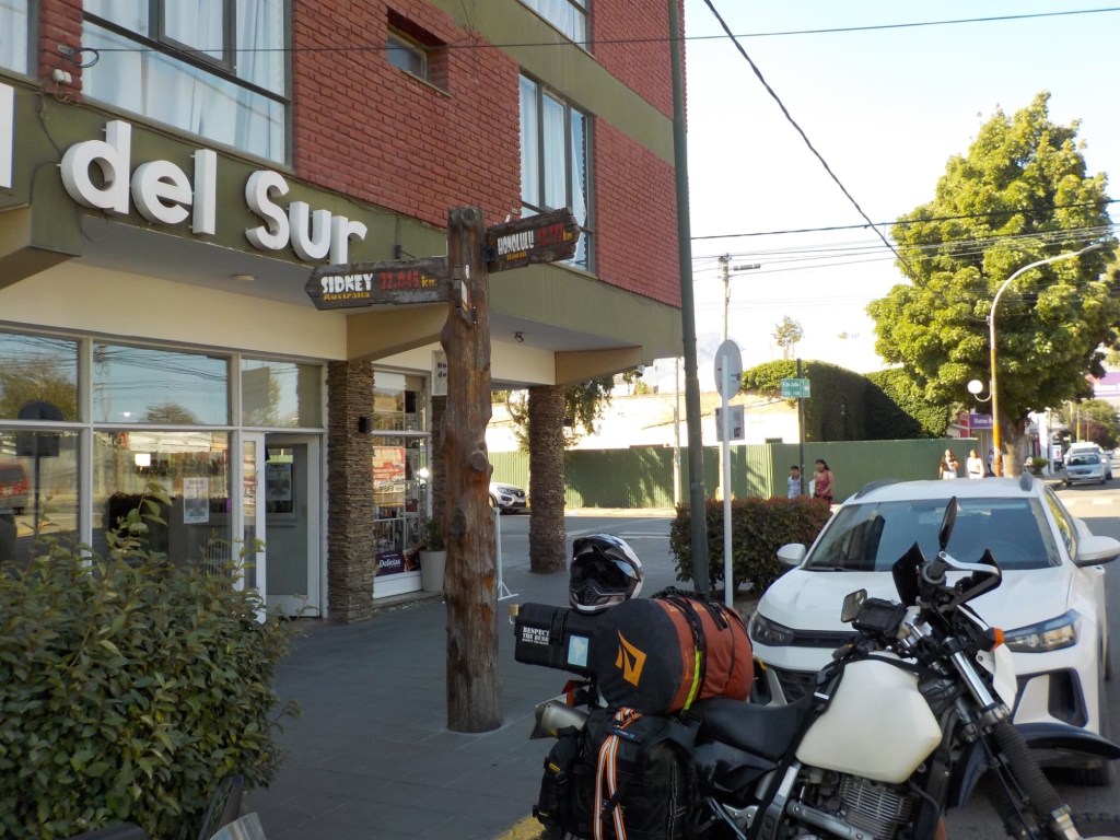 We started the today with a lovely breakfast at our hotel in Bariloche. I got some supplies from a local supermarket for lunch and for camping which we are planning in the next few days. Today was our longest ride so far covering 284 km and it was another very warm day reaching 27 but certainly felt a lot warmer in the sun. After riding past two more incredible lakes, we found the perfect spot for lunch – in the shade with some benches and an incredible view of mountains with snow capped peaks. A cat with blue eyes came and joined us for lunch. I placed our first sticker 😉👍 today at the lunch spot and we continued on to El Bolsón where we fuelled up and had the first good view of the incredible smoke wall from the burning wildfires – we saw waterballon carrying helicopters and planes landing and taking off to fight the fire which was of such a huge scale it is hard to grasp. We continued and were in hazy, eerie and smoky conditions riding for the remainder of the afternoon for more than 100 kms. It was very hot and we were happy to arrive in Esquel by 5:00pm. We payed extra for secure parking of the bikes and took pictures of the signs in front of the hotel indicating the distance to Sydney 😉 and to Ushuaia. The town has a very nice vibe and felt safe and we enjoyed a traditional slow cooked (asado ) grilled beef with salad and tried our first Don Pedro dessert. We have not yet decided whether to continue on Routa 40 South or head East on 26 until we reach the ocean on the East coast of Argentina. We aim to camp and will be remote for a few days if we go East.