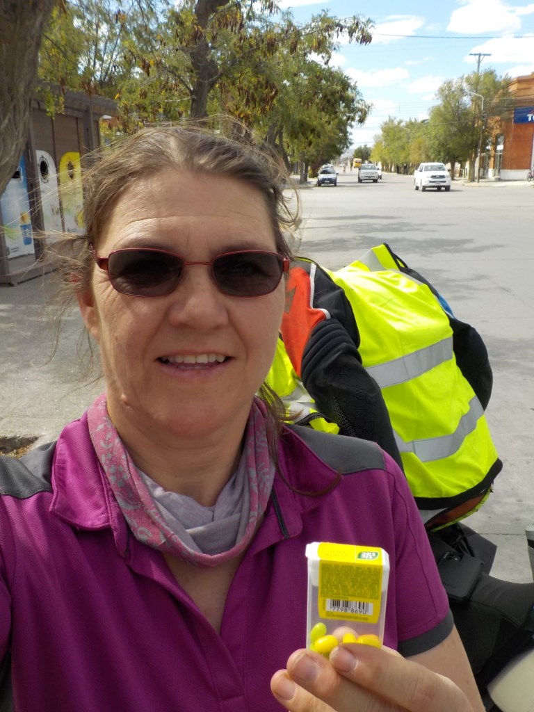 We had a lunch stop at Samiento. And for my daughter – the tic tac got me through the day 😂🤗👍. We also rode through a large area of oil well pumps as far as the eye could see and some mining areas too (no pictures as we could not stop anywhere) . The wind grew stronger and the temperature plummeted as we approached the coast and we had to stop to close our jackets and put more layers on.