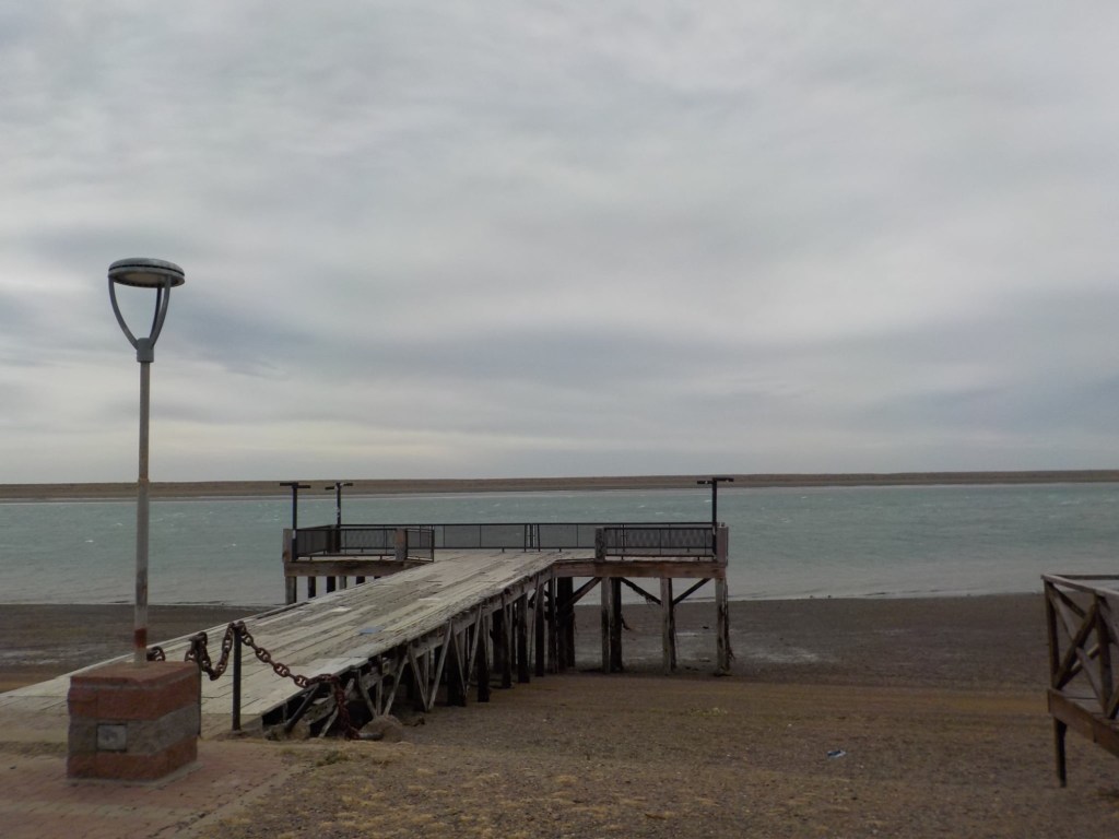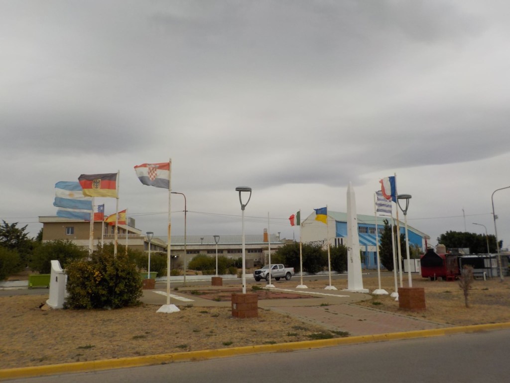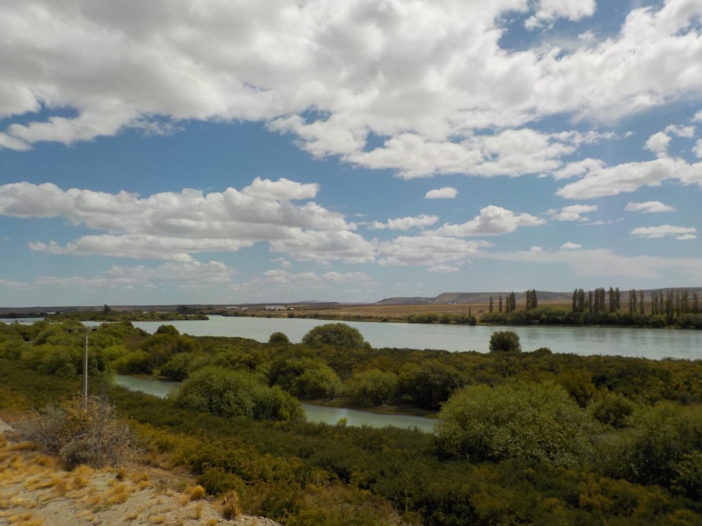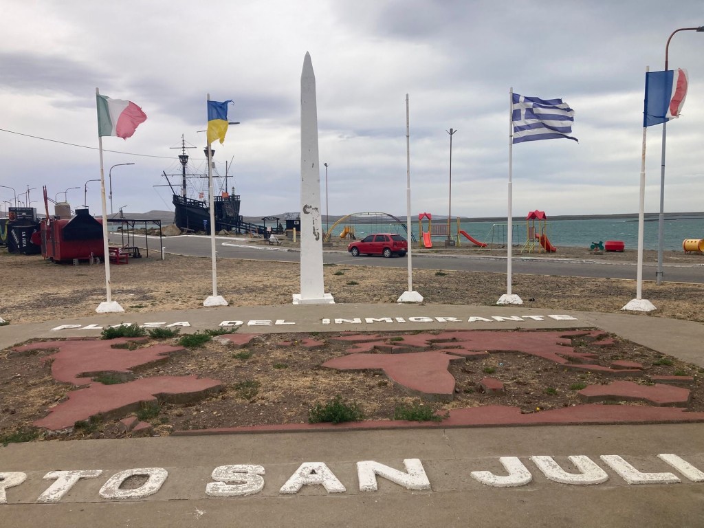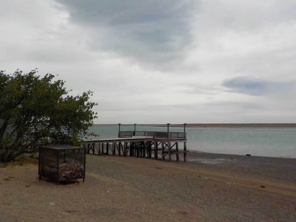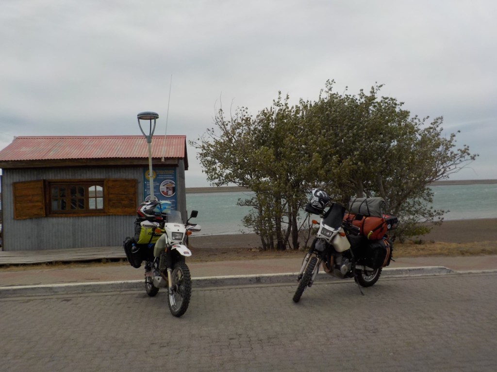 We had not covered our bikes because of the strong wind even in the courtyard where the bikes were parked. In the early morning hours we woke to rain which was not in the forecast. The wind was still incredibly strong and after the rain stopped it was cloudy and we decided to head to the water front and wait until lunch when the wind was supposed to reduce slightly. There was a plaza de immigration commemorating immigrants from many countries. We left shortly after midday with the wind still very strong and riding was difficult to say the least. I had a complete melt down not knowing how to manhandle the bike against the string cross wind as I tried to lean it and steer it into the wind which was exhausting and I could not have done that for the entire way. Andrew showed me how to keep the bike upright but lean the body into the wind sitting way off the bike on the windy side and that worked a lot better and required less strengths. We had put extra layers on after the very cold previous evening but it warmed up quickly and temperature rose to 26 degrees. There are very few spots to stop anywhere along the road and the shoulder is very lose and deep sand or gravel and cambered making it hard to pull off the road – we eventually found a nice spot on Isla Pavon overlooking Rio Santa Cruz only 24 km before Puerti Santa Cruz where we stopped for a snack and took our rain jackets off.