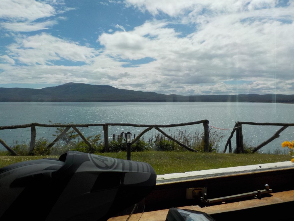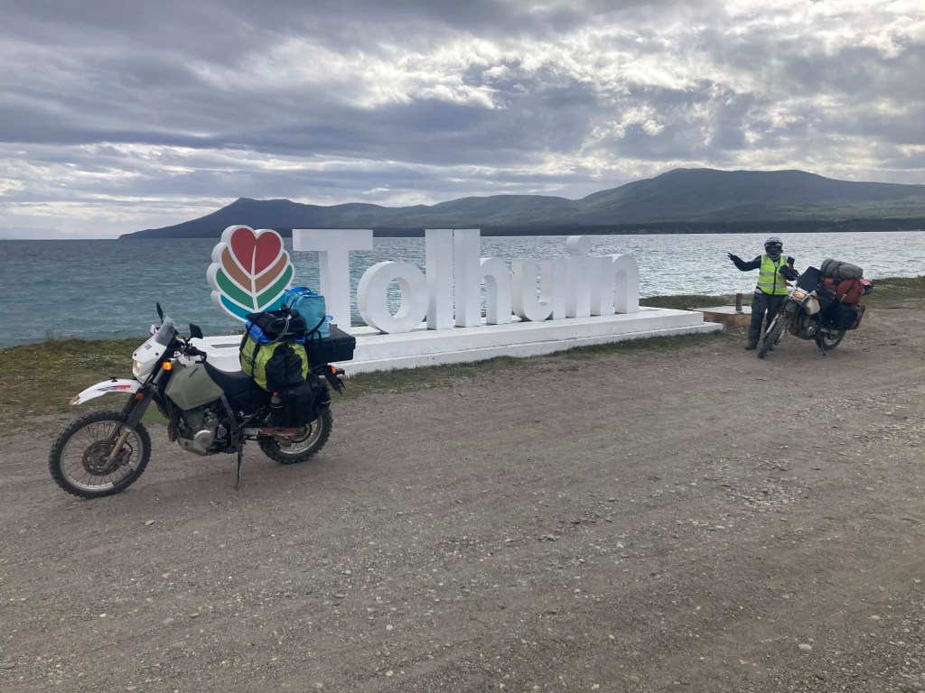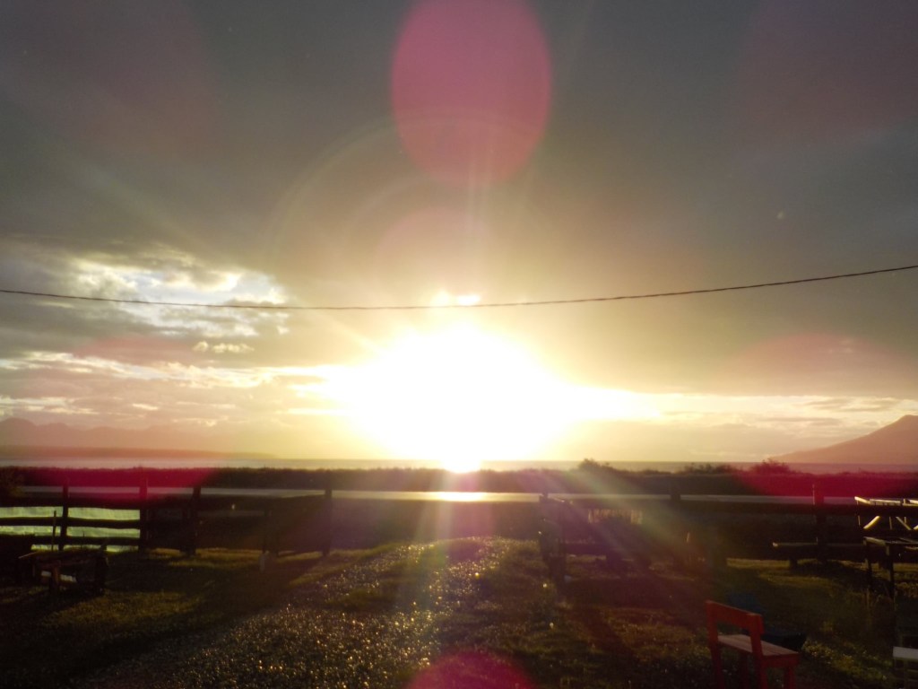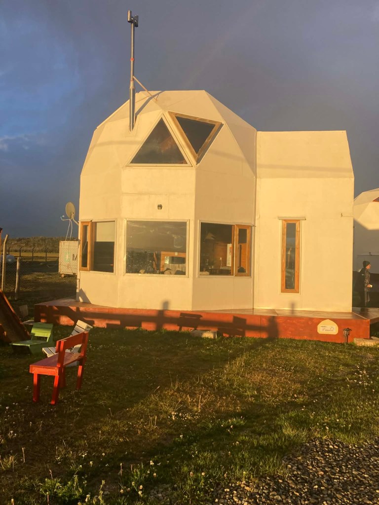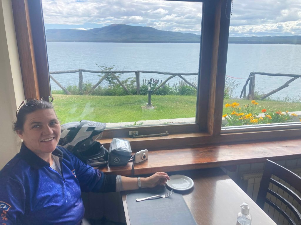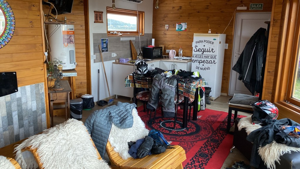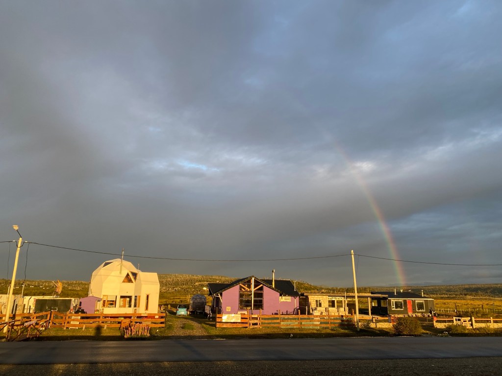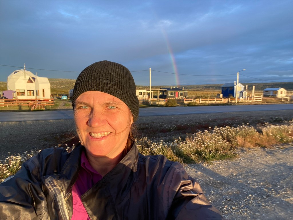 We enjoyed our breakfast overlooking the Rio Grande with the water moving quite fast. We cleaned the bikes enough to add some stickers and left around 11:00am in bright sunshine wondering whether we had put too many layers of clothes on. We only had about 100km to ride to Tolhuin and check in was not until 3:00pm at the place I had booked. It was a nice ride on Ruta 3 with the vegetation completely different to previous days with weathered small trees covered in lichens and much greener with reddish grasses and standing water in the valleys. After fuelling up on the outskirts of Tolhuin we decided to continue past Tolhuin to a restaurant overlooking Lago Fagnano for lunch. We had a lovely meal with a view overlooking the lake and the mountain range behind it and saw a road continuing on the lake foreshore past some white dome shaped buildings towards the township of Tolhuin and decided to take this road back to town and to our hotel after we placed some of our stickers on the hotel/restaurant window. The road went over an old wooden bridge, past the Tolhuin sign which we stopped at for pictures and then headed up and around the outskirts of town towards the hotel I had booked via booking.com On the way we got chased by two dogs which was super scary – not sure how I managed to keep the bike up and not pass out as I am terrified of dogs from a childhood incident where I was mauled by a dog and I used to pass out every time a dog approached and barked at me – the way these dogs run at the bikes and bark and chase along is very scary. We arrived at the place and nobody was on site – with my phone only having a little charge left, I messaged through booking.com which room and what the code for the key box was and we waited for a reply – there was a local phone number which we can’t ring from our phones snd after 3 messages with no reply and having waited over 30 minutes I was getting impatient (so not like me 😉😂) To make things worse some dark clouds blew in and it started raining and I really needed a baño. After sending a few more messages through booking.com and getting a reply with the name of the owner and a local phone number which I had already explained that we could not call and the owner was not on WhatsApp, we decided to book something else to get out of the cold and wet and – turns out that the white dome shaped buildings we saw from the restaurant and had driven past earlier were accommodations and they had one available for the night – we booked it and got on our way when a big Ute pulled up in front of us trying to block our way – the owner had finally arrived he walked up to Andrew shaking his hand but I did not want to have anything to do with him – we had stood outside for over an hour without any message back from him – he said he called my number but could not get through and asked if we are cancelling – Andrew apologised and we rode off back past the barking dogs and to the new accommodation right on the foreshore of the lake – the owner there was lovely and welcomed us – the place is amazing and has so much character and we were happy to have a lovely dry warm place with an amazing view for the night. We enjoyed the evening sunlight with a rainbow and took lots of pictures of the sunset.