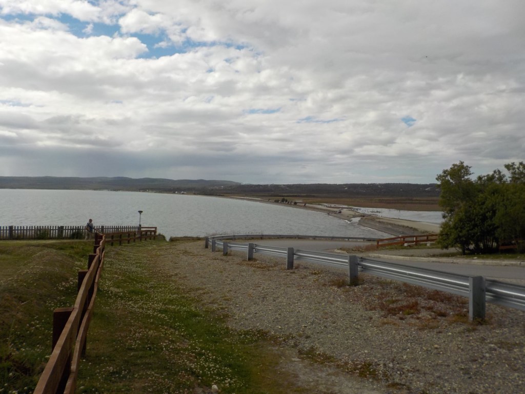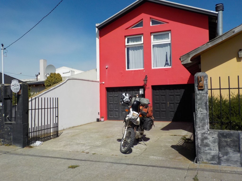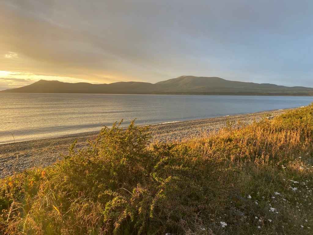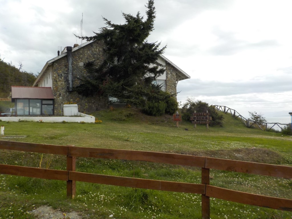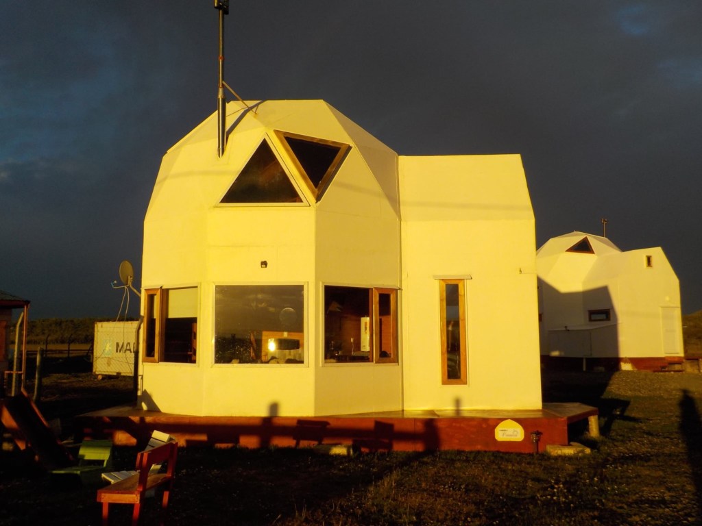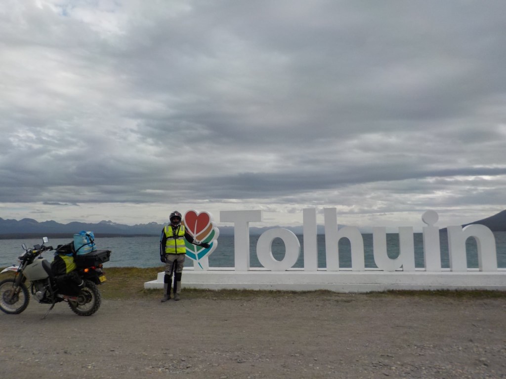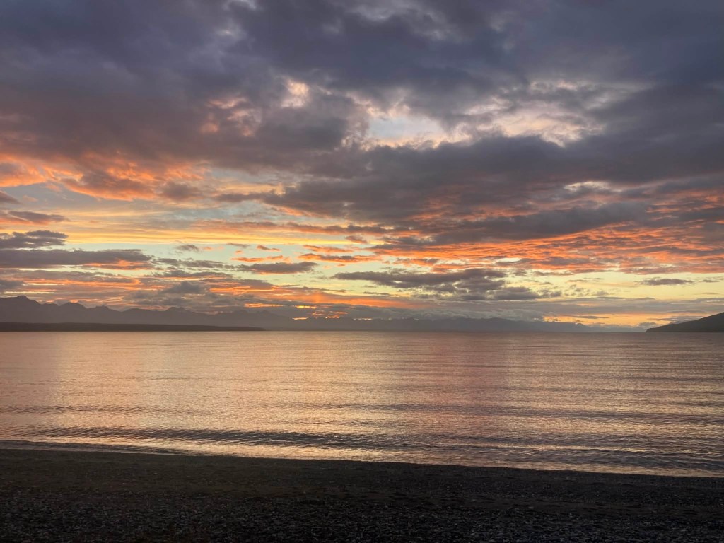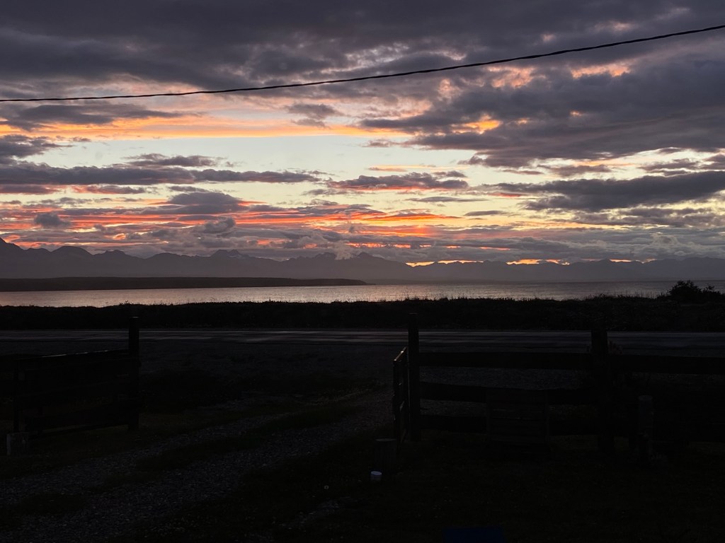 We enjoyed our breakfast overlooking the Rio Grande with the water moving quite fast. We cleaned the bikes enough to add some stickers and left around 11:00am in bright sunshine wondering whether we had put too many layers of clothes on. We only had about 100km to ride to Tolhuin and check in was not until 3:00pm at the place I had booked. It was a nice ride on Ruta 3 with the vegetation completely different to previous days with weathered small trees covered in lichens and much greener with reddish grasses and standing water in the valleys. After fuelling up on the outskirts of Tolhuin we decided to continue past Tolhuin to a restaurant overlooking Lago Fagnano for lunch. We had a lovely meal with a view overlooking the lake and the mountain range behind it and saw a road continuing on the lake foreshore past some white dome shaped buildings towards the township of Tolhuin and decided to take this road back to town and to our hotel after we placed some of our stickers on the hotel/restaurant window. The road went over an old wooden bridge, past the Tolhuin sign which we stopped at for pictures and then headed up and around the outskirts of town towards the hotel I had booked via booking.com On the way we got chased by two dogs which was super scary – not sure how I managed to keep the bike up and not pass out as I am terrified of dogs from a childhood incident where I was mauled by a dog and I used to pass out every time a dog approached and barked at me – the way these dogs run at the bikes and bark and chase along is very scary. We arrived at the place and nobody was on site – with my phone only having a little charge left, I messaged through booking.com which room and what the code for the key box was and we waited for a reply – there was a local phone number which we can’t ring from our phones snd after 3 messages with no reply and having waited over 30 minutes I was getting impatient (so not like me 😉😂) To make things worse some dark clouds blew in and it started raining and I really needed a baño. After sending a few more messages through booking.com and getting a reply with the name of the owner and a local phone number which I had already explained that we could not call and the owner was not on WhatsApp, we decided to book something else to get out of the cold and wet and – turns out that the white dome shaped buildings we saw from the restaurant and had driven past earlier were accommodations and they had one available for the night – we booked it and got on our way when a big Ute pulled up in front of us trying to block our way – the owner had finally arrived he walked up to Andrew shaking his hand but I did not want to have anything to do with him – we had stood outside for over an hour without any message back from him – he said he called my number but could not get through and asked if we are cancelling – Andrew apologised and we rode off back past the barking dogs and to the new accommodation right on the foreshore of the lake – the owner there was lovely and welcomed us – the place is amazing and has so much character and we were happy to have a lovely dry warm place with an amazing view for the night. We enjoyed the evening sunlight with a rainbow and took lots of pictures of the sunset.