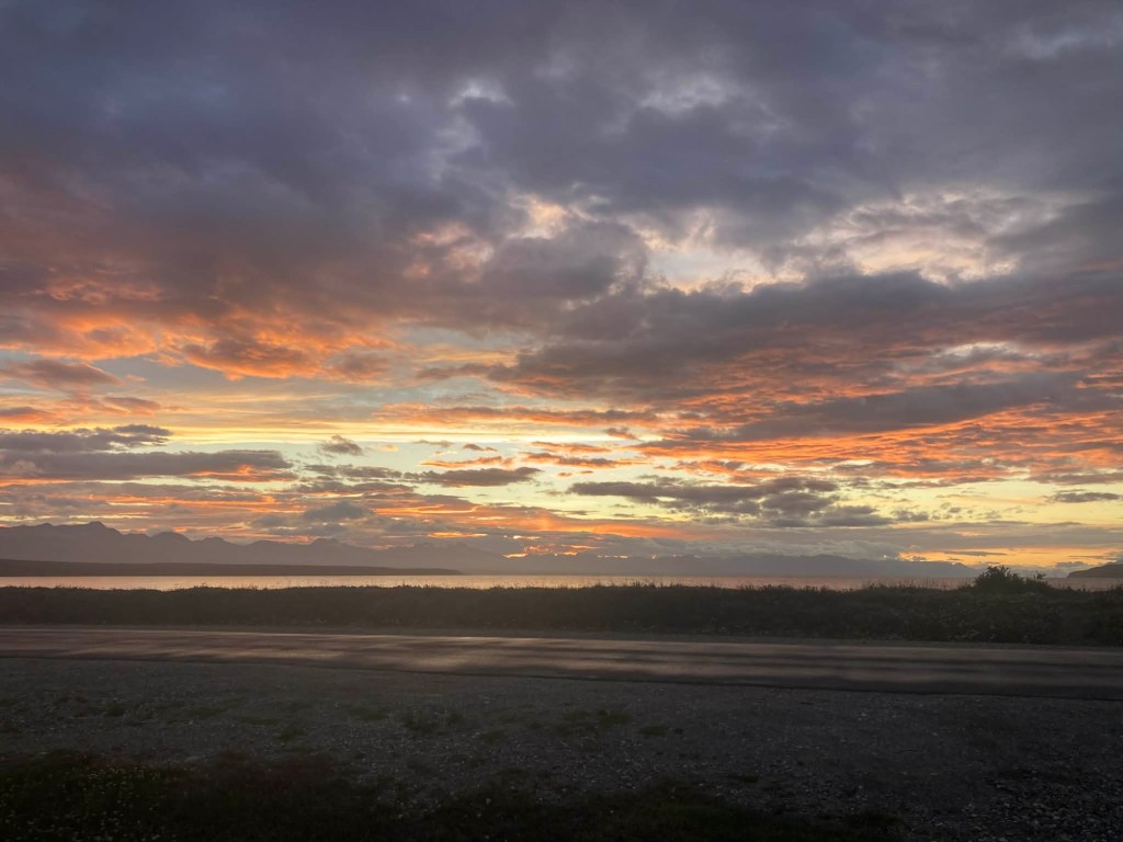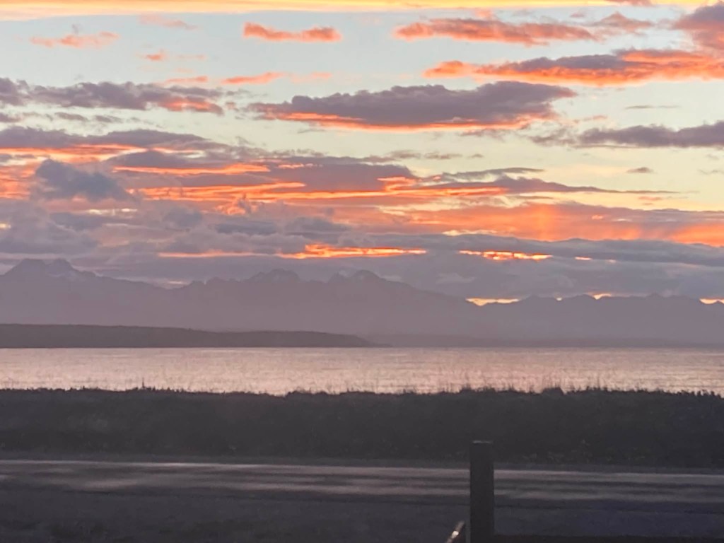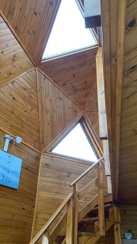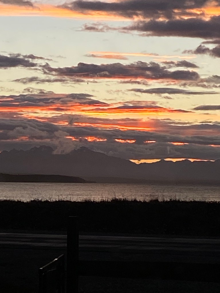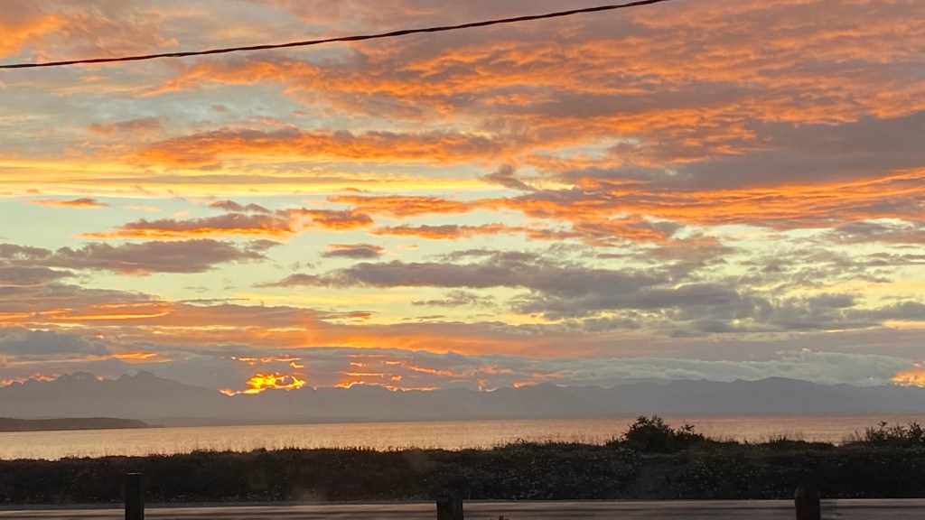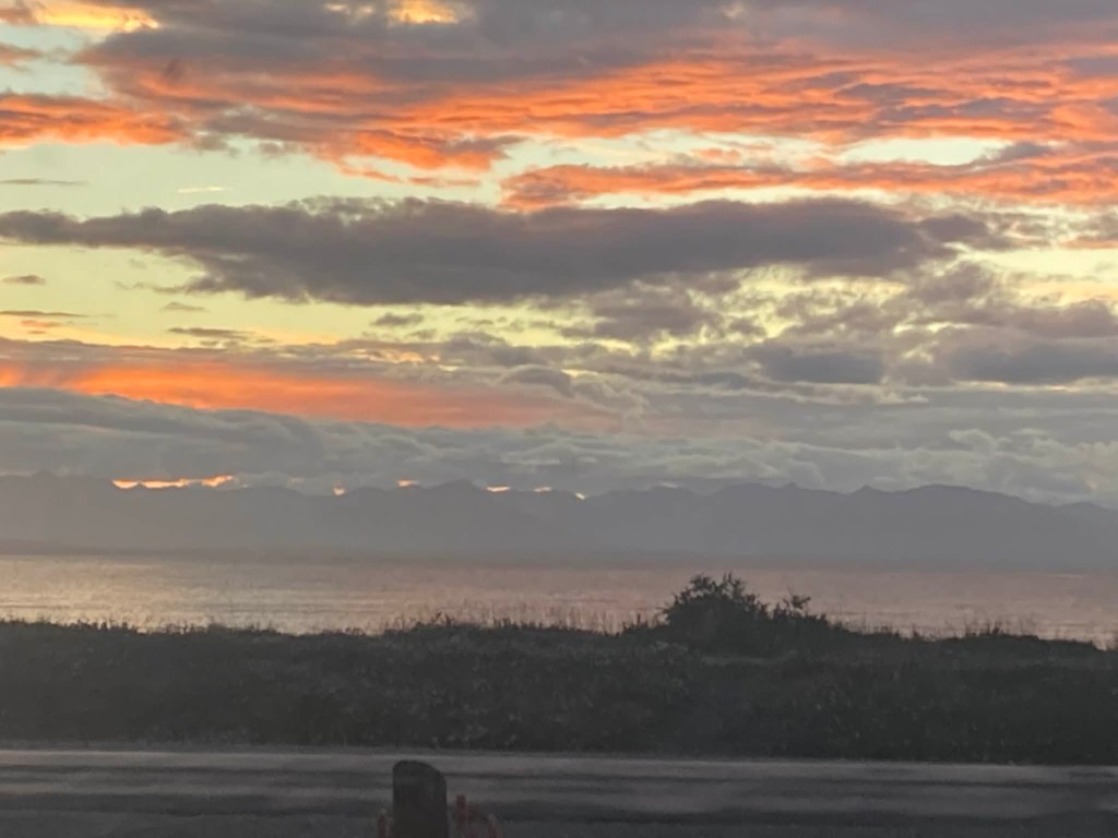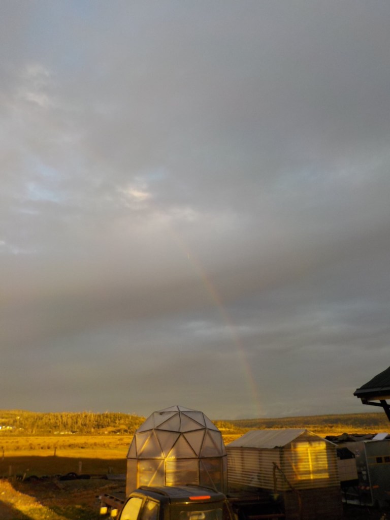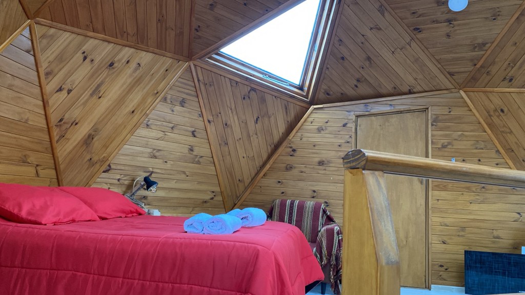 We enjoyed our breakfast overlooking the Rio Grande with the water moving quite fast. We cleaned the bikes enough to add some stickers and left around 11:00am in bright sunshine wondering whether we had put too many layers of clothes on. We only had about 100km to ride to Tolhuin and check in was not until 3:00pm at the place I had booked. It was a nice ride on Ruta 3 with the vegetation completely different to previous days with weathered small trees covered in lichens and much greener with reddish grasses and standing water in the valleys. After fuelling up on the outskirts of Tolhuin we decided to continue past Tolhuin to a restaurant overlooking Lago Fagnano for lunch. We had a lovely meal with a view overlooking the lake and the mountain range behind it and saw a road continuing on the lake foreshore past some white dome shaped buildings towards the township of Tolhuin and decided to take this road back to town and to our hotel after we placed some of our stickers on the hotel/restaurant window. The road went over an old wooden bridge, past the Tolhuin sign which we stopped at for pictures and then headed up and around the outskirts of town towards the hotel I had booked via booking.com On the way we got chased by two dogs which was super scary – not sure how I managed to keep the bike up and not pass out as I am terrified of dogs from a childhood incident where I was mauled by a dog and I used to pass out every time a dog approached and barked at me – the way these dogs run at the bikes and bark and chase along is very scary. We arrived at the place and nobody was on site – with my phone only having a little charge left, I messaged through booking.com which room and what the code for the key box was and we waited for a reply – there was a local phone number which we can’t ring from our phones snd after 3 messages with no reply and having waited over 30 minutes I was getting impatient (so not like me 😉😂) To make things worse some dark clouds blew in and it started raining and I really needed a baño. After sending a few more messages through booking.com and getting a reply with the name of the owner and a local phone number which I had already explained that we could not call and the owner was not on WhatsApp, we decided to book something else to get out of the cold and wet and – turns out that the white dome shaped buildings we saw from the restaurant and had driven past earlier were accommodations and they had one available for the night – we booked it and got on our way when a big Ute pulled up in front of us trying to block our way – the owner had finally arrived he walked up to Andrew shaking his hand but I did not want to have anything to do with him – we had stood outside for over an hour without any message back from him – he said he called my number but could not get through and asked if we are cancelling – Andrew apologised and we rode off back past the barking dogs and to the new accommodation right on the foreshore of the lake – the owner there was lovely and welcomed us – the place is amazing and has so much character and we were happy to have a lovely dry warm place with an amazing view for the night. We enjoyed the evening sunlight with a rainbow and took lots of pictures of the sunset.