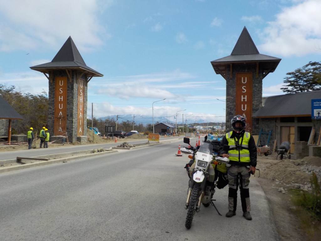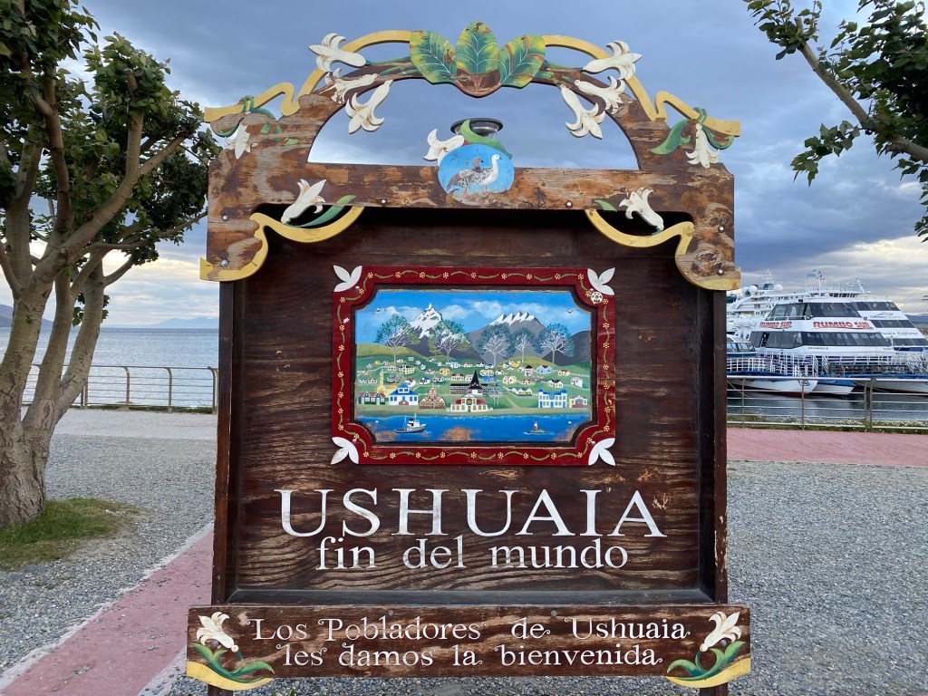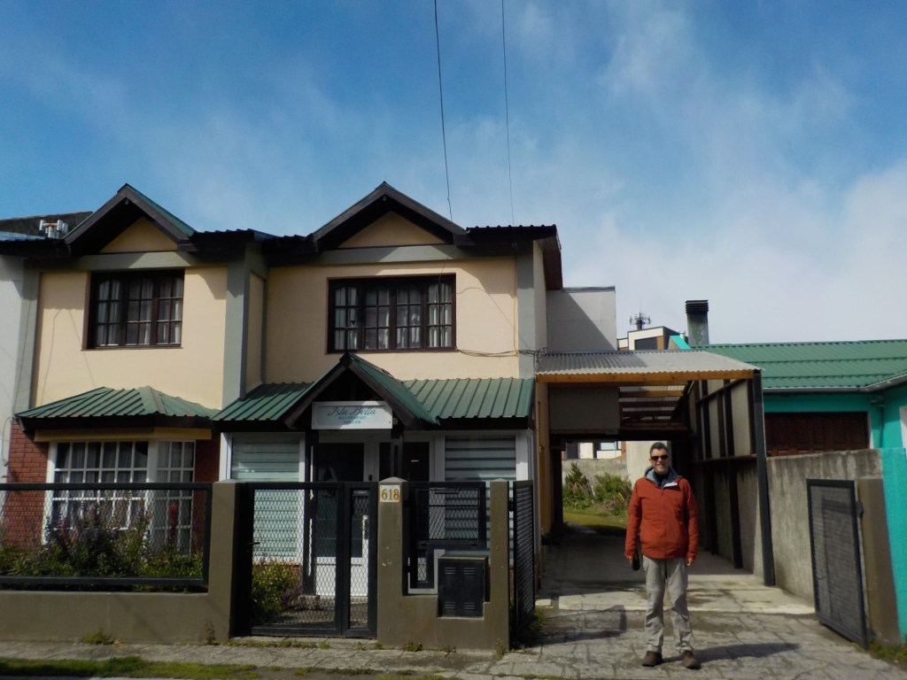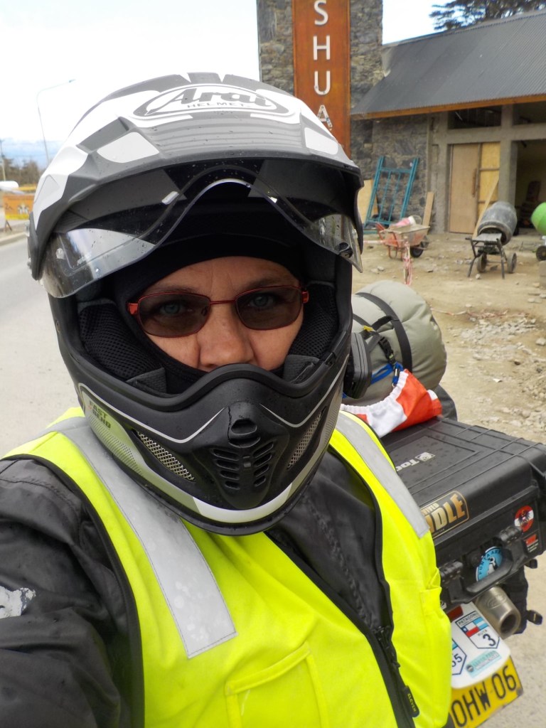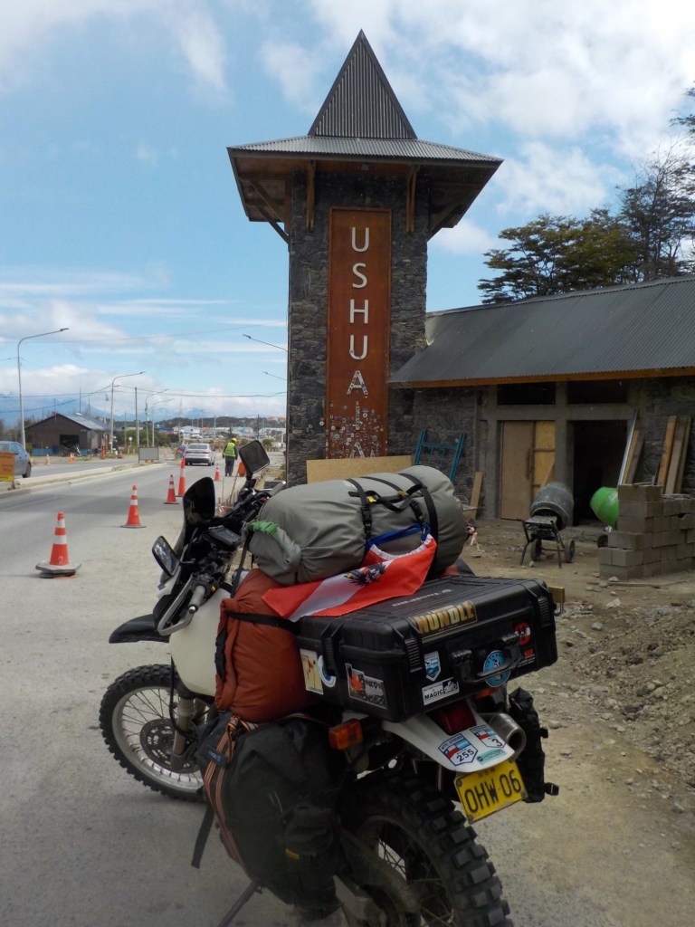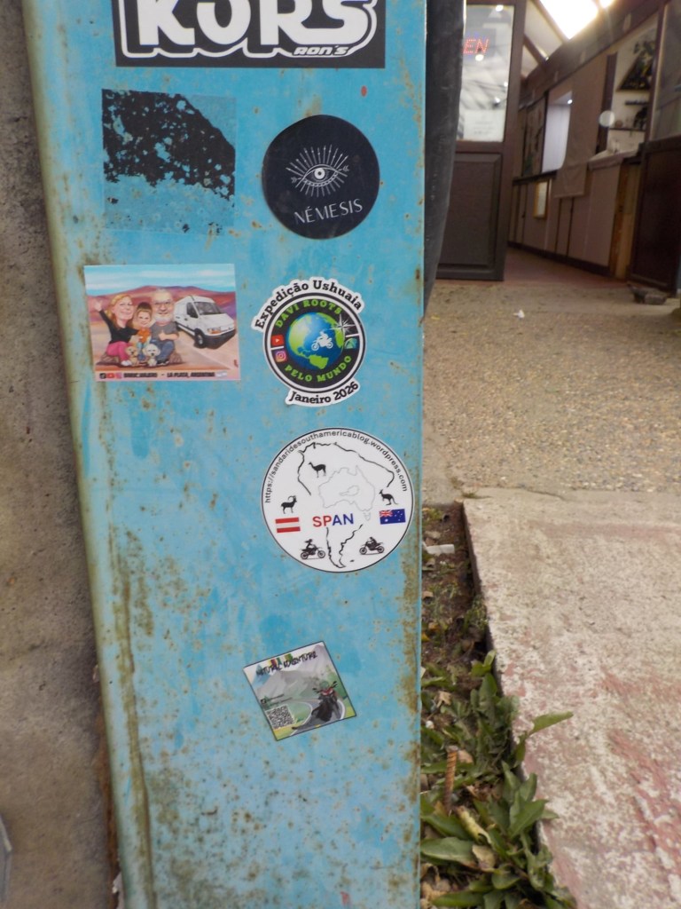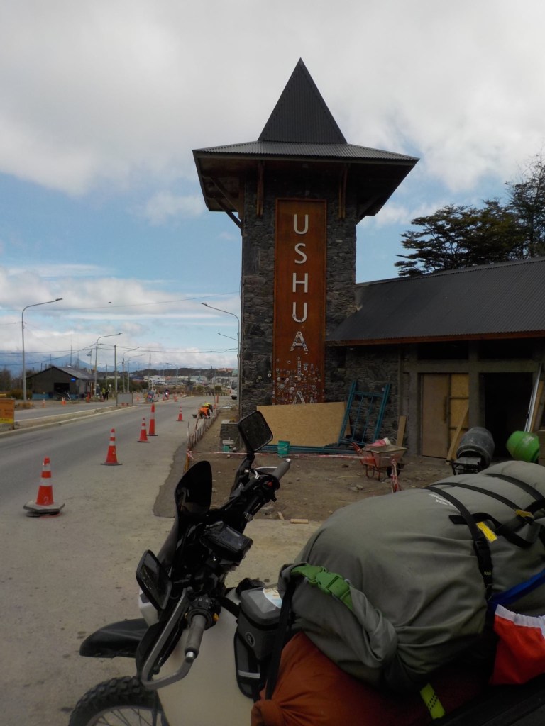 The final section of the road to Ushuaia is lined by peat bogs and red grasses and waterways with towering snow capped mountains in every direction you look – even for an Austrian an impressive view. We arrived at the iconic Ushuaia town entrance in light drizzling rain and the signs that everyone takes a picture with are being renovated 😉 but we still got our obligatory pictures and I did a little dance and we then found our bed and breakfast Isla Bella and negotiated to stay an extra two nights until Sunday – the bikes are parked in a courtyard off the street and the room is small but has a private bathroom and will be perfect for the next 4 days to recover, reorganise and get ready for the next section of our trip.