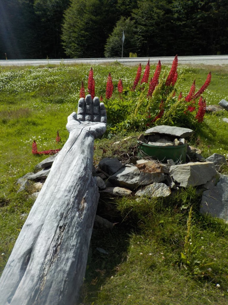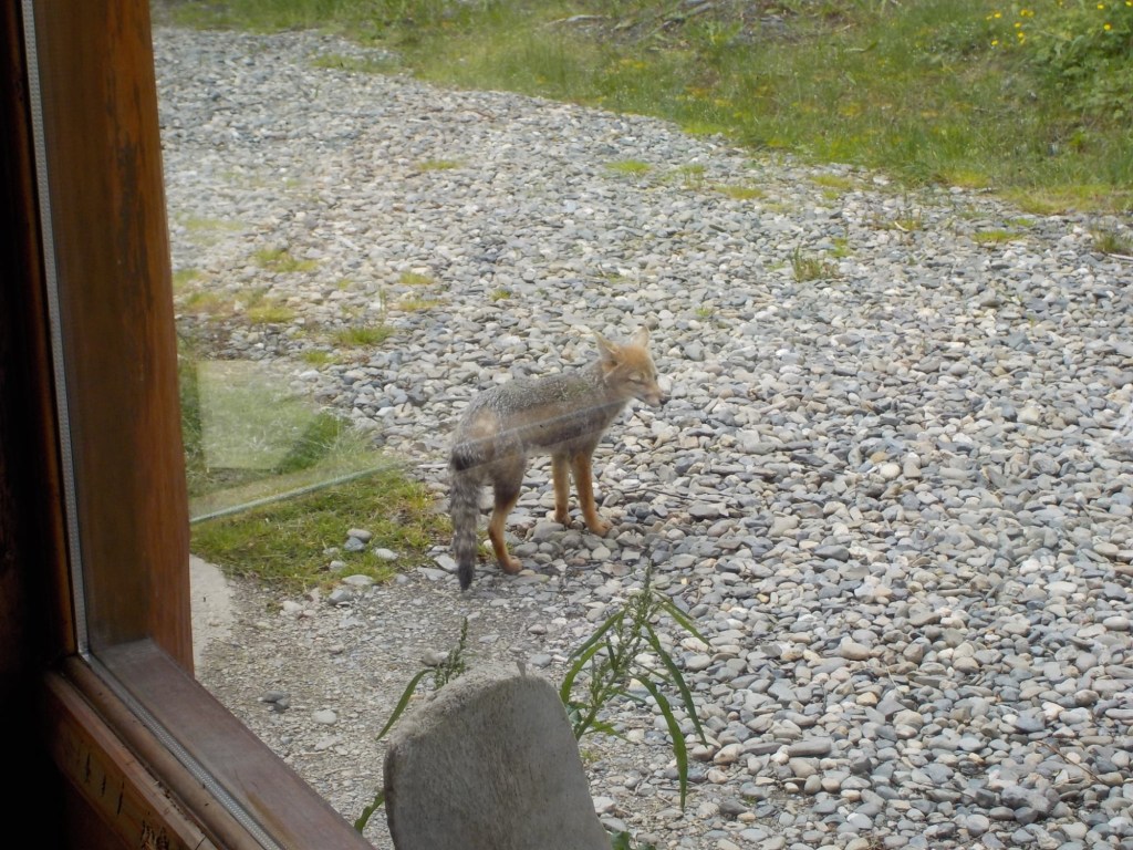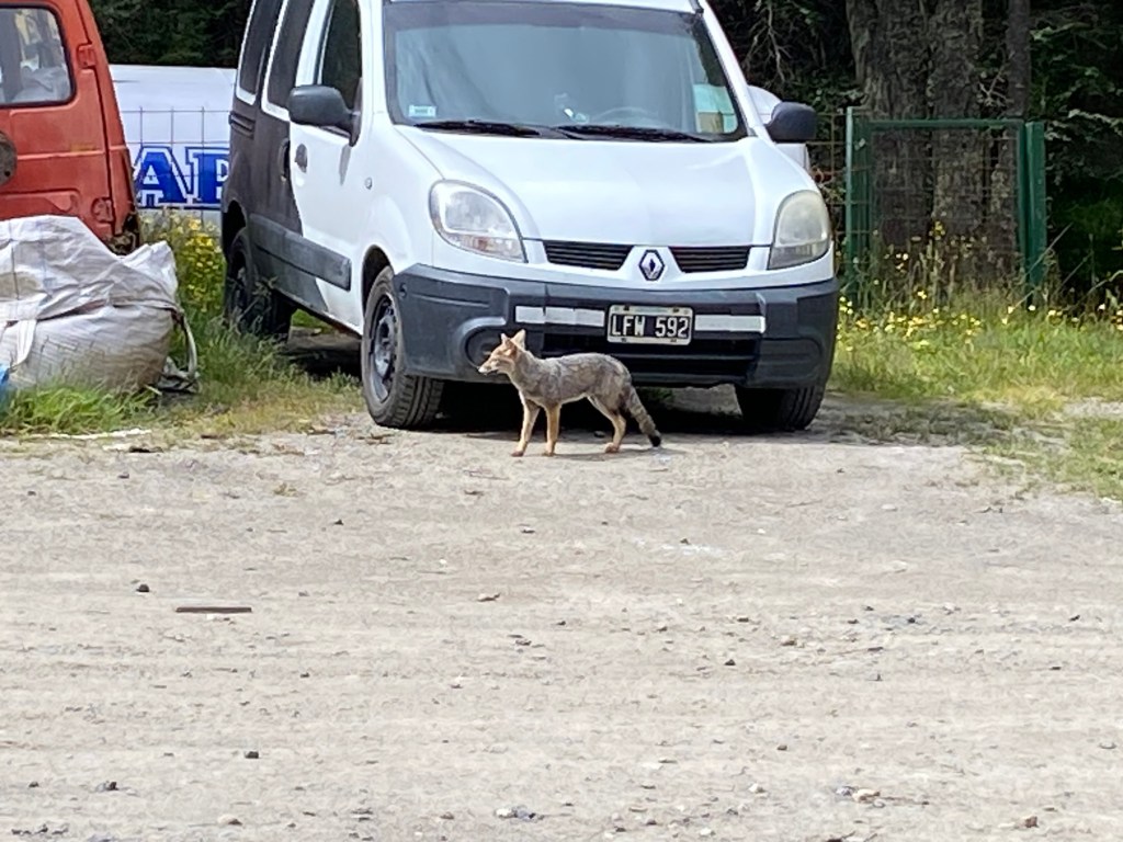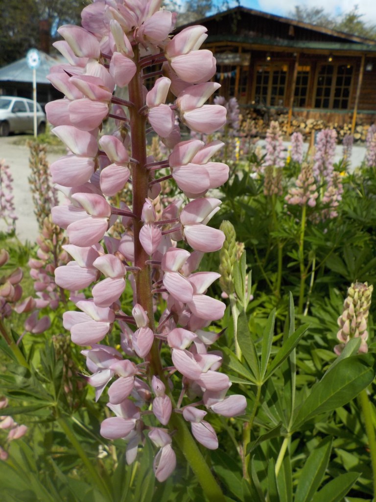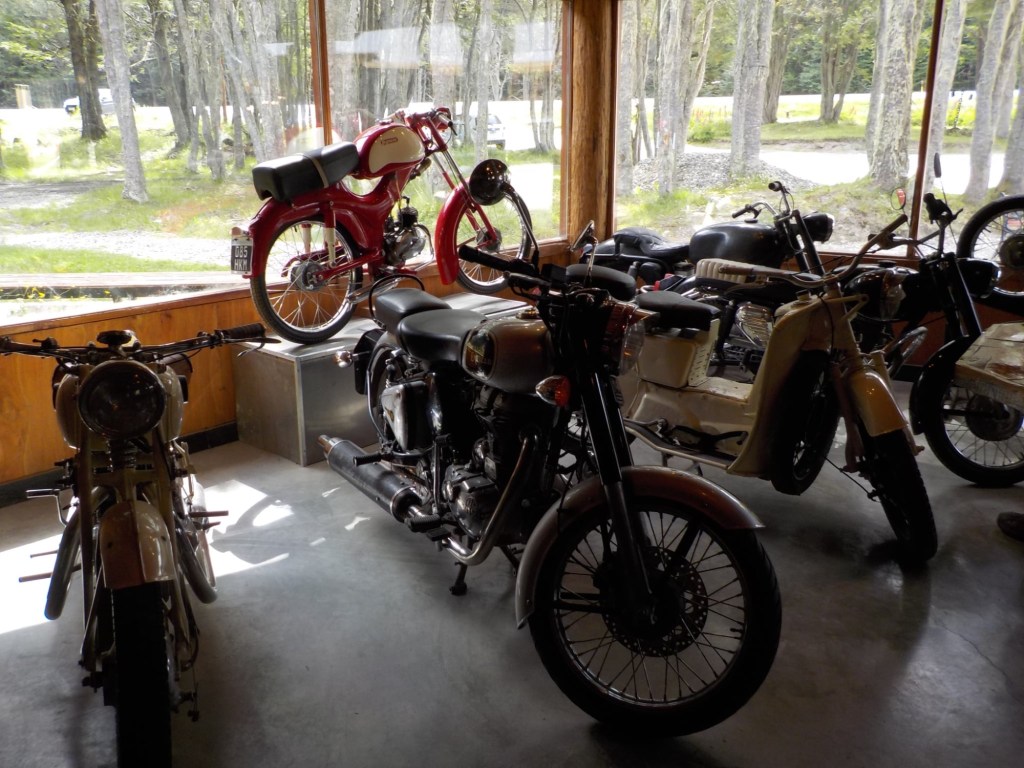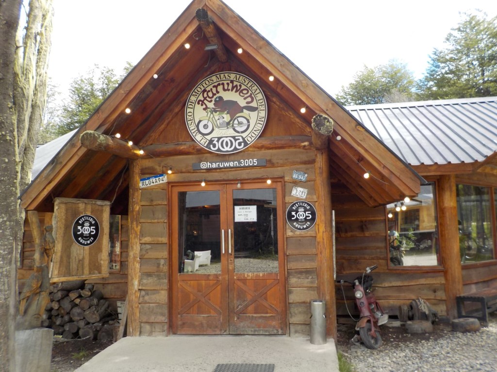 After packing the bikes and putting most of the warm layers of clothing we have with us on, we headed off riding along the entire lake Fagnano and took pictures at a look out where we also left one of our stickers on the sign. We continued on beautiful winding roads over the Garribaldi pass and stopped at the Haruwen motorcycle museum 3005 and moto-café where we had homemade empanadas and cake and a hot chocolate. Lupine flowers in 4 different colours (pink, purple, dark red, and yellow) are blooming everywhere as well as some dark blue corn flowers and we saw bumblebees and one South American gray fox (Lycalopex griseus) wandering around.