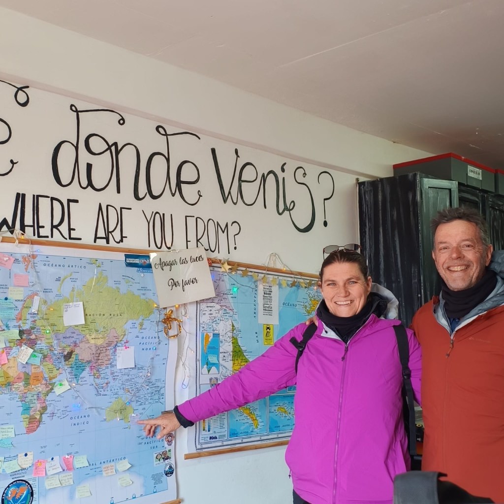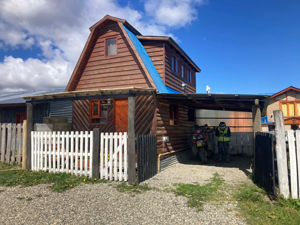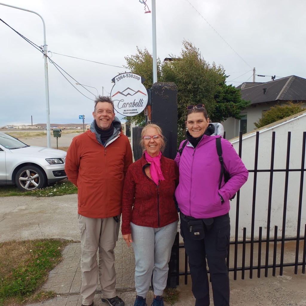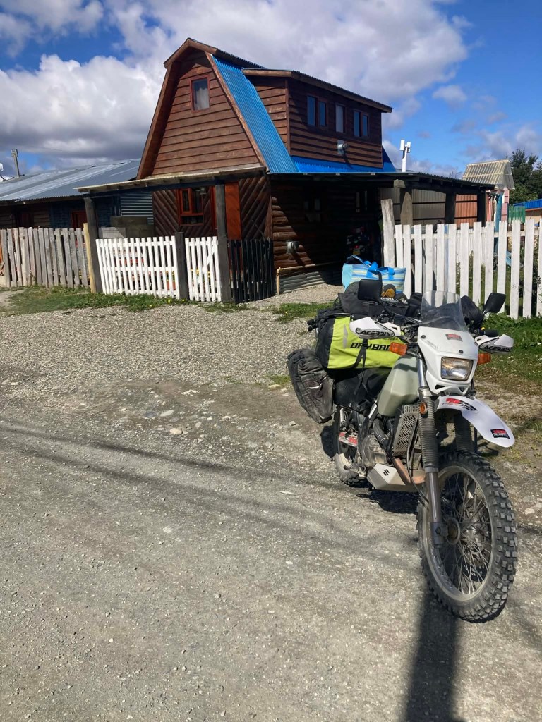 After a nice stay in an A frame house with the bikes under a car port we thought this should be an easy day of just 100km riding to Rio Grande where we again booked in the same place where we stayed on our way South where the bikes were securely parked in a garage and we had a view of the Rio Grande. Unfortunately, my cold was not any better and I had a terrible night having to get up every two hours and the bathroom was down a very steep wooden staircase and I was running a fever and had body aches and was just looking forward to get to Rio Grande where we could check in from 3pm. The ridiculous strong winds made the 100km feel like an eternity and when we got to Rio Grande I went to a pharmacy to get myself some paracetamol and then we did a bigger grocery shop at a “Carrefour” – which is a chain we used to have in Austria when I grew up and I stocked up on all essentials for camping and to treat my cold with salt for warm salty water gargling and a small jar of honey for tea with honey to soothe my throat. Then we looked for a place to have a good lunch but the place that had great reviews on the waterfront turned out to be a street vendor shack which was closed – so we looked for another place for lunch near by and ended up in a place that seems to mostly do catering – all we could get there was a ham and cheese croissant heated up and no hot drinks or any cold drinks other than wine were available – we then headed to the accommodation – I just had enough strengths left to get my stuff off the bike and we both lied down for a siesta with the wind howling outside – we woke up at dinner time but decided not to go out and just had soup and avocado sandwich downstairs and got to know our host María a little bit better. We decided to stay an extra night for me to get better and not to travel in high winds again – we moved into the full apartment style room in the morning which was amazing and then headed to town for a nice lunch at place recommended by our host called “Tante Sara” where we had our first meal in a few days. We headed back to our apartment, took pictures with our lovely host María and planned the next part of the trip including fuel stops and filled in our customs declaration for the border crossing into Chile the next day. I had more tea with honey and salt water gargles for my throat and steam inhalations and we tried to catch up on our blog as well, knowing that we would head into the remote areas and camping for a few days as we wanted to see the only king penguin colony in South America which we had managed to get a booking for a one hour tour on Feb 12 and we were going to camp at a private campground in Camerón which is 35 km past the penguin reserve on a dirt road 😉👍🏕️🏍🏍