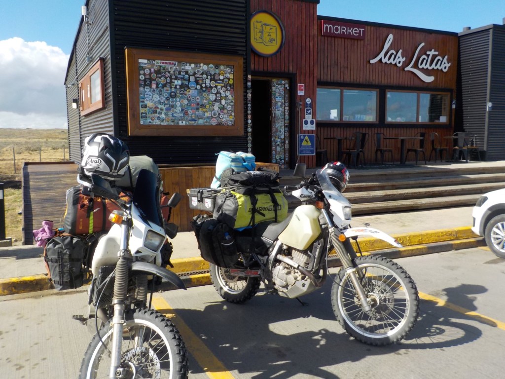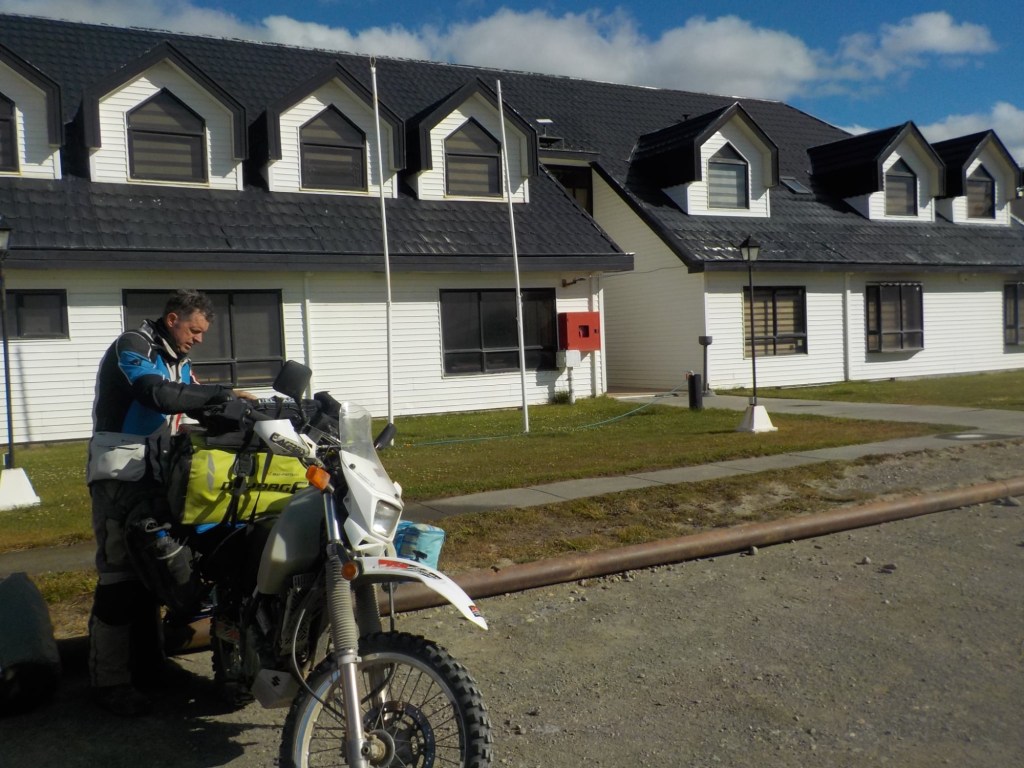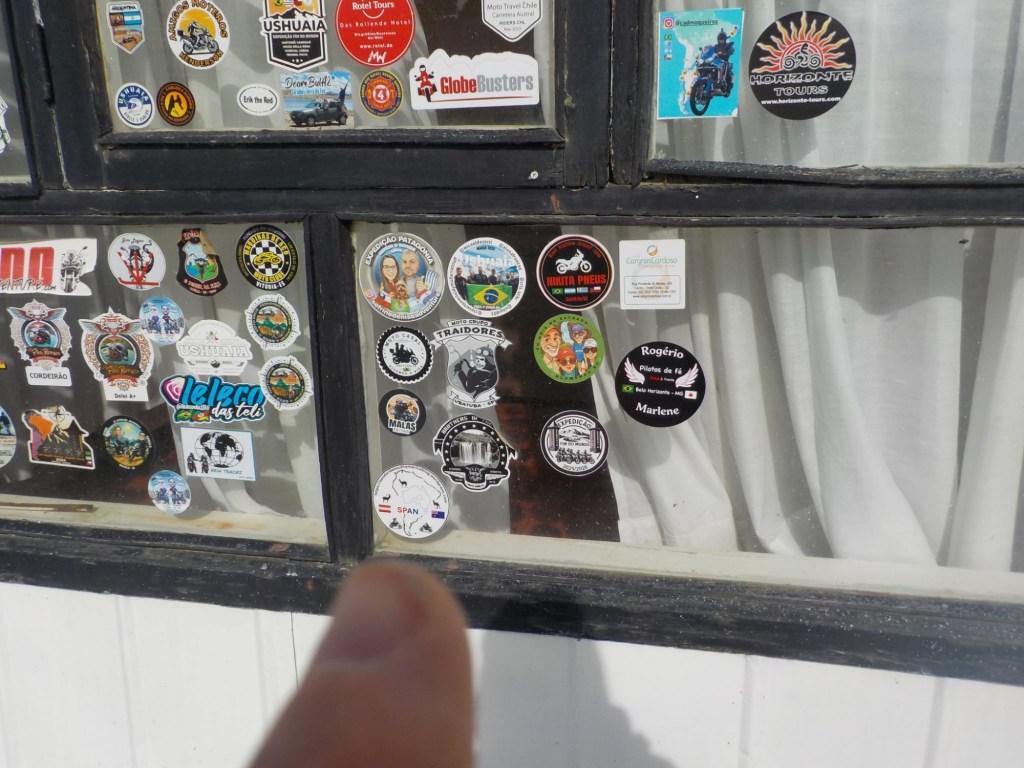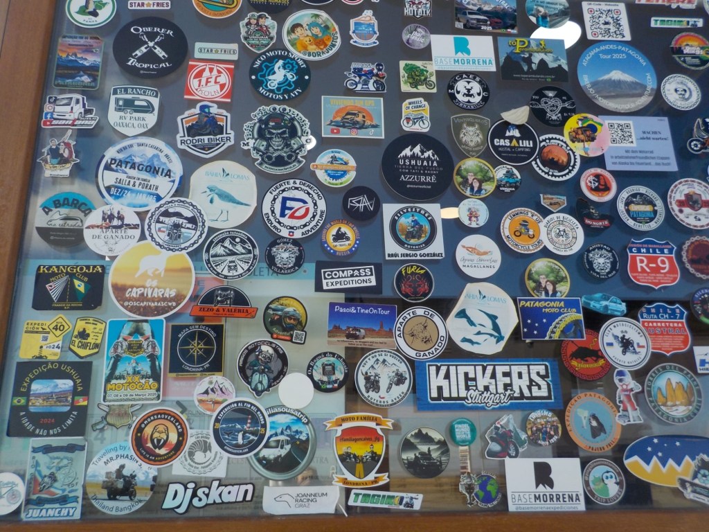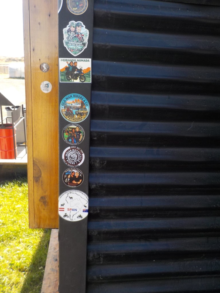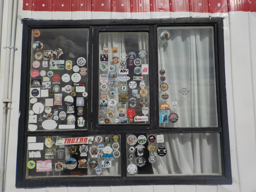The morning was wet and foggy and after a good breakfast – the waiter had found a jar of honey for me and then packed up rolls with ham and cheese for us and some fruit for our long trip which was very kind. When we checked out, we each got some Happy Valentine’s sweet treats which was a very nice touch. Andrew checked and inflated the tyres, I placed one of our stickers on the building next to the hotel which had interesting paintings on it and we lubed the chains and got ready for the long trip (358km) with strong wind forecast and a ferry ride across the Straight of Magellan ahead of us. We arrived at the end of the road at Bahia Azul and joined the queue for the ferry. Unfortunately, we did not make it onto the first one and had to wait until the second ferry arrived out in the freezing wind and we were told that you pay on the ferry but there were no signs how much the price was for motorcycles. The ferry is a drive through barge – much smaller than the one we took from Punta Arenas to Povenir. We rode on and got directed where to park the bikes – right behind a truck and the lane was filled up behind us with cars. The barge took off and the boat was rocking so much that Andrew was worried my bike that was in gear and on the side stand would tip over. He could not get off his bike as he could not get his side stand down – a recurring issue because the bike is so heavily loaded that the suspension is so low he can only park the bike if the road is sloping down at the side of his side stand – often he can’t get off at petrol stations but the attendants seem to be happy to fuel the bikes when you are sitting on them. So I got off my bike trying to find where to pay – there was a long queue, the boat was rocking and a gale- forced wind was blowing – I eventually got to the door which you had to enter into a small inside area where I had to pay cash – it was 9,000 Chilean pesos per bike. I paid, got a ticket with a bar code and just made it back to the bike when we had reached the shore and where about to disembark – I never get sea sick but I was close to it on this ferry crossing – the disembarking was interesting too with a very steep ramp to negotiate – we continued on Ruta 255 and stopped for a lunch break at the same place we had stopped on our way into Punta Arenas at San Gregoria – a ghost town with the shipwreck of the Amadeo steamship – we ate our bread rolls and Valentine’s treats and saw rain clouds ahead 😳. We continued on and got petrol at Puerto Sara and then the weather deteriorated – with rain squalls that felt like sleet and wind gusts of up to 53 km from the left that pommeled you around and then the spray and turbulent air from the trucks going the other way – it was turning into a real mind over matter continuing riding and trying to get through it – by the way what were you doing on Valentine’s Day? 😂 – put it in the comments and let us know 👍😉🤗 Still, I would not have wanted to be out there facing one of the toughest days riding with anyone else than my darling Andrew 🥰❤️ – we slowed down and rode to conditions even when that meant only doing 60km/hr at times – we had the accommodation booked in Puerto Natales and it did not matter what time we got there as they left the key in the door for us. We filled up one more time at Ruta 9 Norte where the sun had come out again and we ate some hot empanadas and I placed another one of our stickers and found one on the window from “compass expeditions” 😉👍 We got ready for the last 198km of the trip – Andrew was leading and after crossing the first huge valley with ridiculous cross winds, the sunlight was golden, the vegetation had changed and looked more like near Ushuaia with trees full of lichens and the mountain ranges in the distance covered in snow were greeting us – maybe it was the fever and exhaustion at this stage, but it was so beautiful and I really enjoyed the dramatic landscapes and skies with more rain clouds looming and the sun rays filtering through the dark rain clouds. We rode into Puerto Natales exhausted, cold and tired but glad we made it – a Valentine’s Day to remember 😂🥰❤️🏍🏍