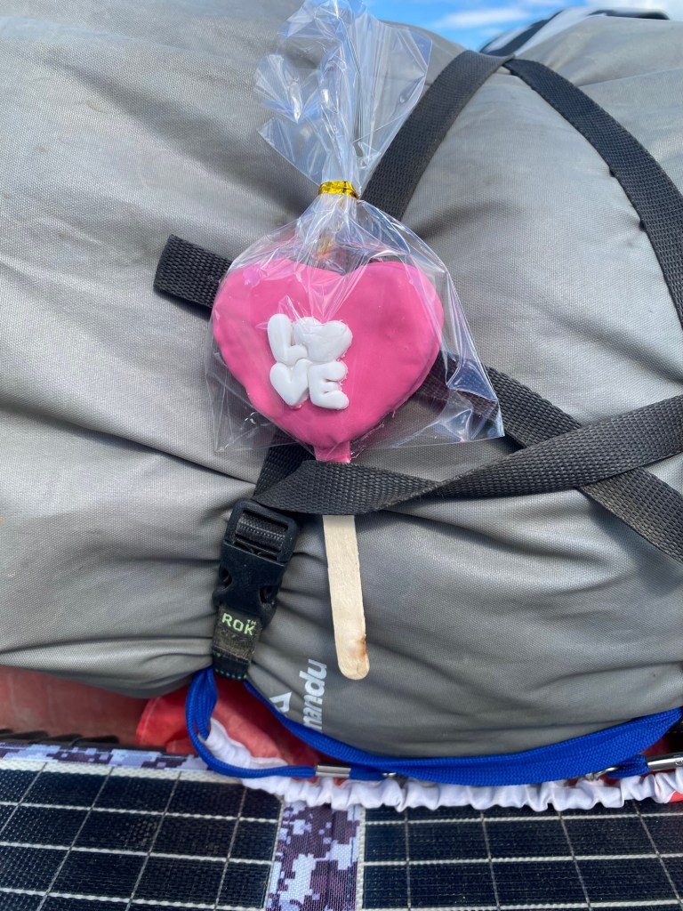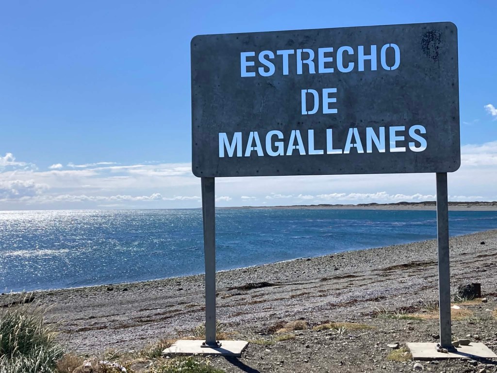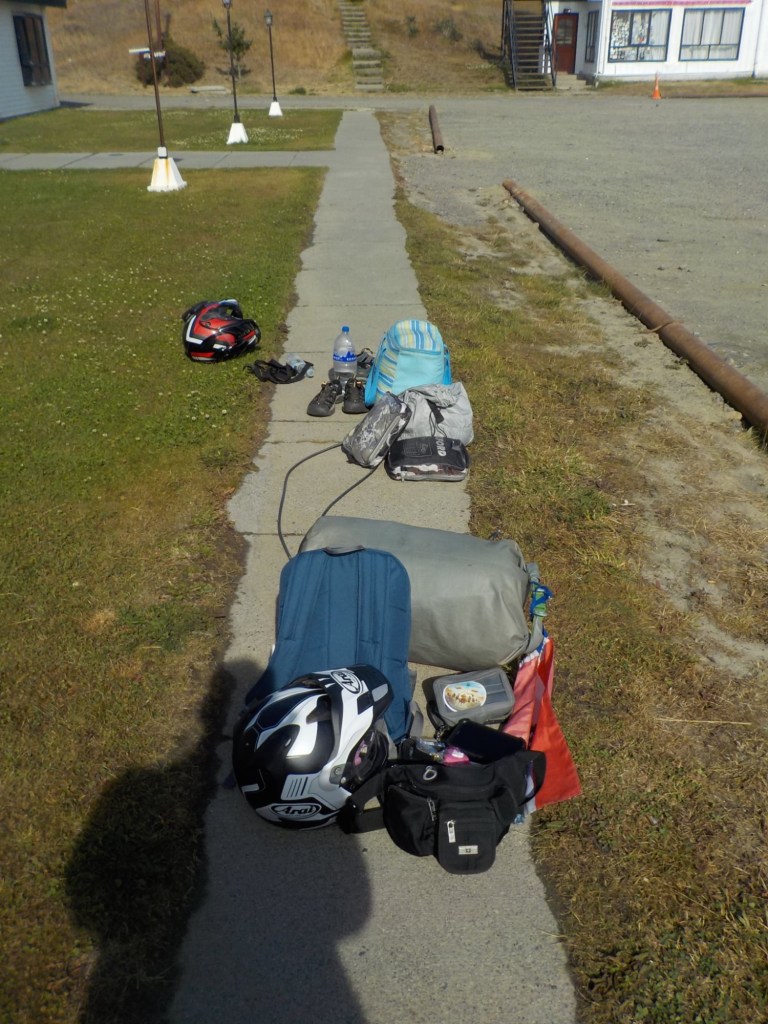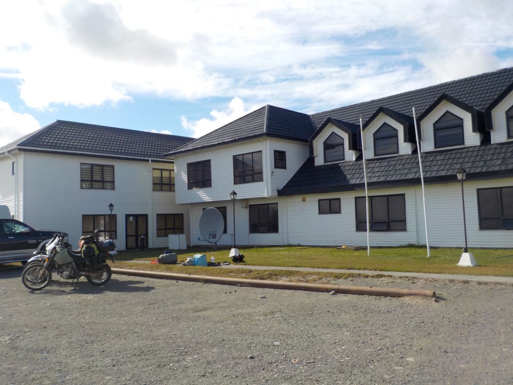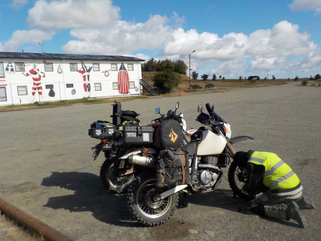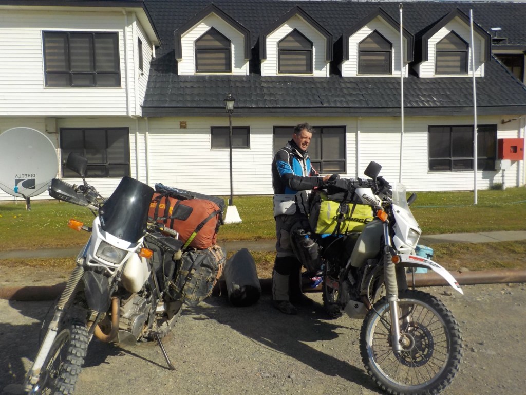 The morning was wet and foggy and after a good breakfast – the waiter had found a jar of honey for me and then packed up rolls with ham and cheese for us and some fruit for our long trip which was very kind. When we checked out, we each got some Happy Valentine’s sweet treats which was a very nice touch. Andrew checked and inflated the tyres, I placed one of our stickers on the building next to the hotel which had interesting paintings on it and we lubed the chains and got ready for the long trip (358km) with strong wind forecast and a ferry ride across the Straight of Magellan ahead of us. We arrived at the end of the road at Bahia Azul and joined the queue for the ferry. Unfortunately, we did not make it onto the first one and had to wait until the second ferry arrived out in the freezing wind and we were told that you pay on the ferry but there were no signs how much the price was for motorcycles. The ferry is a drive through barge – much smaller than the one we took from Punta Arenas to Povenir. We rode on and got directed where to park the bikes – right behind a truck and the lane was filled up behind us with cars. The barge took off and the boat was rocking so much that Andrew was worried my bike that was in gear and on the side stand would tip over. He could not get off his bike as he could not get his side stand down – a recurring issue because the bike is so heavily loaded that the suspension is so low he can only park the bike if the road is sloping down at the side of his side stand – often he can’t get off at petrol stations but the attendants seem to be happy to fuel the bikes when you are sitting on them. So I got off my bike trying to find where to pay – there was a long queue, the boat was rocking and a gale- forced wind was blowing – I eventually got to the door which you had to enter into a small inside area where I had to pay cash – it was 9,000 Chilean pesos per bike. I paid, got a ticket with a bar code and just made it back to the bike when we had reached the shore and where about to disembark – I never get sea sick but I was close to it on this ferry crossing – the disembarking was interesting too with a very steep ramp to negotiate – we continued on Ruta 255 and stopped for a lunch break at the same place we had stopped on our way into Punta Arenas at San Gregoria – a ghost town with the shipwreck of the Amadeo steamship – we ate our bread rolls and Valentine’s treats and saw rain clouds ahead 😳. We continued on and got petrol at Puerto Sara and then the weather deteriorated – with rain squalls that felt like sleet and wind gusts of up to 53 km from the left that pommeled you around and then the spray and turbulent air from the trucks going the other way – it was turning into a real mind over matter continuing riding and trying to get through it – by the way what were you doing on Valentine’s Day? 😂 – put it in the comments and let us know 👍😉🤗 Still, I would not have wanted to be out there facing one of the toughest days riding with anyone else than my darling Andrew 🥰❤️ – we slowed down and rode to conditions even when that meant only doing 60km/hr at times – we had the accommodation booked in Puerto Natales and it did not matter what time we got there as they left the key in the door for us. We filled up one more time at Ruta 9 Norte where the sun had come out again and we ate some hot empanadas and I placed another one of our stickers and found one on the window from “compass expeditions” 😉👍 We got ready for the last 198km of the trip – Andrew was leading and after crossing the first huge valley with ridiculous cross winds, the sunlight was golden, the vegetation had changed and looked more like near Ushuaia with trees full of lichens and the mountain ranges in the distance covered in snow were greeting us – maybe it was the fever and exhaustion at this stage, but it was so beautiful and I really enjoyed the dramatic landscapes and skies with more rain clouds looming and the sun rays filtering through the dark rain clouds. We rode into Puerto Natales exhausted, cold and tired but glad we made it – a Valentine’s Day to remember 😂🥰❤️🏍🏍