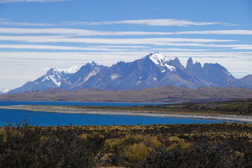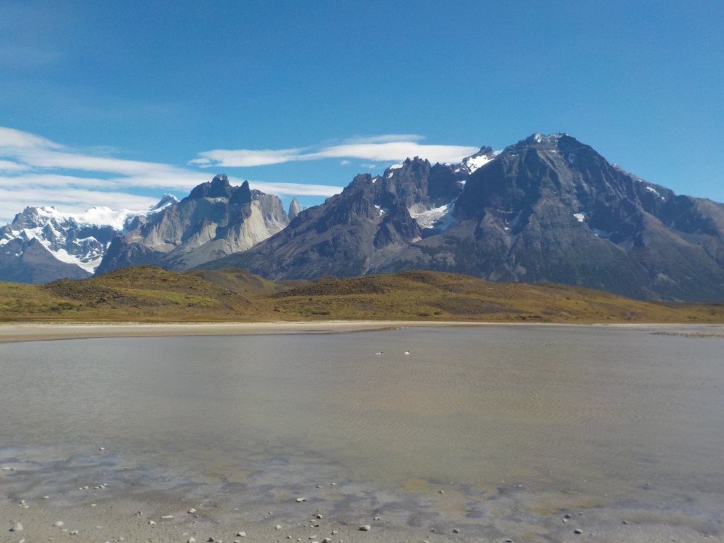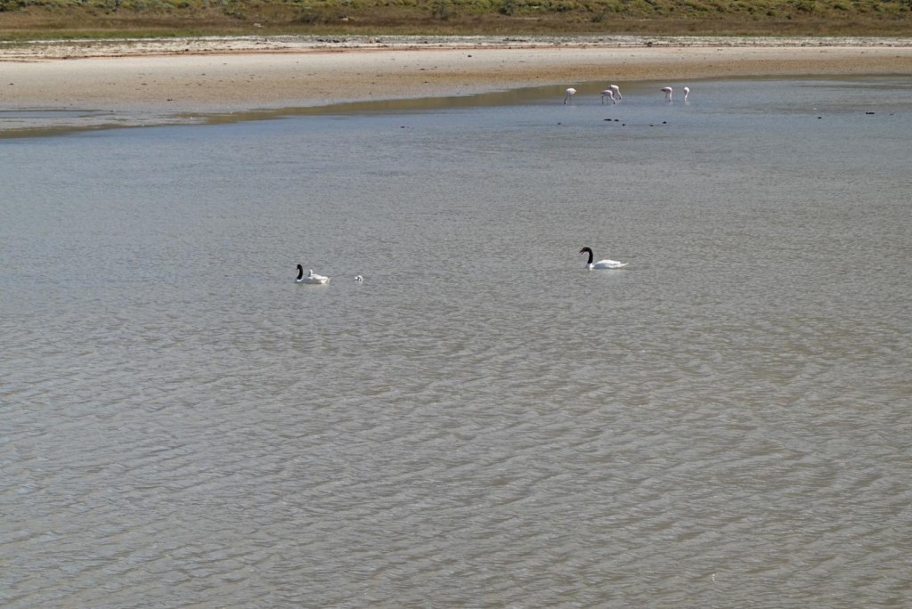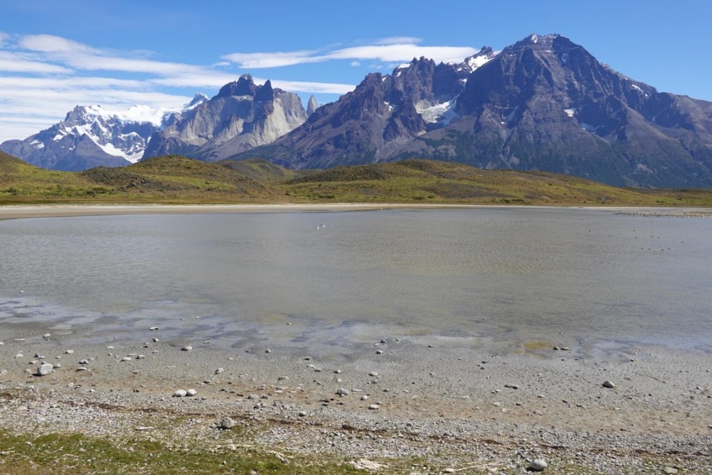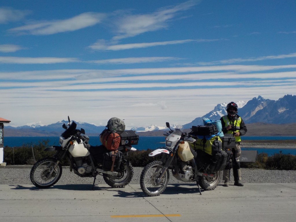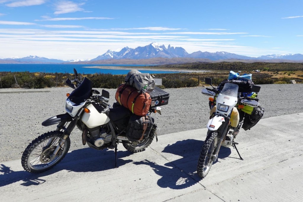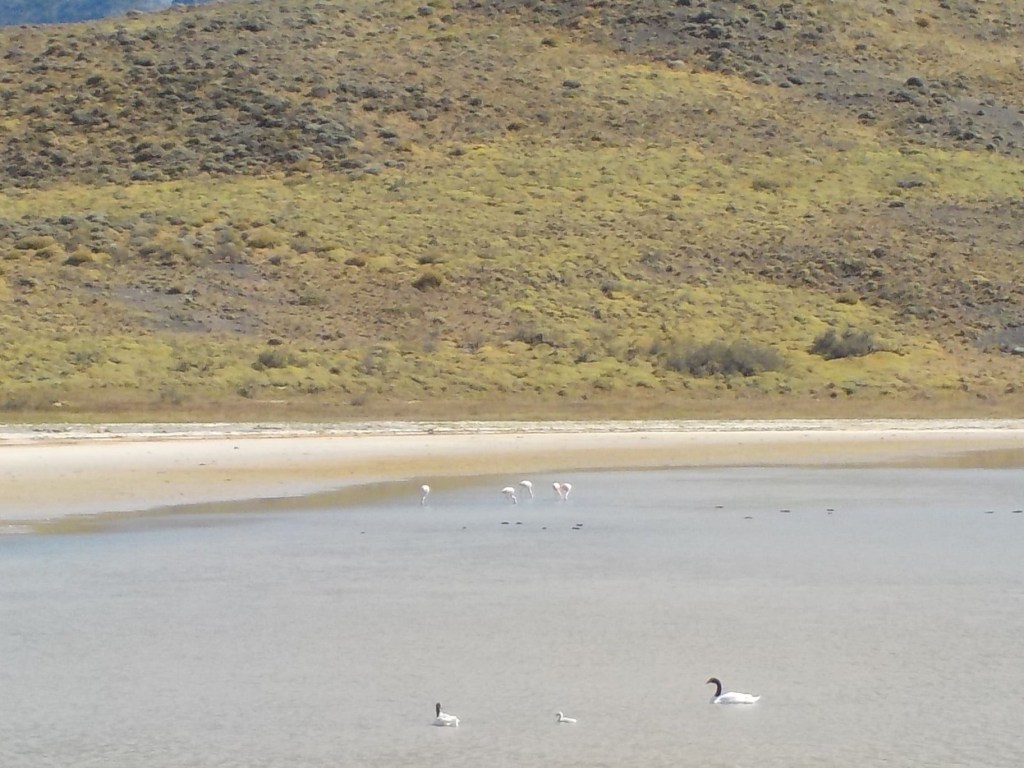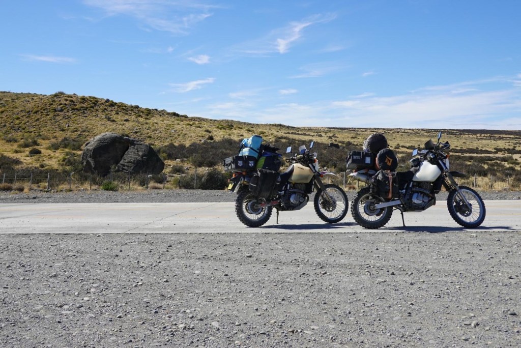 We packed up everything and it was hard to leave as we have come to like that marvellous view of the mountain peaks. We rode through the National Park North on a very corrugated dirt road (Y-150) that shook our motorcycles to pieces and through parts of the park we had not yet seen. We came past Laguna de los Cisnes, where we saw pink flamingoes (my absolute favourite birds of Patagonia ❤️🦩) in the far distance as well as black-necked swans (Cygnus melancoryphus) with cygnets.