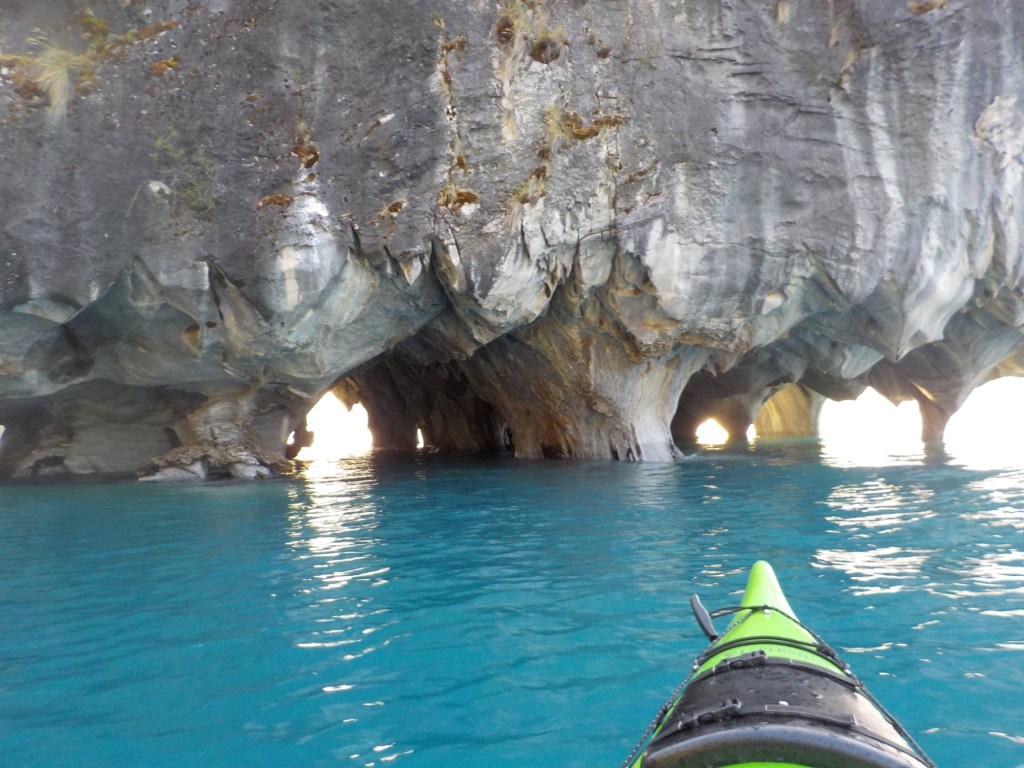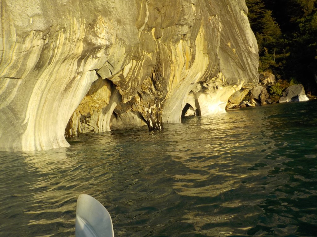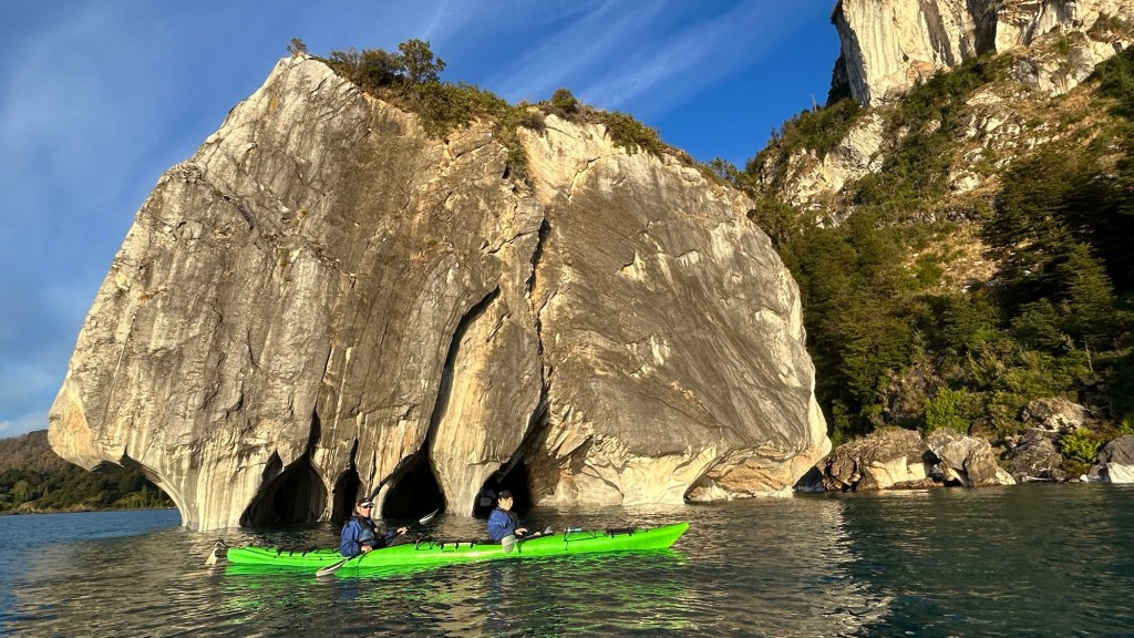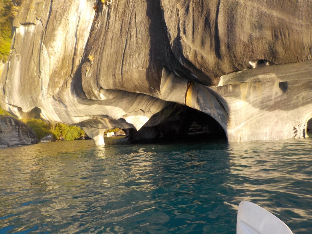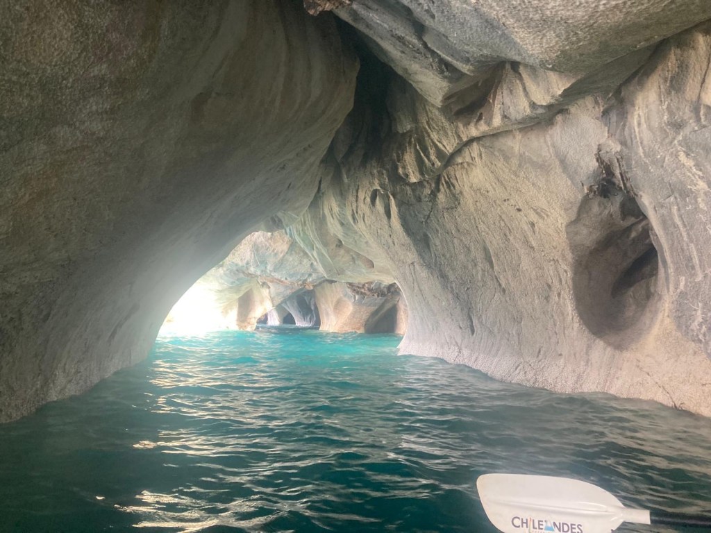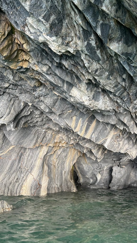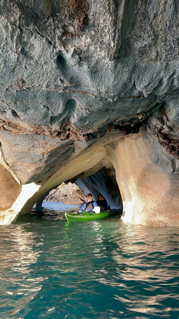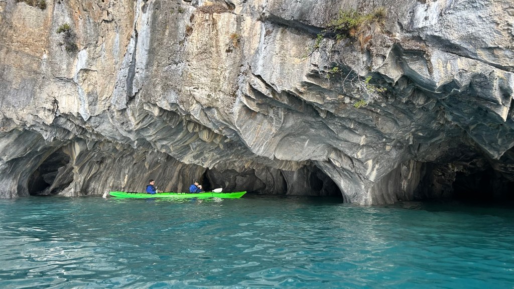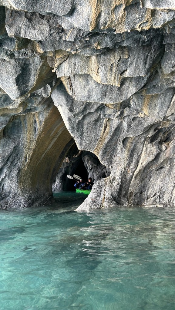 After taking a few pictures, we continued to the next structure called “cathedral” because it is a larger formation than the “chapel”. The shorter tours only make it to these two structures and our tour provider is the only one that offers the longer 5 hour tour to the caves which are further away. We paddled to the caves where we were allowed to paddle into dead end caves, through tunnels and get really close to the marble rock. There were stalactites hanging from the roof and it was amazing to be able to get that close and manoeuvre an almost 6 m long kayak through the narrow passages. As a bonus, Matías pointed out a condor nesting in the sheer cliff face high above the lake, some rock formations in the shape of various animals (a Labrador, a seal and an elephant) and a large white rock that had recently broken off and fallen into the lake . We paddled back and now several small tour boats were at the cathedral and chapel as well as groups of other kayakers and we were glad to have been there early to gave it all to ourselves. We marvelled over the amazing marble structures one more time before heading back to shore. It was such a great experience – yet another highlight of our trip and Matías had so many stories and gave us some great recommendations for good places to eat in town. Both of our legs felt like jelly and we had to get our land legs back when we got out of the kayak 😂