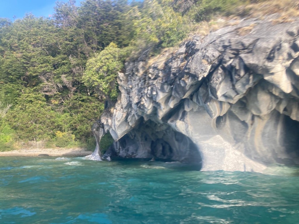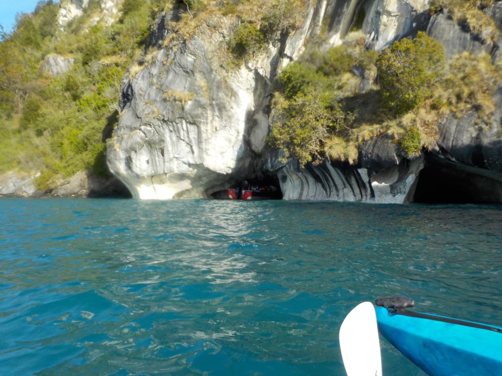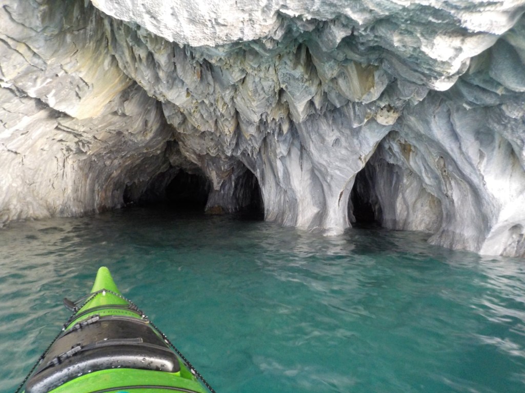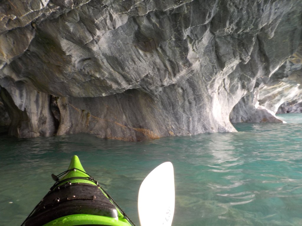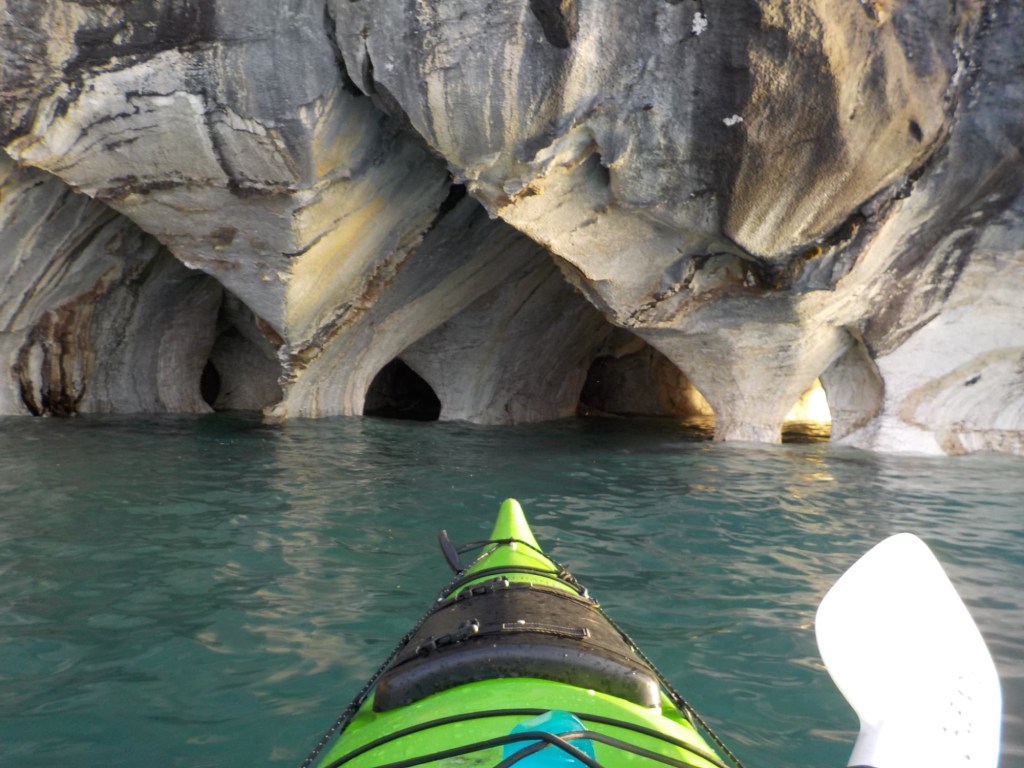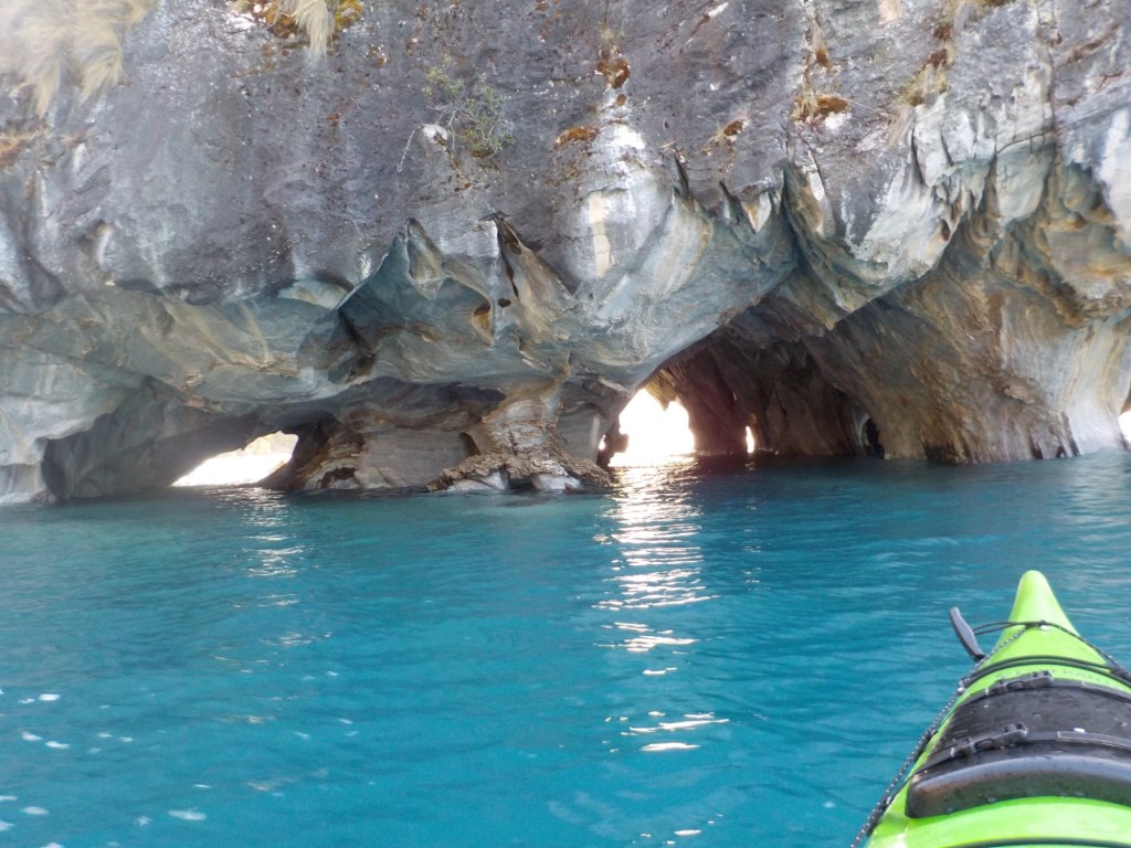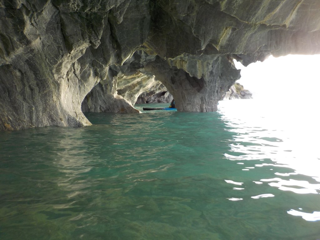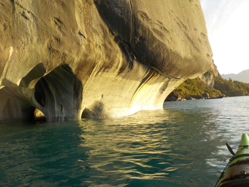 After taking a few pictures, we continued to the next structure called “cathedral” because it is a larger formation than the “chapel”. The shorter tours only make it to these two structures and our tour provider is the only one that offers the longer 5 hour tour to the caves which are further away. We paddled to the caves where we were allowed to paddle into dead end caves, through tunnels and get really close to the marble rock. There were stalactites hanging from the roof and it was amazing to be able to get that close and manoeuvre an almost 6 m long kayak through the narrow passages. As a bonus, Matías pointed out a condor nesting in the sheer cliff face high above the lake, some rock formations in the shape of various animals (a Labrador, a seal and an elephant) and a large white rock that had recently broken off and fallen into the lake . We paddled back and now several small tour boats were at the cathedral and chapel as well as groups of other kayakers and we were glad to have been there early to gave it all to ourselves. We marvelled over the amazing marble structures one more time before heading back to shore. It was such a great experience – yet another highlight of our trip and Matías had so many stories and gave us some great recommendations for good places to eat in town. Both of our legs felt like jelly and we had to get our land legs back when we got out of the kayak 😂