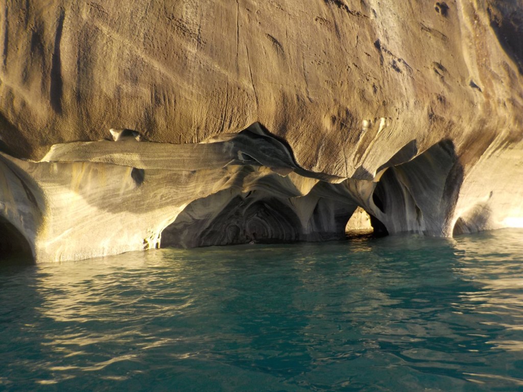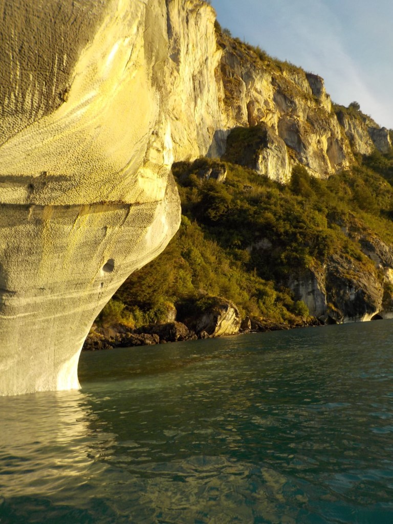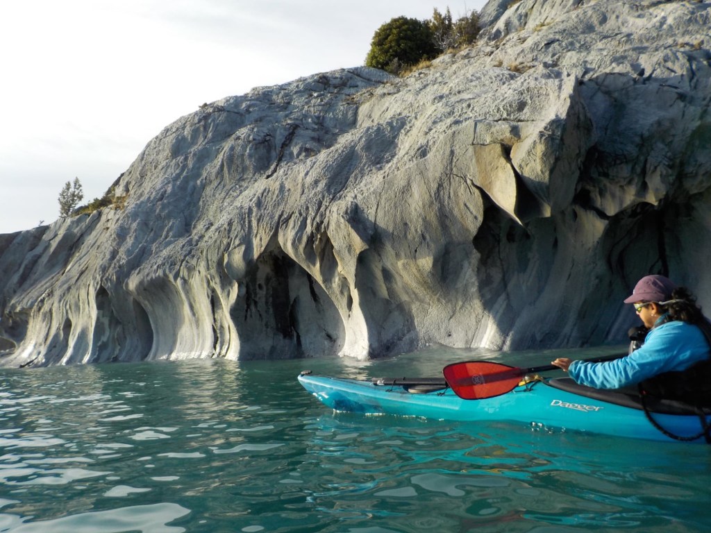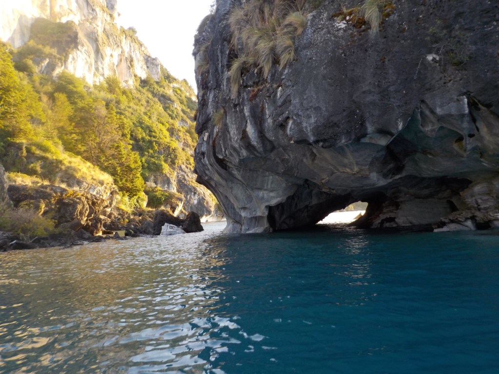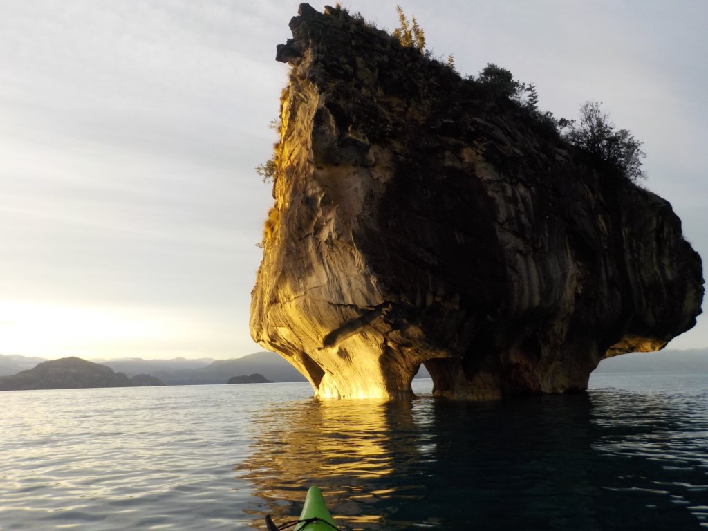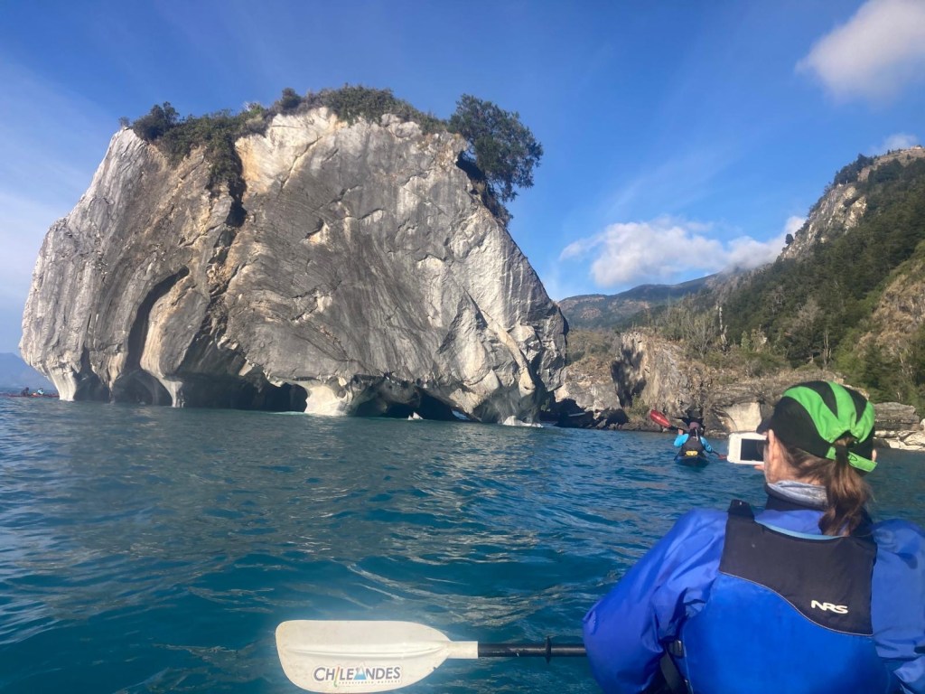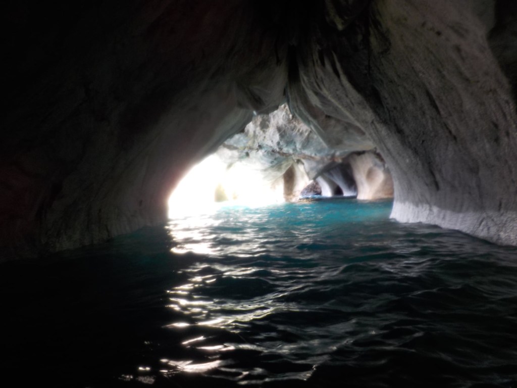 After taking a few pictures, we continued to the next structure called “cathedral” because it is a larger formation than the “chapel”. The shorter tours only make it to these two structures and our tour provider is the only one that offers the longer 5 hour tour to the caves which are further away. We paddled to the caves where we were allowed to paddle into dead end caves, through tunnels and get really close to the marble rock. There were stalactites hanging from the roof and it was amazing to be able to get that close and manoeuvre an almost 6 m long kayak through the narrow passages. As a bonus, Matías pointed out a condor nesting in the sheer cliff face high above the lake, some rock formations in the shape of various animals (a Labrador, a seal and an elephant) and a large white rock that had recently broken off and fallen into the lake . We paddled back and now several small tour boats were at the cathedral and chapel as well as groups of other kayakers and we were glad to have been there early to gave it all to ourselves. We marvelled over the amazing marble structures one more time before heading back to shore. It was such a great experience – yet another highlight of our trip and Matías had so many stories and gave us some great recommendations for good places to eat in town. Both of our legs felt like jelly and we had to get our land legs back when we got out of the kayak 😂