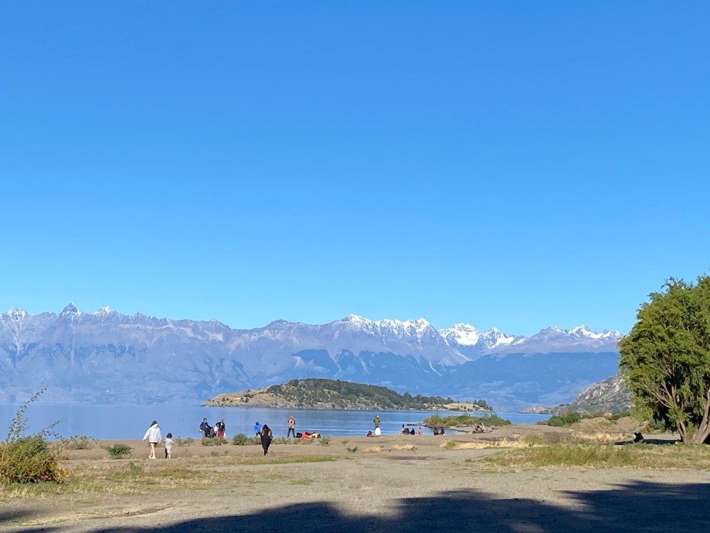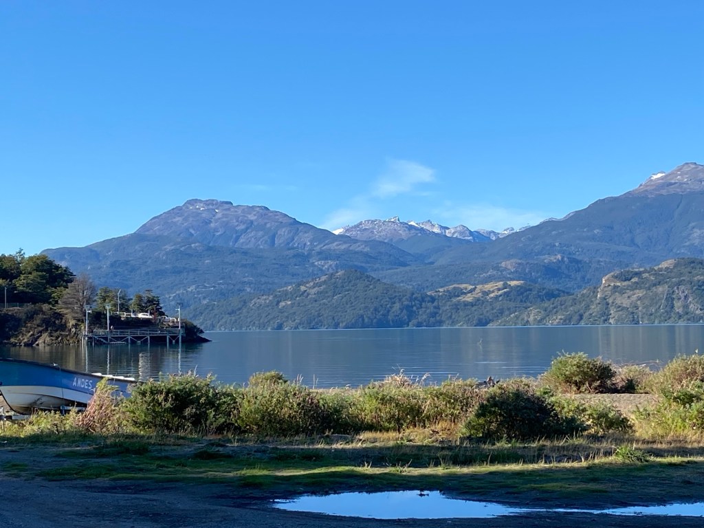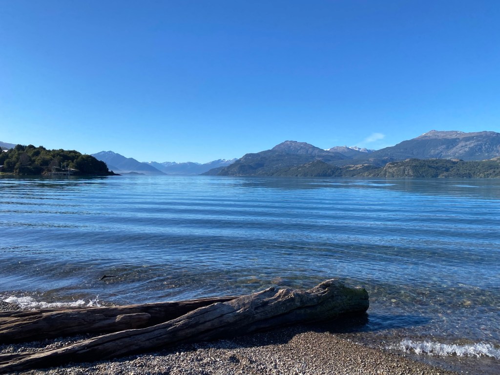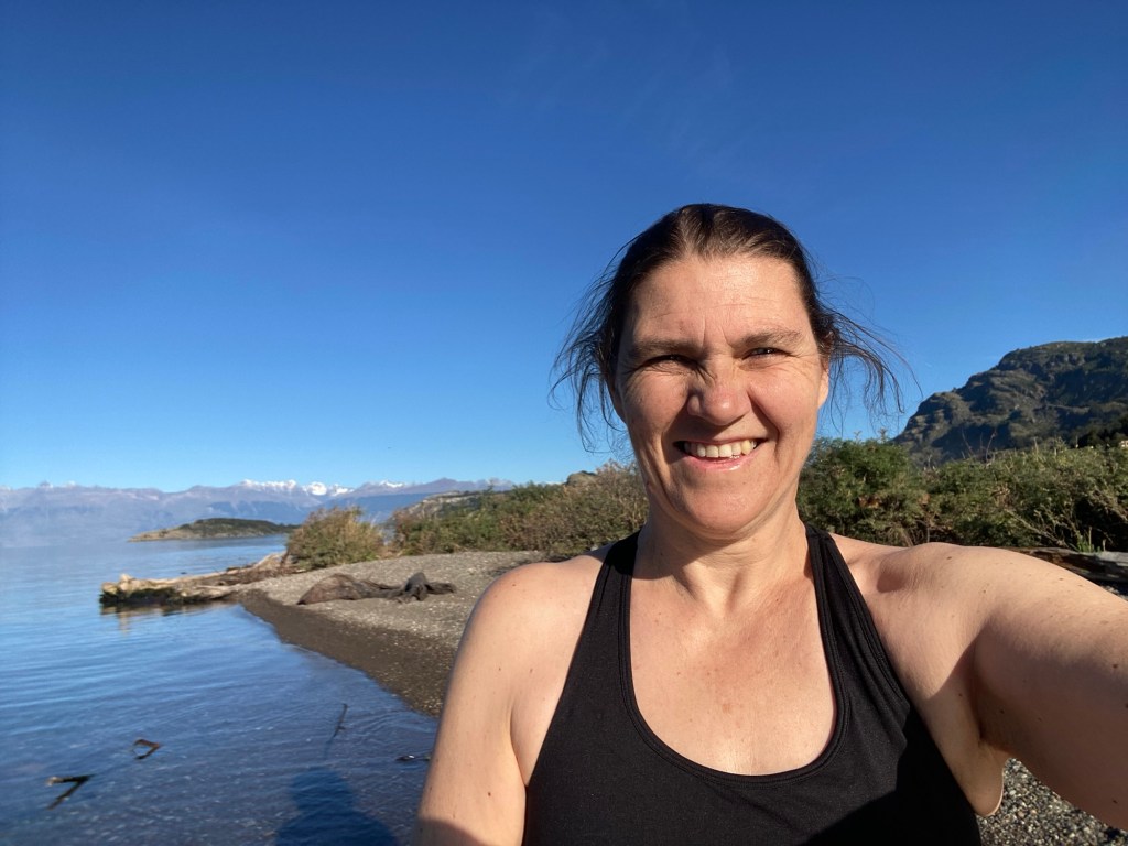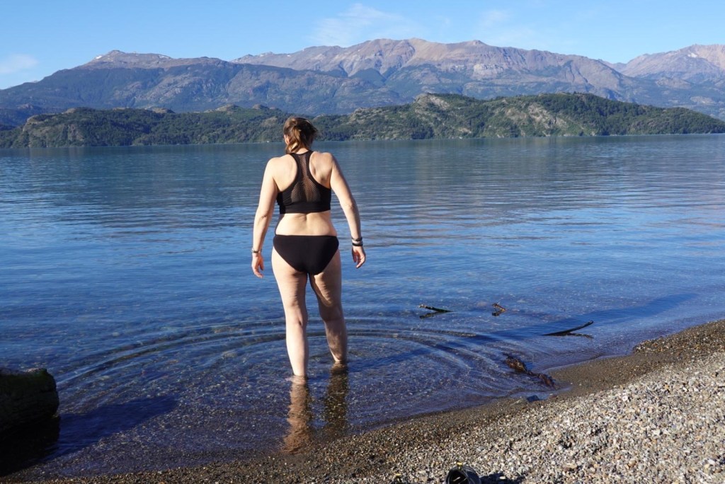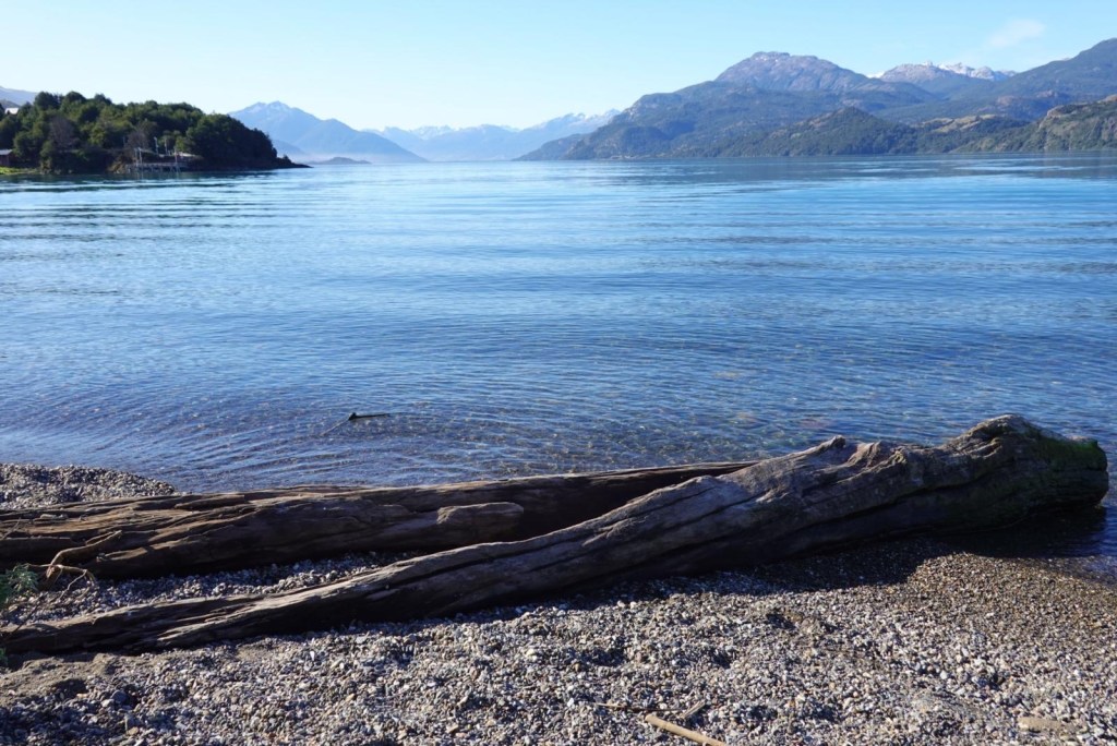 We had a rest in our Cabana before heading into town for lunch at one of the places Matías had recommended. We then shopped for some groceries and fruit for our next camping stay. The day was so lovely warm and sunny and totally wind still that we went to the lake shore and sat by the water enjoying the views of the surrounding snow and glacier covered mountains. I had to take most of my clothes off and at least get my legs wet 😉😂 in the water and a dog came over to see what was going on.