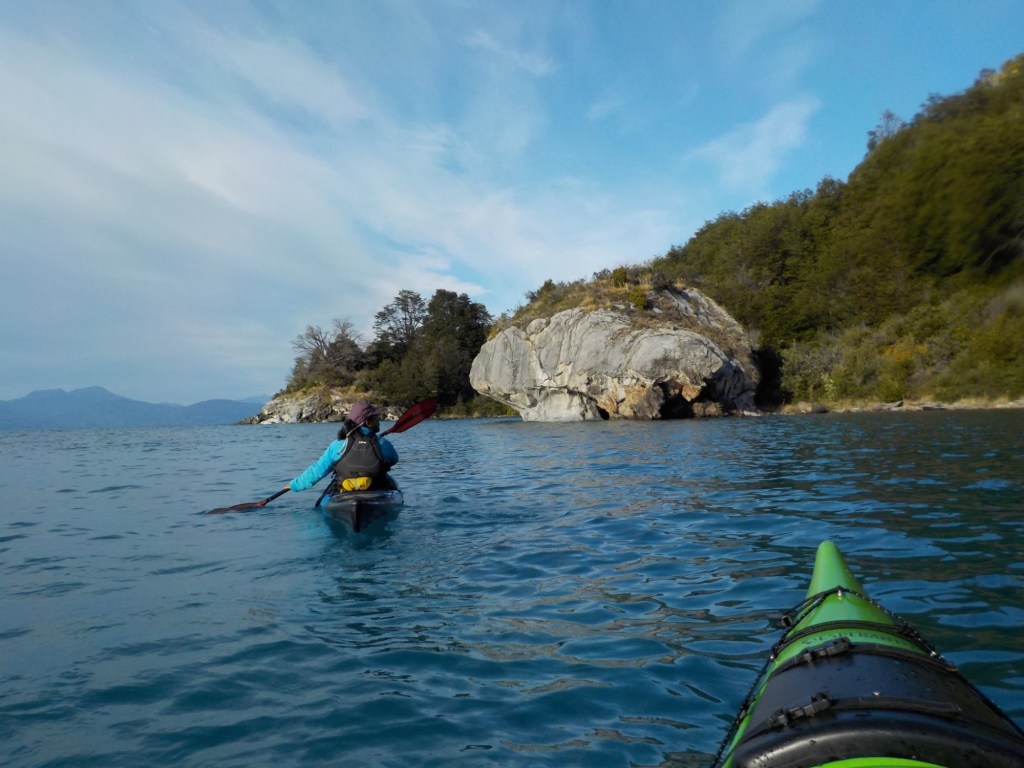 We drove for -20 minutes in his car to the bay where all the kayaks were stored and we geared up into the neoprene skirt, waterproof jacket and life jacket he provided at the car before walking down to the lake shore as the sun rose. We chose a double kayak (a Boréal designed Esperanto heavy duty kayak of 5.91m lengths, weighing 51 kilos) and after being shown how to hold the paddles, we hopped in the kayak and were the first kayaking group to head off. We followed Matías out of the sheltered bay. We had booked the tour after consulting the weather forecast on a day where there was hardly any wind forecast. The lake was flat like a mirror and we headed straight to the first formation known as the “chapel” due to the pointed top (I leave it to your imagination what it looks like 😉)