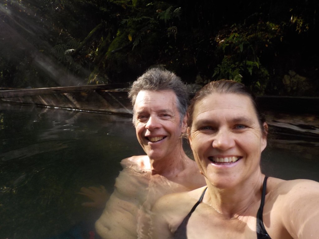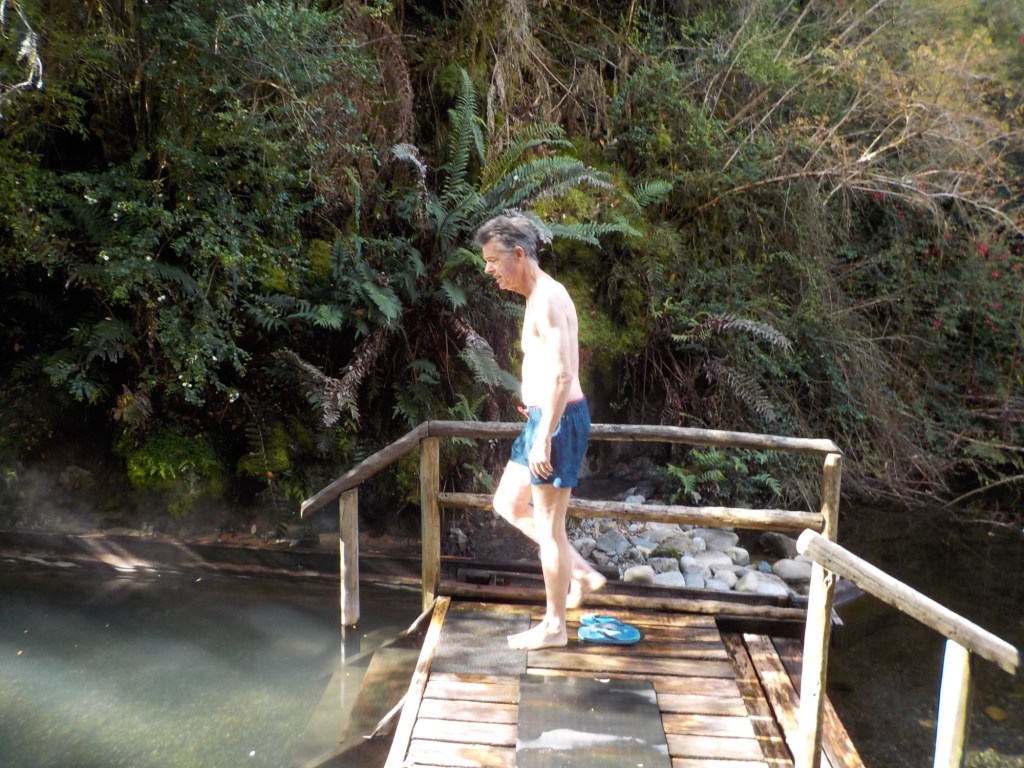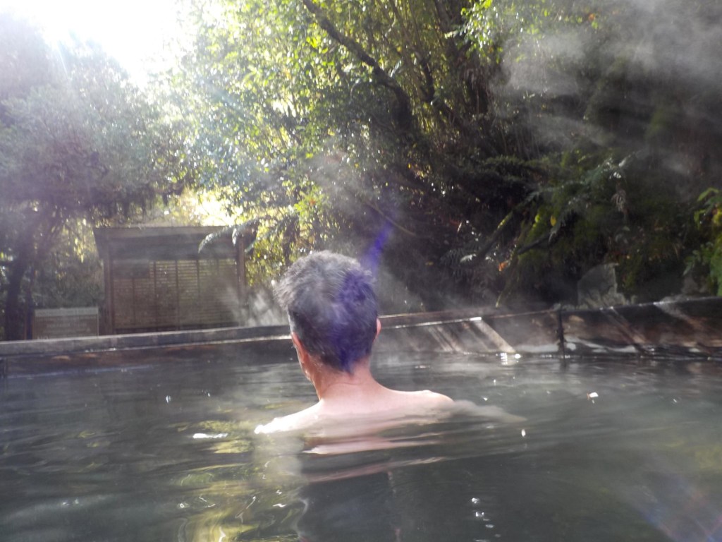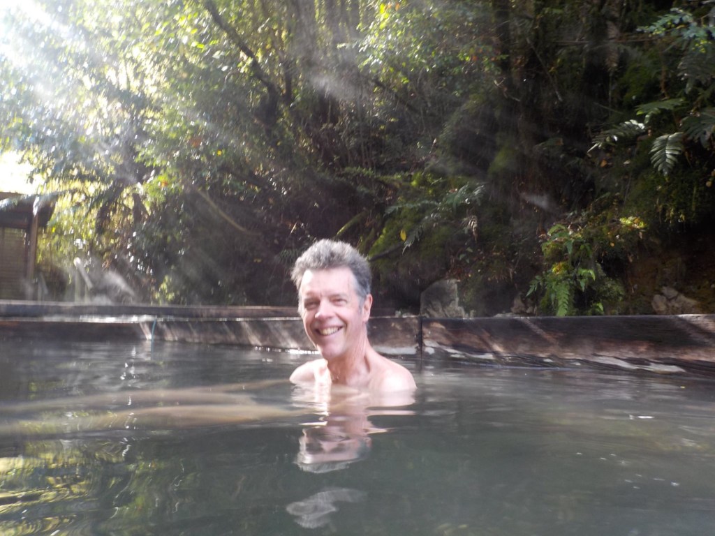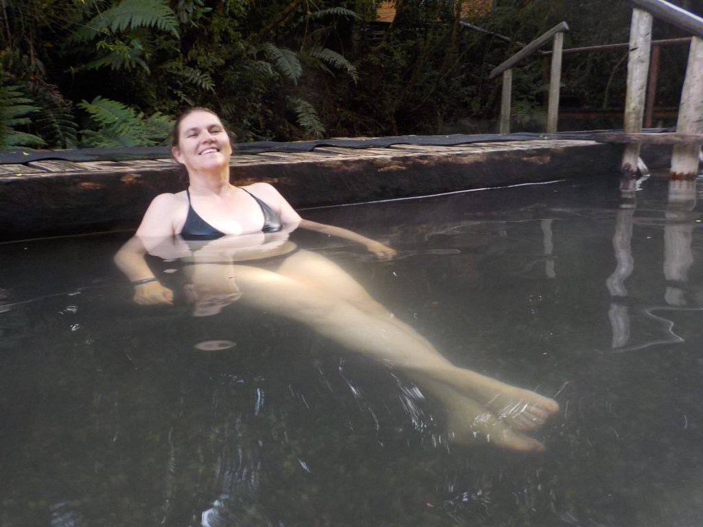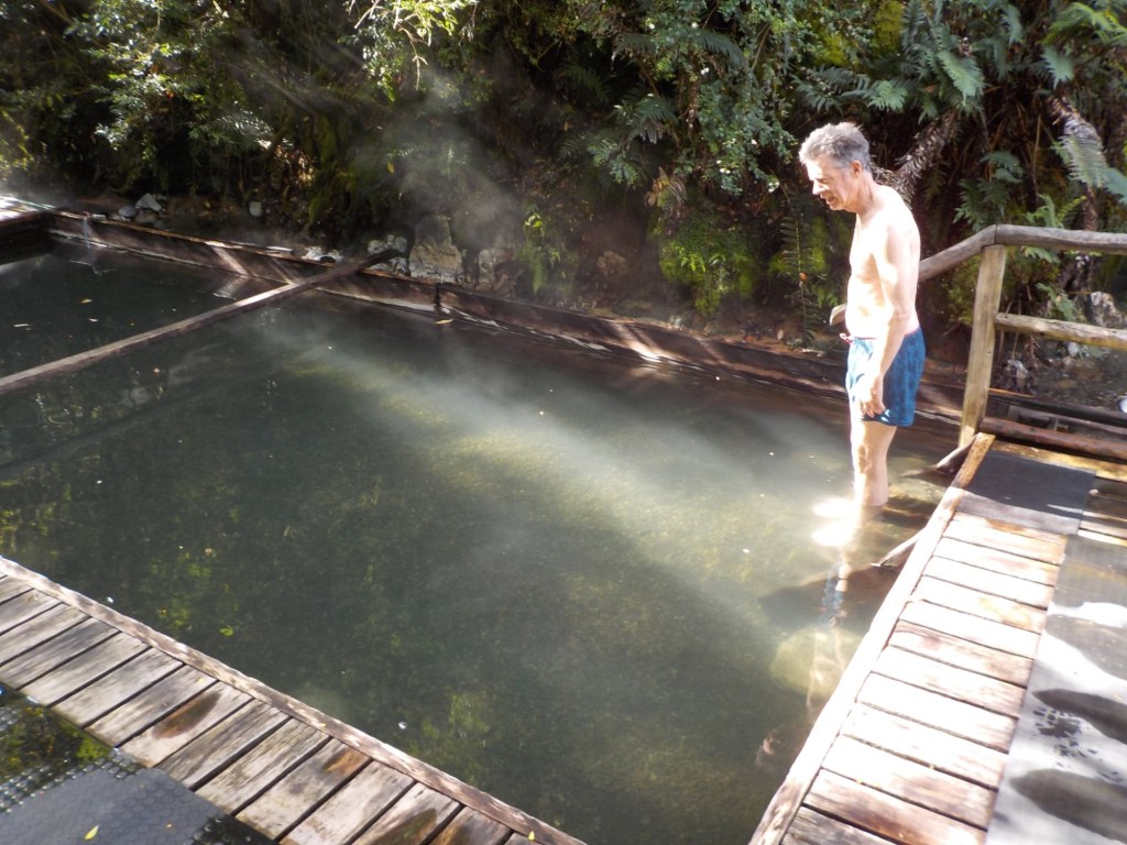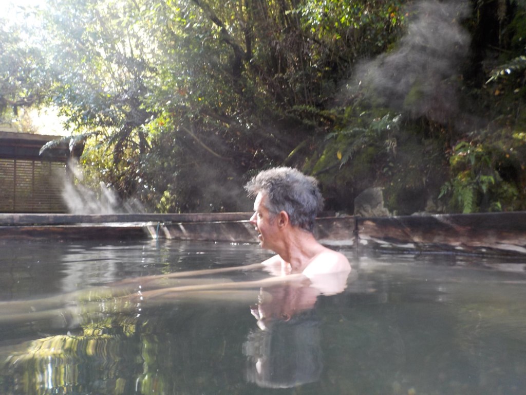 We arrived at the property about twenty minutes before our time slot and ate an apple and enjoyed the views and serenity before heading in. We were greeted by a fair haired guy covered in tattoos who showed us to the thermal baths which were in a beautiful bush setting. He explained that there was the cold river on the outside and the enclosed 4 pools which were at 39 degrees Celsius and on the other side were the hot springs which come out of the ground at 80 degrees and not to stick our hands in there😉👍. He also said he could make it hotter if we wanted to later and that he only expected one other couple, so we could choose which pool we wanted. We chose the first one that still had some sunlight coming through the trees. I asked the guy if he spoke German as I heard the Germanic accent in his English – he looked surprised but said yes he speaks German and he is from Süd Tirol (South Tyrol) which used to be part of Austria and now belongs to Italy but people still learn and speak German there. So we communicated in German for a bit as he seemed to be happy to speak his mother tongue.