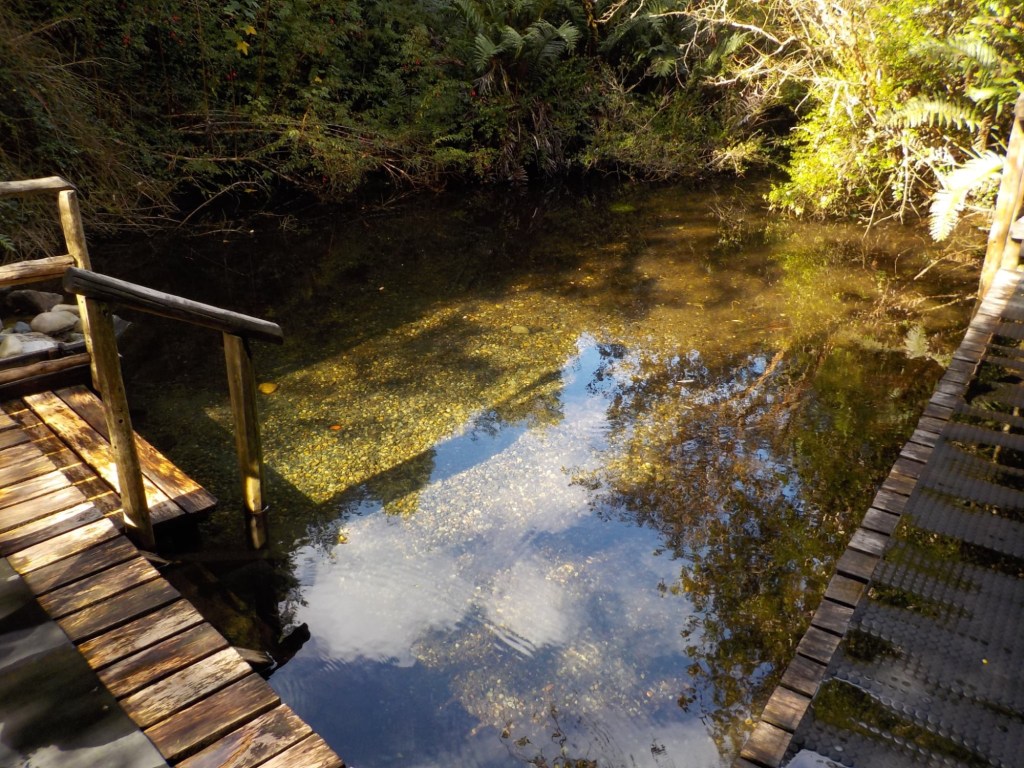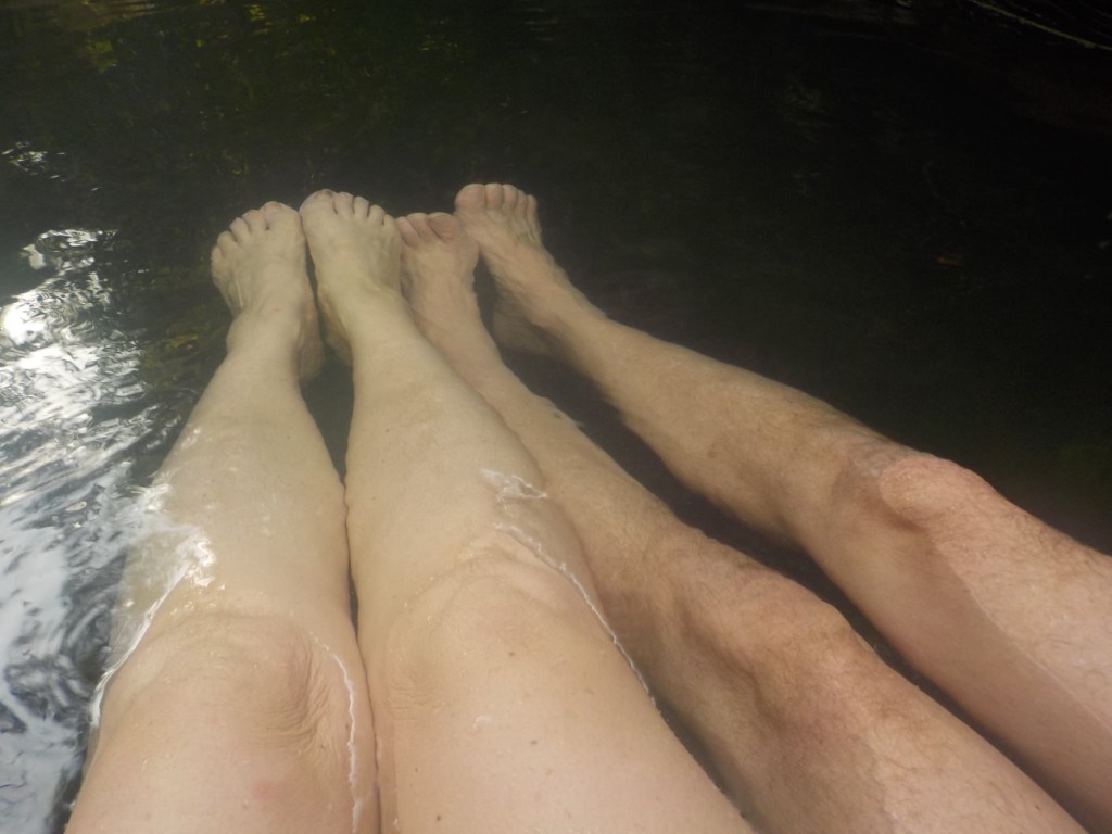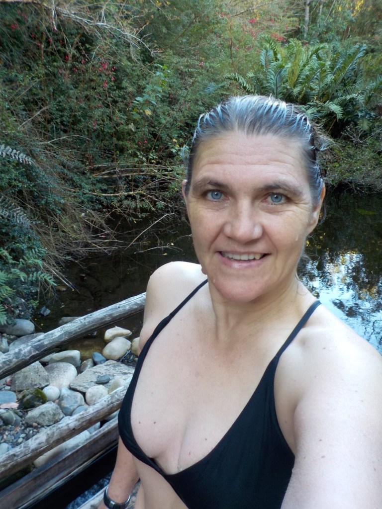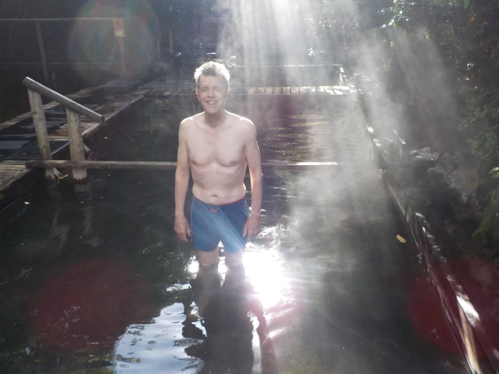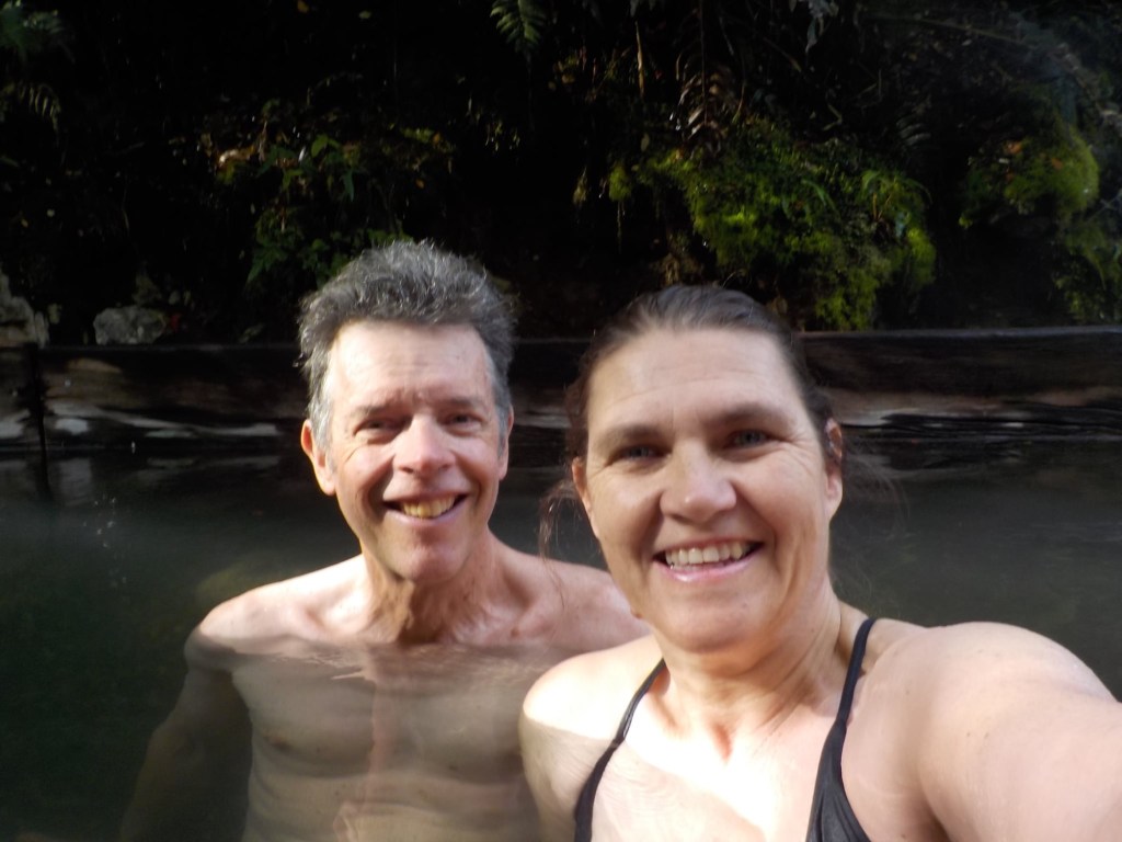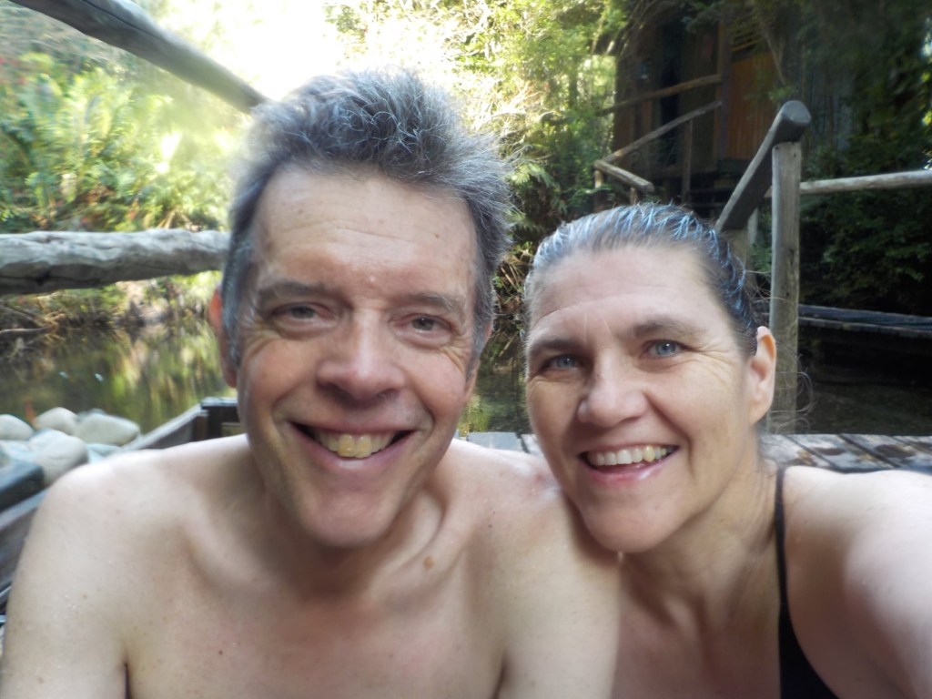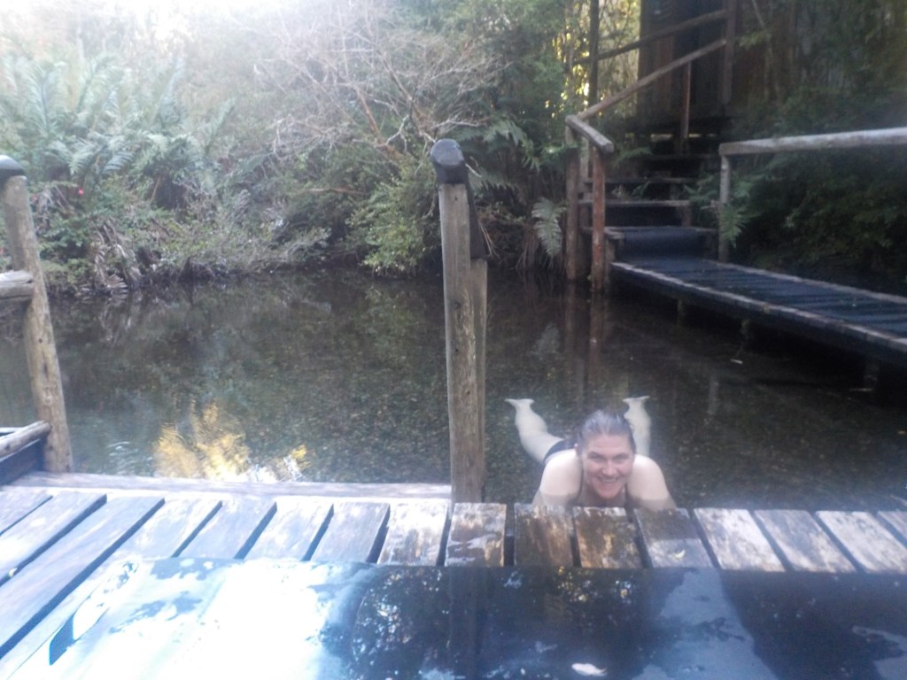 We arrived at the property about twenty minutes before our time slot and ate an apple and enjoyed the views and serenity before heading in. We were greeted by a fair haired guy covered in tattoos who showed us to the thermal baths which were in a beautiful bush setting. He explained that there was the cold river on the outside and the enclosed 4 pools which were at 39 degrees Celsius and on the other side were the hot springs which come out of the ground at 80 degrees and not to stick our hands in there😉👍. He also said he could make it hotter if we wanted to later and that he only expected one other couple, so we could choose which pool we wanted. We chose the first one that still had some sunlight coming through the trees. I asked the guy if he spoke German as I heard the Germanic accent in his English – he looked surprised but said yes he speaks German and he is from Süd Tirol (South Tyrol) which used to be part of Austria and now belongs to Italy but people still learn and speak German there. So we communicated in German for a bit as he seemed to be happy to speak his mother tongue.