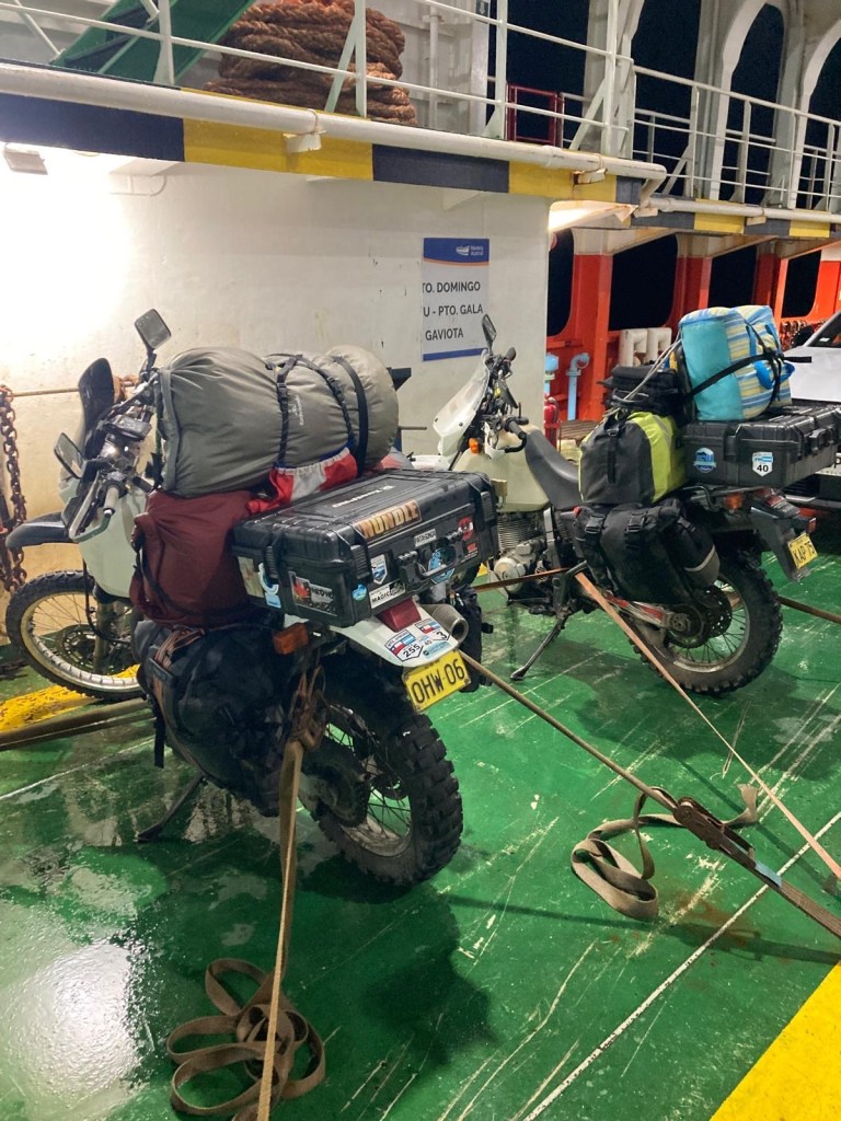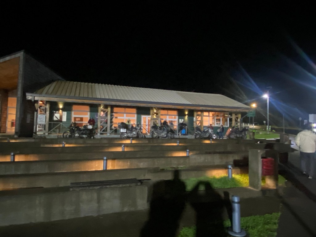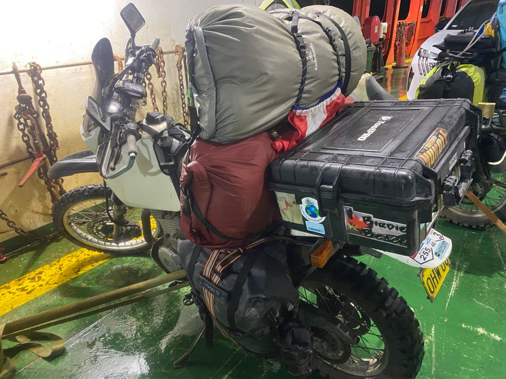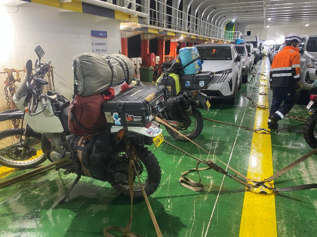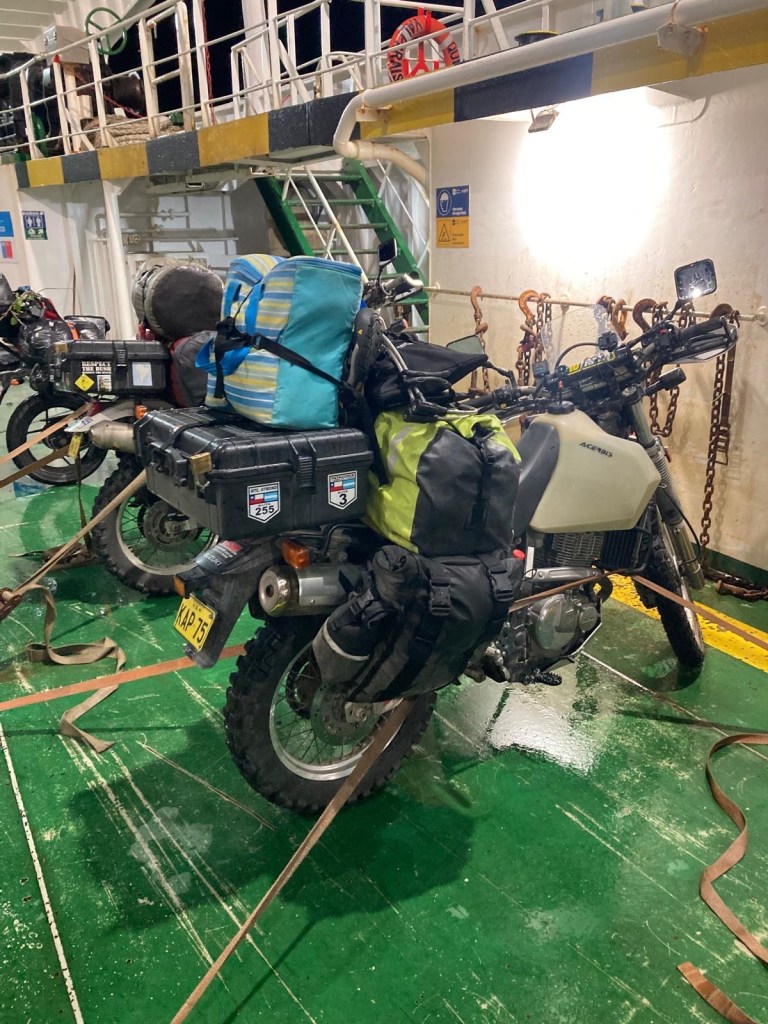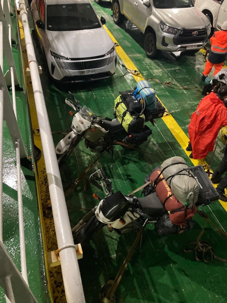 We returned to the ferry terminal by 9:30pm and talked some more to the Chilean riders and found out that there were two ferries scheduled and the first one to arrive would go to Puerto Montt which is where they were heading to. One of them also told us that he hit one of the unpaved gravel sections of the Carretera Austral that appeared unexpectedly at >100km/hr and had a big off but he was able to continue the ride. There were a number of semi trailers and trucks lining up and the first ferry eventually arrived and all the larger vehicles were reversed onto the ferry. Our 5 Chilean motorcycle riders were last to be loaded. The rain had started again and we waited for the arrival of our ferry to Quellón which arrived well after 11:00pm and we had to wait for the vehicles to disembark first. One big 1200GS with two up and heavily loaded rode off and was met by a customs officer on the uphill section of the loading ramp and he lost his footing and dropped the bike – it took 4 people to lift it up and they stood outside and had all their paperwork checked. The loading of the ferry started quickly and there were fewer large trucks to be loaded and motorcycles were again loaded last – it was us and another 3 smaller motorcycles with young guys from Chile. We were instructed to park the bikes perpendicular to the car lanes and workers started strapping them down. The deck hand who started strapping our bikes walked off without them properly secured and we asked the other workers who secured the Chilean’s bikes to look at ours as well – they came and added more straps and started ratcheting Andrew’s bike down from the wrong side (the one opposite where his side stand is) and almost pulled the bike over. We had left port and the ramp was raised up when the bikes were finally secured abd we headed up to the seating area to find a couple in our reserved seats – they reluctantly moved over but just next to us when I had booked the seats to have a free row to ourselves and the lights were turned off and it was pitch dark and very hot inside. I stripped layer after layer until ai was in my singlet and I sat in the tow behind our booked seats – there was plenty of empty seats.