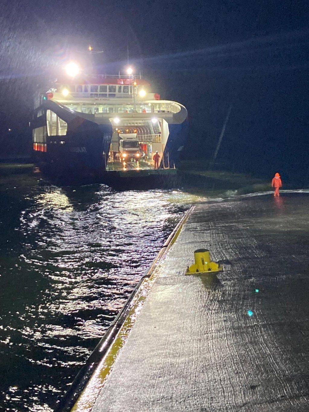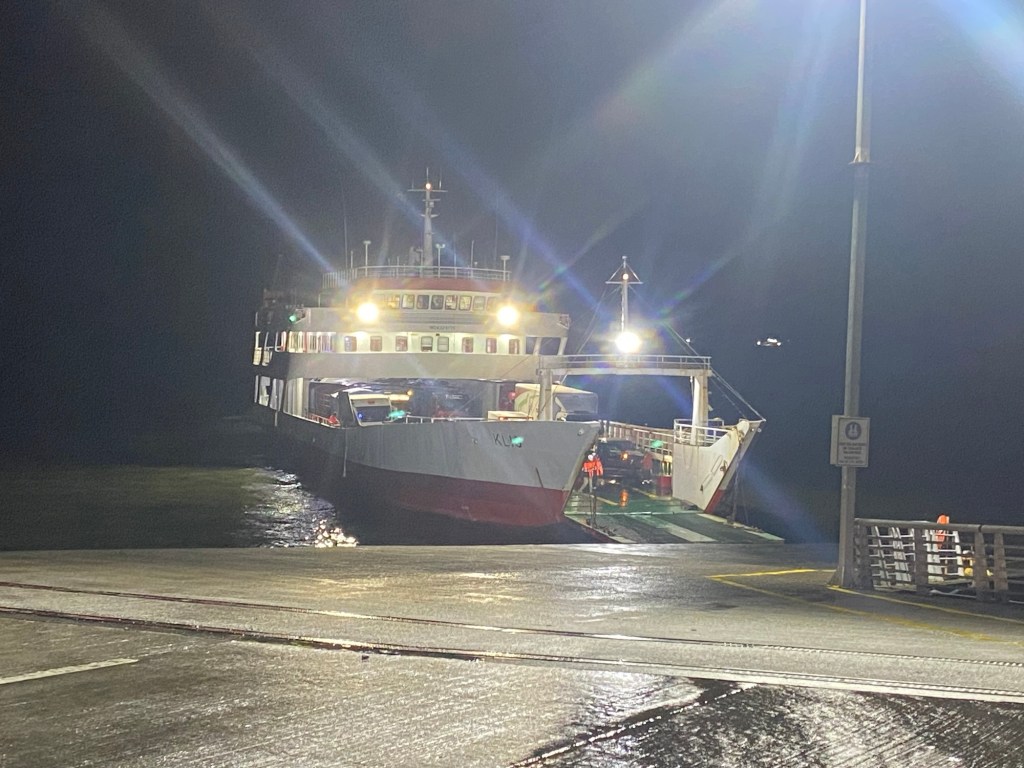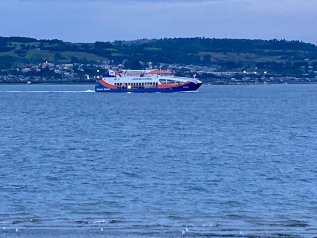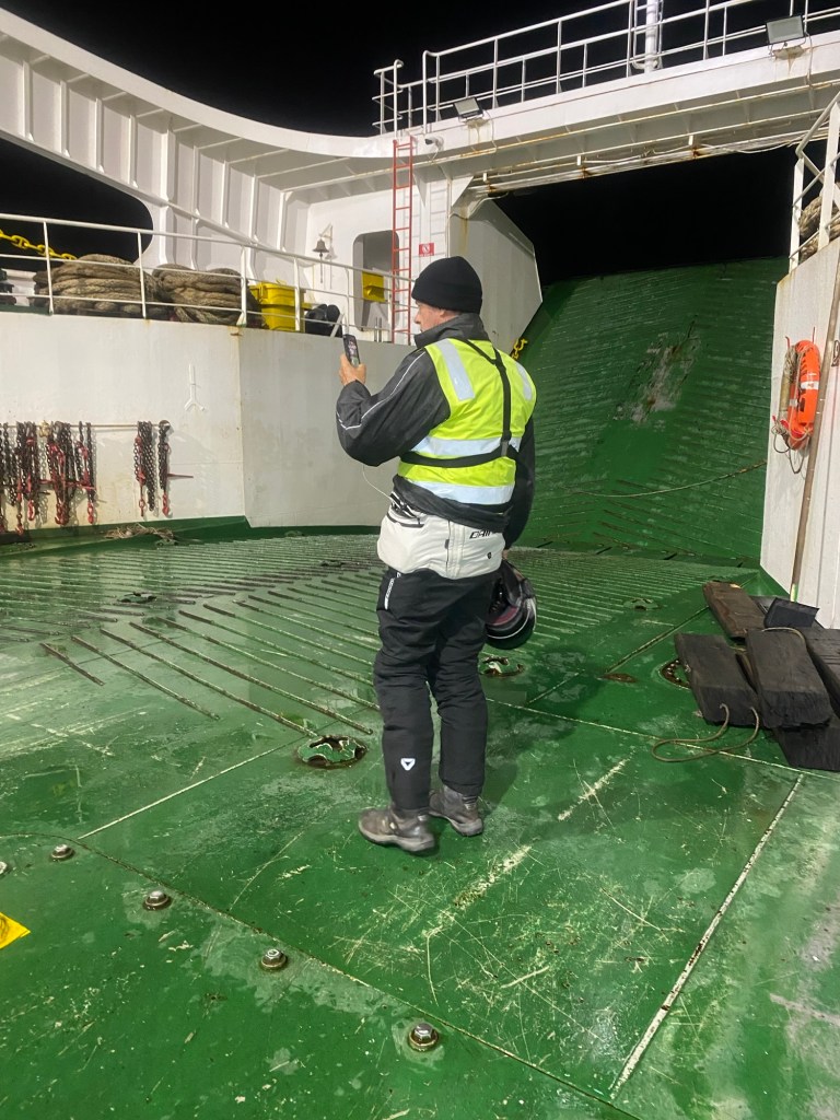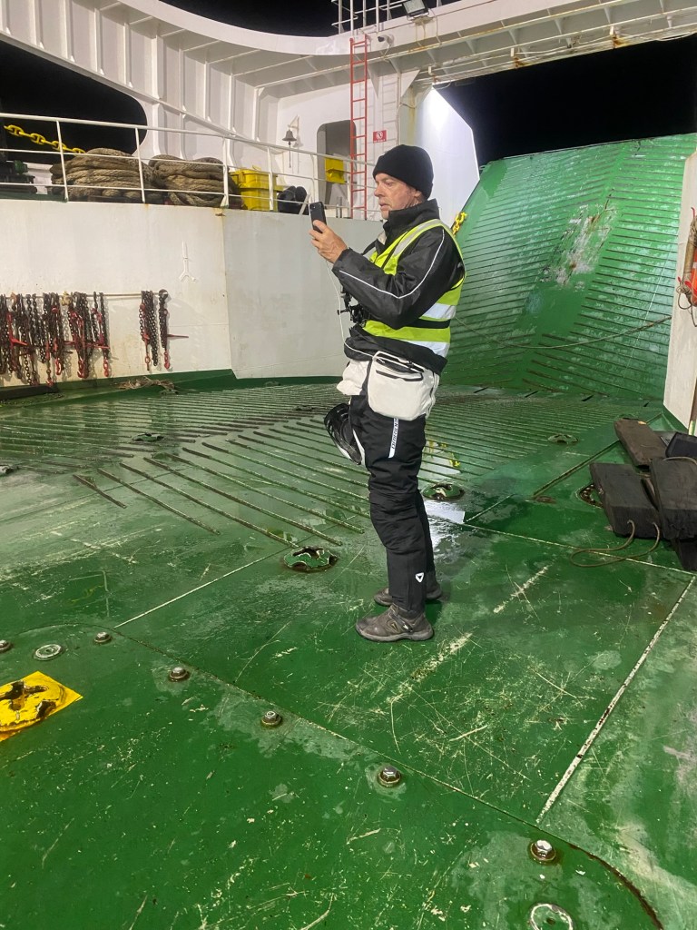 We returned to the ferry terminal by 9:30pm and talked some more to the Chilean riders and found out that there were two ferries scheduled and the first one to arrive would go to Puerto Montt which is where they were heading to. One of them also told us that he hit one of the unpaved gravel sections of the Carretera Austral that appeared unexpectedly at >100km/hr and had a big off but he was able to continue the ride. There were a number of semi trailers and trucks lining up and the first ferry eventually arrived and all the larger vehicles were reversed onto the ferry. Our 5 Chilean motorcycle riders were last to be loaded. The rain had started again and we waited for the arrival of our ferry to Quellón which arrived well after 11:00pm and we had to wait for the vehicles to disembark first. One big 1200GS with two up and heavily loaded rode off and was met by a customs officer on the uphill section of the loading ramp and he lost his footing and dropped the bike – it took 4 people to lift it up and they stood outside and had all their paperwork checked. The loading of the ferry started quickly and there were fewer large trucks to be loaded and motorcycles were again loaded last – it was us and another 3 smaller motorcycles with young guys from Chile. We were instructed to park the bikes perpendicular to the car lanes and workers started strapping them down. The deck hand who started strapping our bikes walked off without them properly secured and we asked the other workers who secured the Chilean’s bikes to look at ours as well – they came and added more straps and started ratcheting Andrew’s bike down from the wrong side (the one opposite where his side stand is) and almost pulled the bike over. We had left port and the ramp was raised up when the bikes were finally secured abd we headed up to the seating area to find a couple in our reserved seats – they reluctantly moved over but just next to us when I had booked the seats to have a free row to ourselves and the lights were turned off and it was pitch dark and very hot inside. I stripped layer after layer until ai was in my singlet and I sat in the tow behind our booked seats – there was plenty of empty seats.