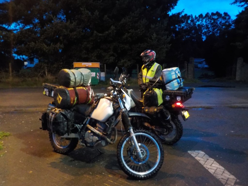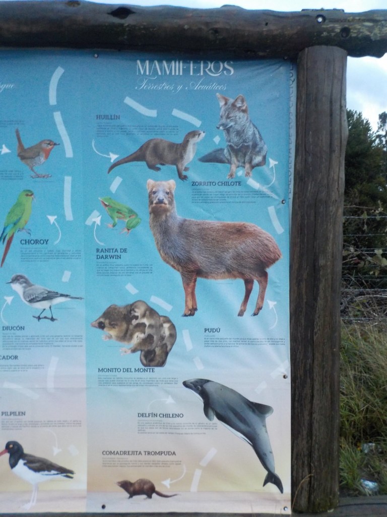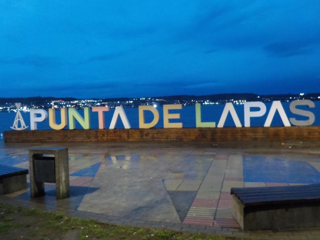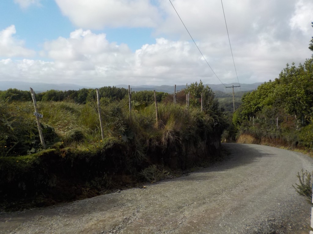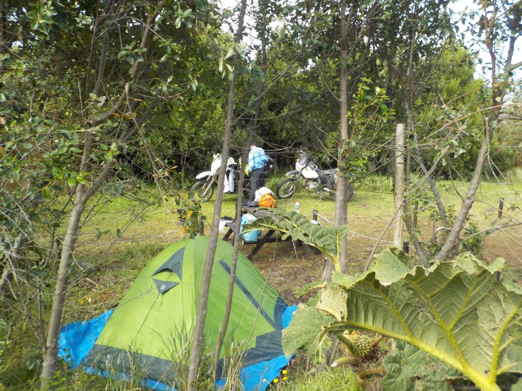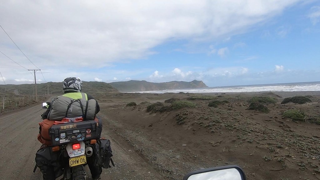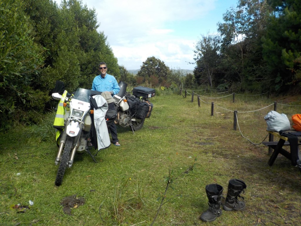 The entire voyage took ~4.5 hours and we arrived at 5:30am in Quellón – we had to disembark first and when we got to the bikes they had already started loosening the tie-down straps and were holding Andrew’s bike to stop it from falling over. It was still very dark when we arrived and everything was very wet but it did not rain. We could not find any open coffee shop snd decided to ride through town to the start of Ruta 5 (the Pan-American highway which goes all the way to Alaska). We found a place to park the bikes at the Punta de Lapas sign and waited another 90 minutes in very wet and cold conditions for the sunrise – there were squalls of rain blowing in from the sea and it was quite a miserable wait – there were only concrete benches which were too cold for me to sit on and Andrew was getting very cold and the rain had soaked through his wet weather gear. When daylight arrived (no sun- still cloudy and rainy), we took some pictures of the iconic monument Hito Cero (the entire area is being renovated) and some information about the flora and fauna and history of the area, and then battled the rush hour and school drop-off traffic through town in the search of a place to have breakfast and warm up. We eventually found a small café called Dahlia and had hot drinks and sweets for breakfast. Feeling slightly warmer, we rode to Chonchi where we fuelled up and stocked up on groceries for our next 3 nights camping. There were still multiple rain showers we rode through and we waited out another bigger deluge undercover at the shopping place before riding along lake Cucao on Ruta W-850 to Cucao. From Cucao we turned left on W-848 and then W-802 which was unsealed and meandered up and down hills and had great ocean views of the roaring Pacific with wild waves crashing onto the rocky headlands.