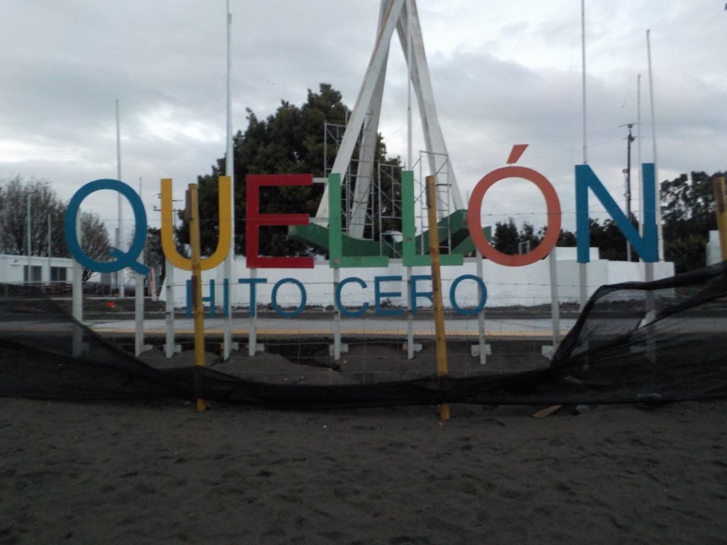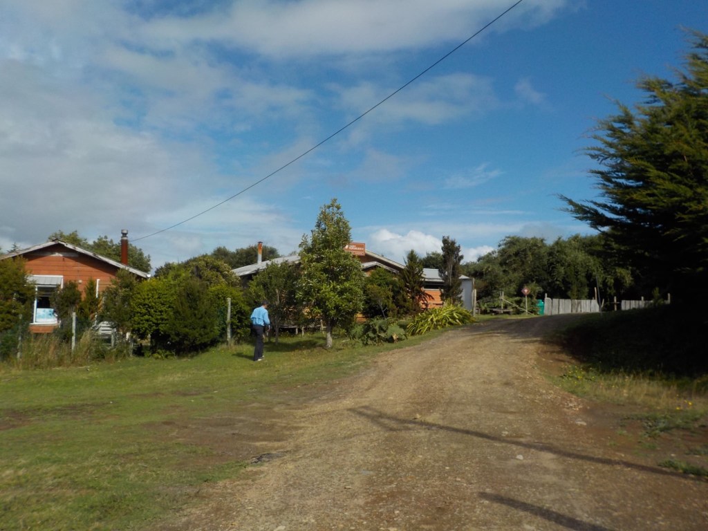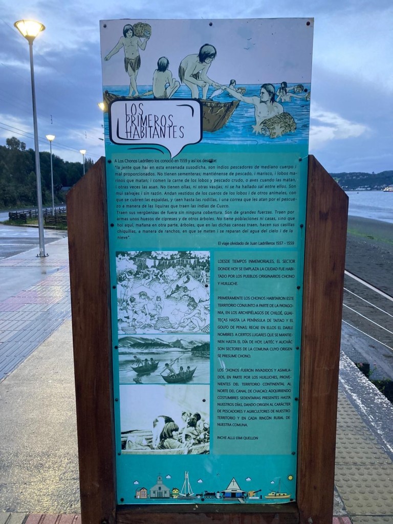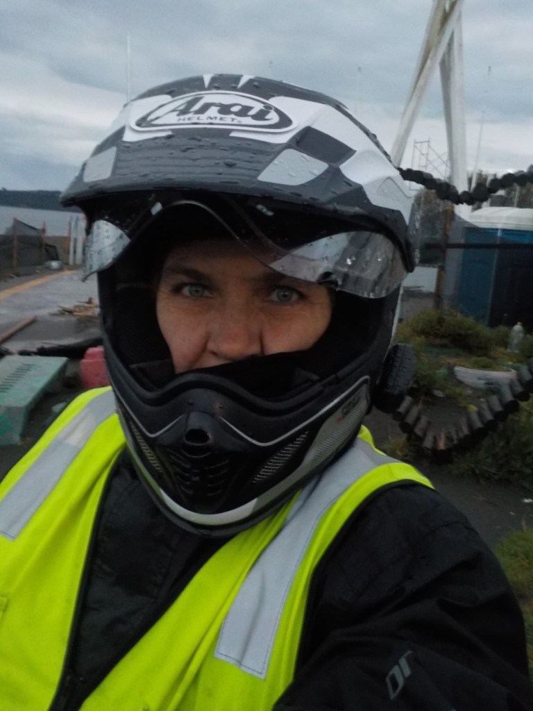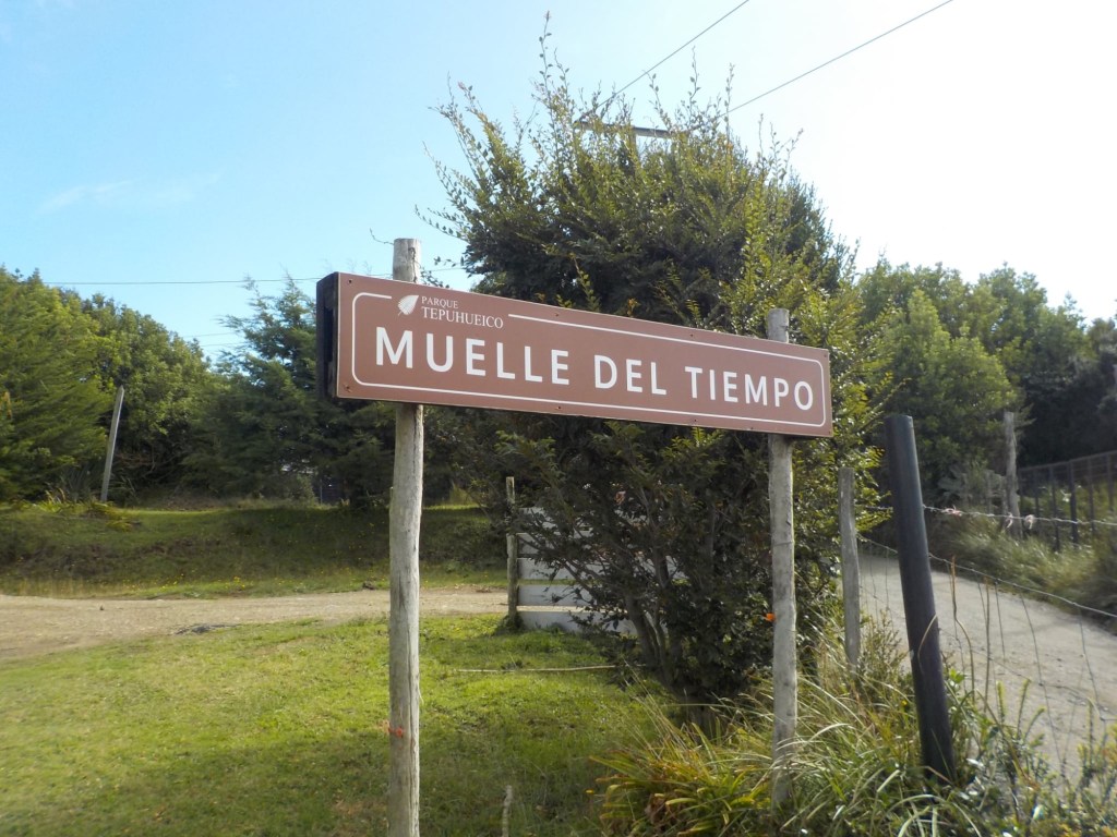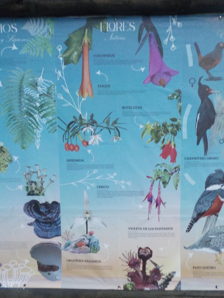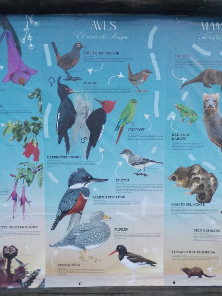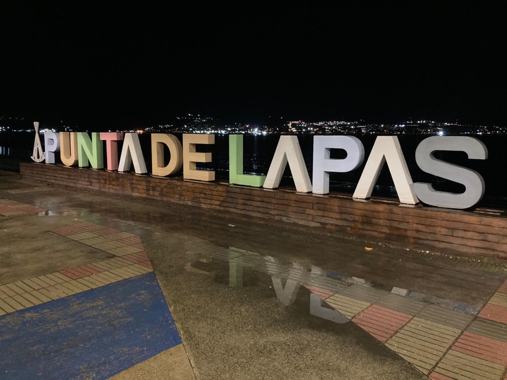 The entire voyage took ~4.5 hours and we arrived at 5:30am in Quellón – we had to disembark first and when we got to the bikes they had already started loosening the tie-down straps and were holding Andrew’s bike to stop it from falling over. It was still very dark when we arrived and everything was very wet but it did not rain. We could not find any open coffee shop snd decided to ride through town to the start of Ruta 5 (the Pan-American highway which goes all the way to Alaska). We found a place to park the bikes at the Punta de Lapas sign and waited another 90 minutes in very wet and cold conditions for the sunrise – there were squalls of rain blowing in from the sea and it was quite a miserable wait – there were only concrete benches which were too cold for me to sit on and Andrew was getting very cold and the rain had soaked through his wet weather gear. When daylight arrived (no sun- still cloudy and rainy), we took some pictures of the iconic monument Hito Cero (the entire area is being renovated) and some information about the flora and fauna and history of the area, and then battled the rush hour and school drop-off traffic through town in the search of a place to have breakfast and warm up. We eventually found a small café called Dahlia and had hot drinks and sweets for breakfast. Feeling slightly warmer, we rode to Chonchi where we fuelled up and stocked up on groceries for our next 3 nights camping. There were still multiple rain showers we rode through and we waited out another bigger deluge undercover at the shopping place before riding along lake Cucao on Ruta W-850 to Cucao. From Cucao we turned left on W-848 and then W-802 which was unsealed and meandered up and down hills and had great ocean views of the roaring Pacific with wild waves crashing onto the rocky headlands.