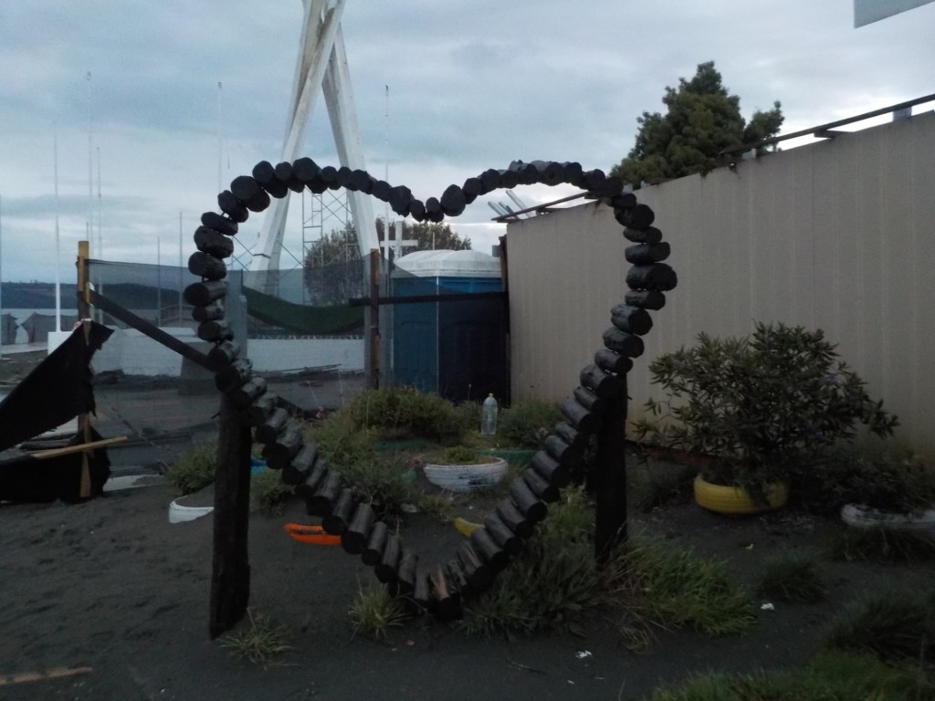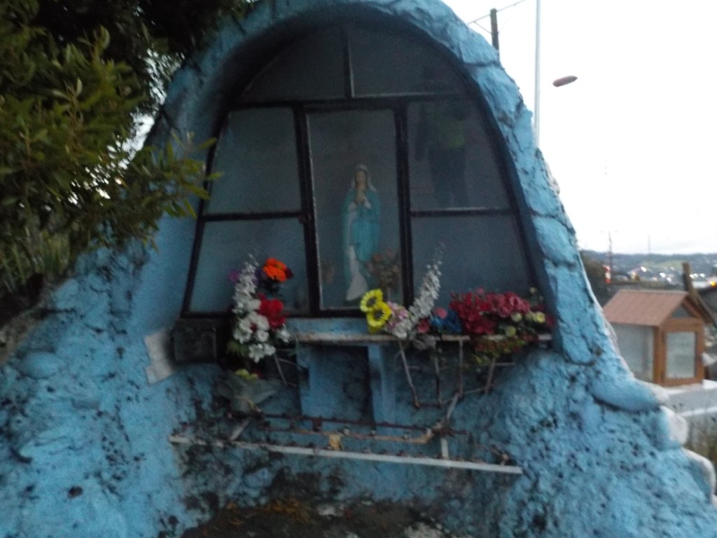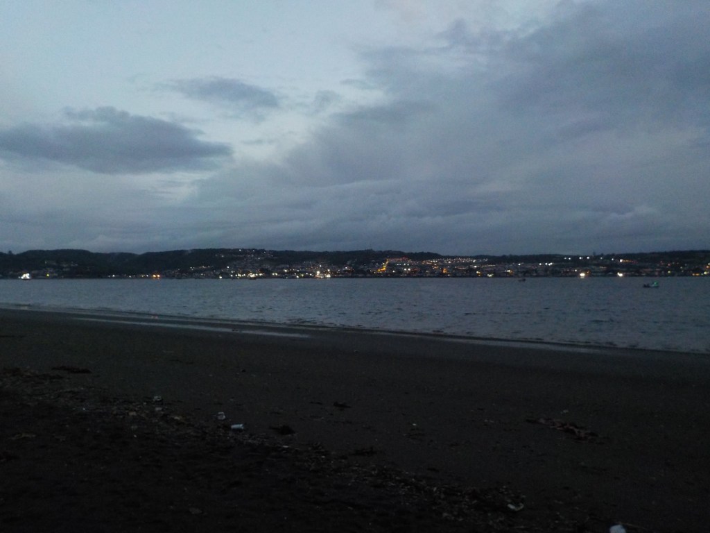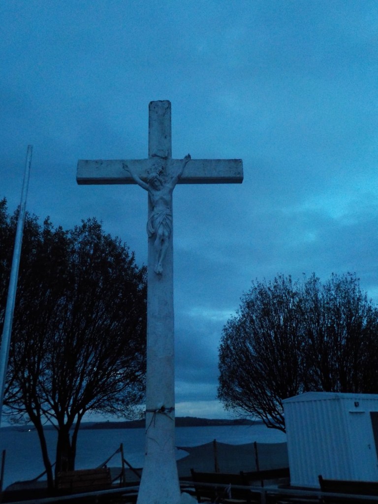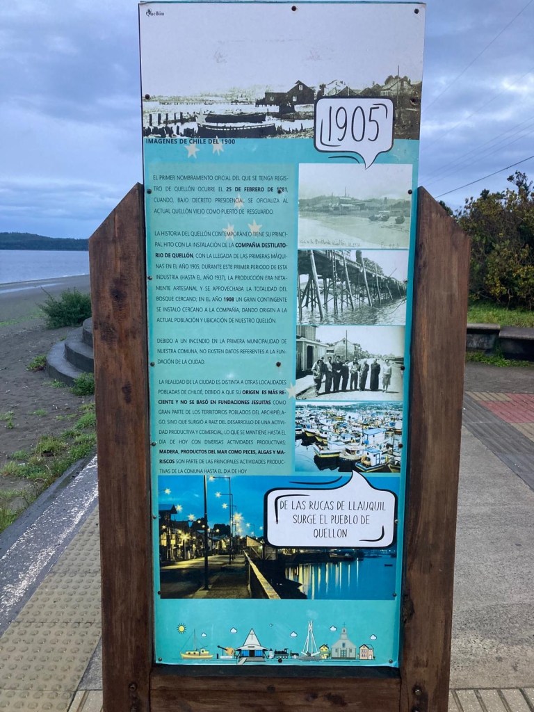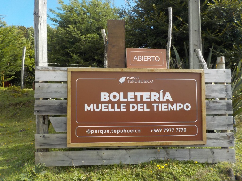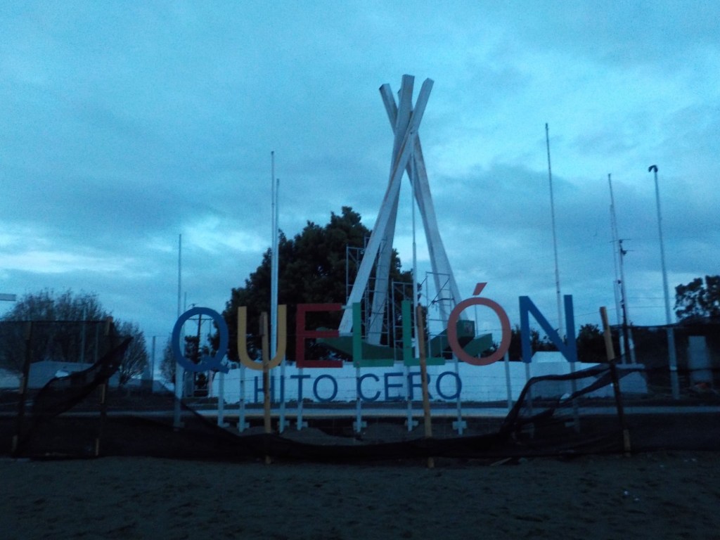 The entire voyage took ~4.5 hours and we arrived at 5:30am in Quellón – we had to disembark first and when we got to the bikes they had already started loosening the tie-down straps and were holding Andrew’s bike to stop it from falling over. It was still very dark when we arrived and everything was very wet but it did not rain. We could not find any open coffee shop snd decided to ride through town to the start of Ruta 5 (the Pan-American highway which goes all the way to Alaska). We found a place to park the bikes at the Punta de Lapas sign and waited another 90 minutes in very wet and cold conditions for the sunrise – there were squalls of rain blowing in from the sea and it was quite a miserable wait – there were only concrete benches which were too cold for me to sit on and Andrew was getting very cold and the rain had soaked through his wet weather gear. When daylight arrived (no sun- still cloudy and rainy), we took some pictures of the iconic monument Hito Cero (the entire area is being renovated) and some information about the flora and fauna and history of the area, and then battled the rush hour and school drop-off traffic through town in the search of a place to have breakfast and warm up. We eventually found a small café called Dahlia and had hot drinks and sweets for breakfast. Feeling slightly warmer, we rode to Chonchi where we fuelled up and stocked up on groceries for our next 3 nights camping. There were still multiple rain showers we rode through and we waited out another bigger deluge undercover at the shopping place before riding along lake Cucao on Ruta W-850 to Cucao. From Cucao we turned left on W-848 and then W-802 which was unsealed and meandered up and down hills and had great ocean views of the roaring Pacific with wild waves crashing onto the rocky headlands.