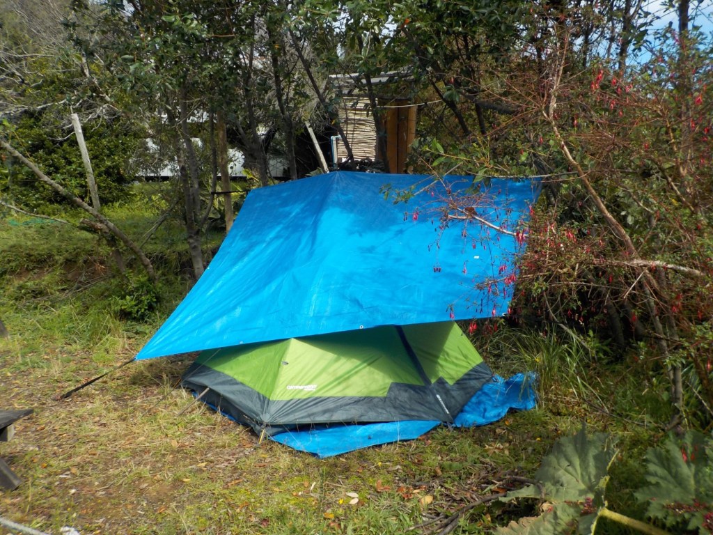 We set up tent while the sun was out and moved everything into the tent before having pizza – we were hungry and tired as it had been a long night and day. We managed to tie our second tarpaulin over the tent as a rain shelter before the heavier rain started. We retired to our comfy tent for an early night and much needed restful sleep.