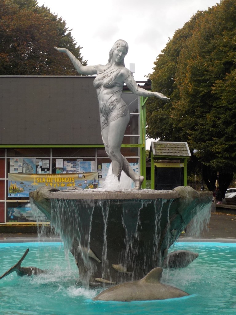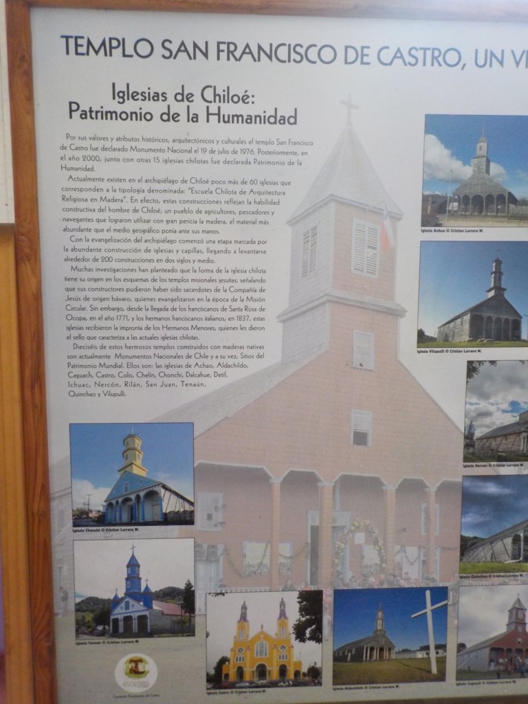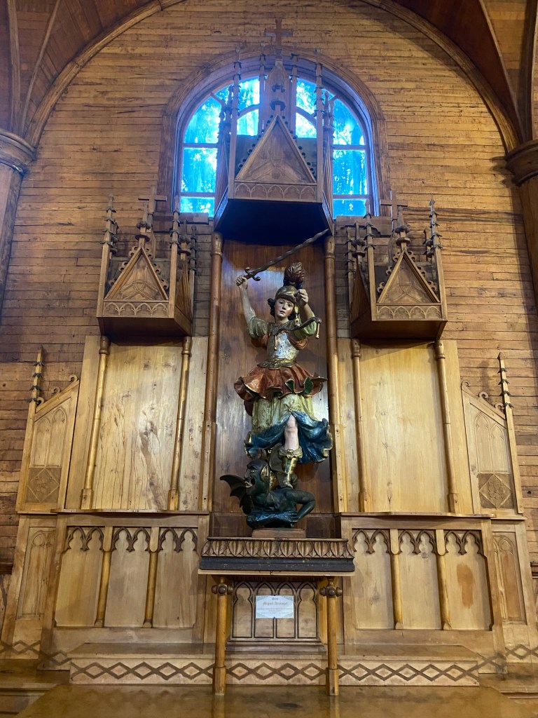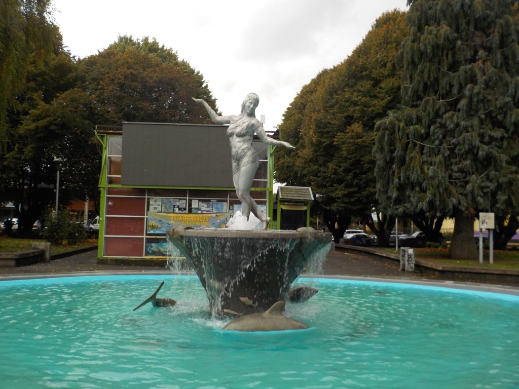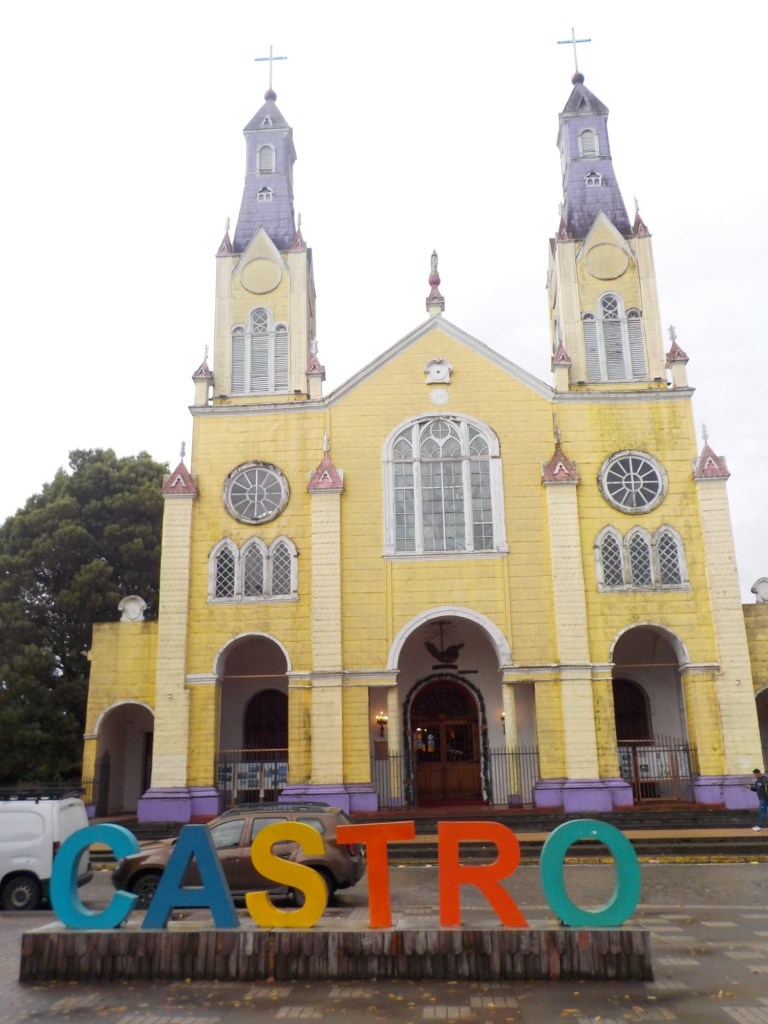 The rain cleared a bit in the late afternoon and we walked up the very steep hill into the centre of town and to the San Francisco church – we just managed to get inside before they closed it but were too late for the museum inside the church. One of the altars has a depiction of Arch angel Michael defeating the devil. We took some pictures of the park in Plaza de Armas and the fountain with a statue of the water spirit La Pincoya and the Castro sign.