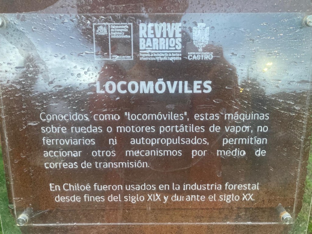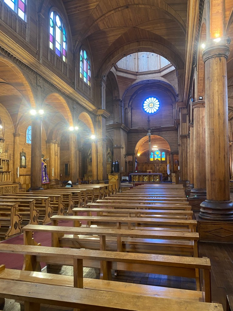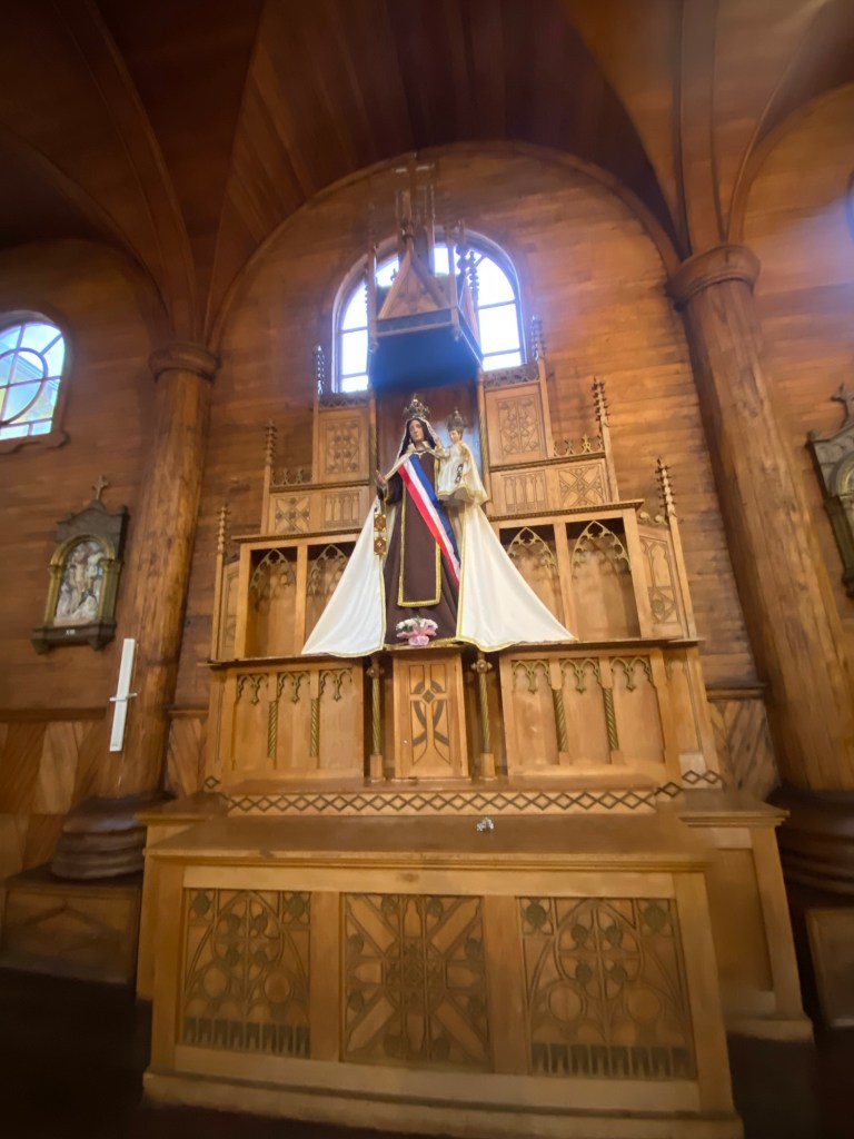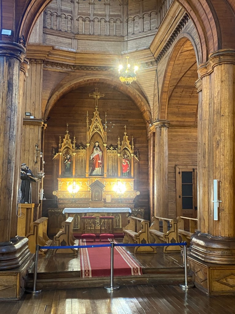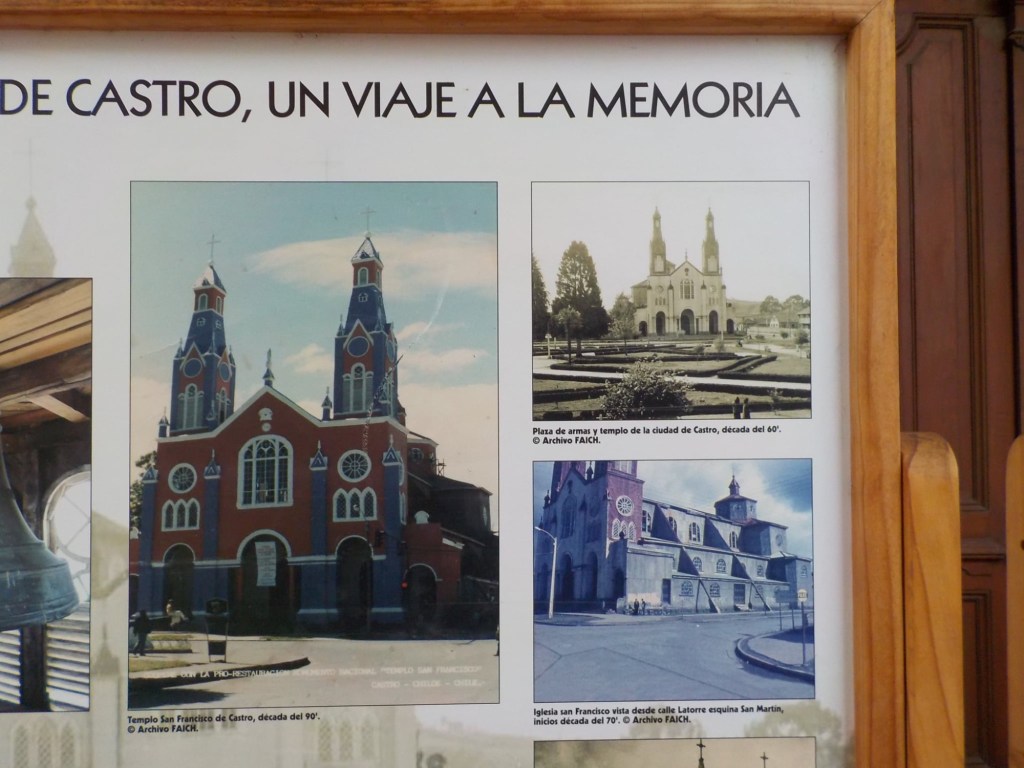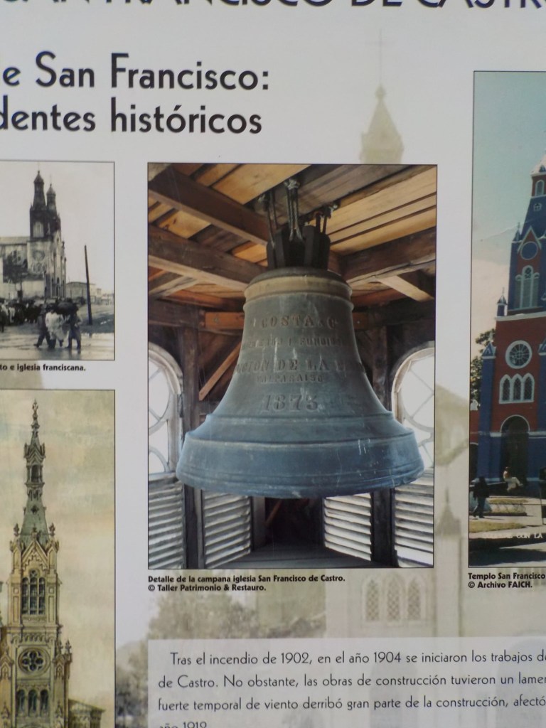 The rain cleared a bit in the late afternoon and we walked up the very steep hill into the centre of town and to the San Francisco church – we just managed to get inside before they closed it but were too late for the museum inside the church. One of the altars has a depiction of Arch angel Michael defeating the devil. We took some pictures of the park in Plaza de Armas and the fountain with a statue of the water spirit La Pincoya and the Castro sign.