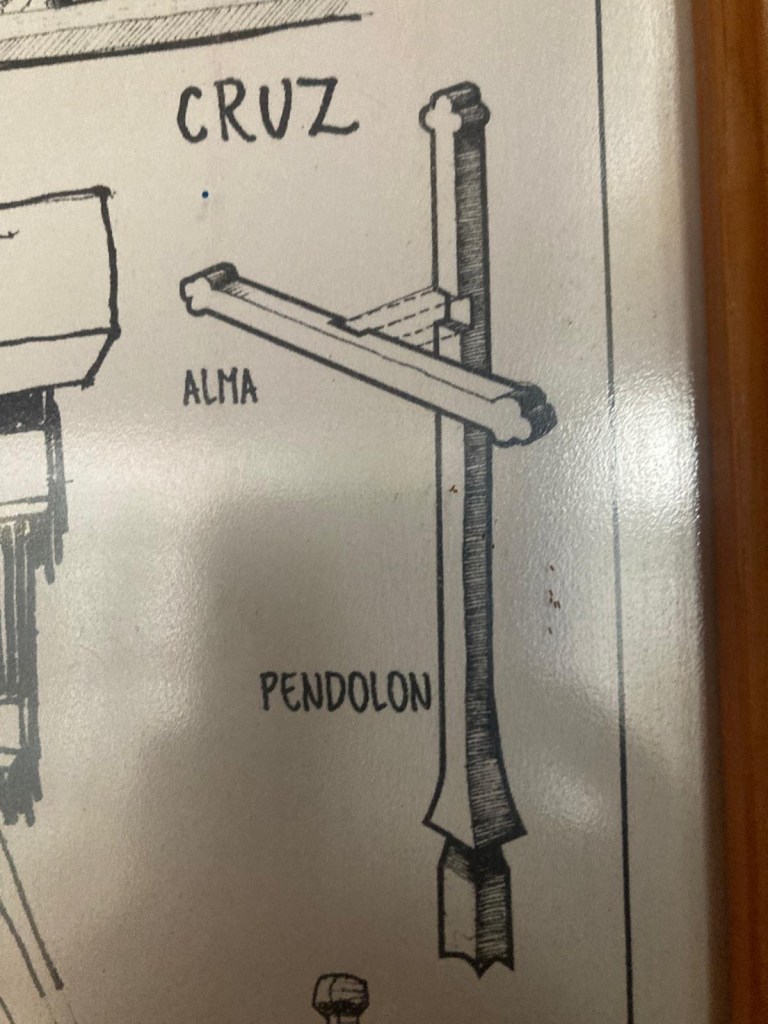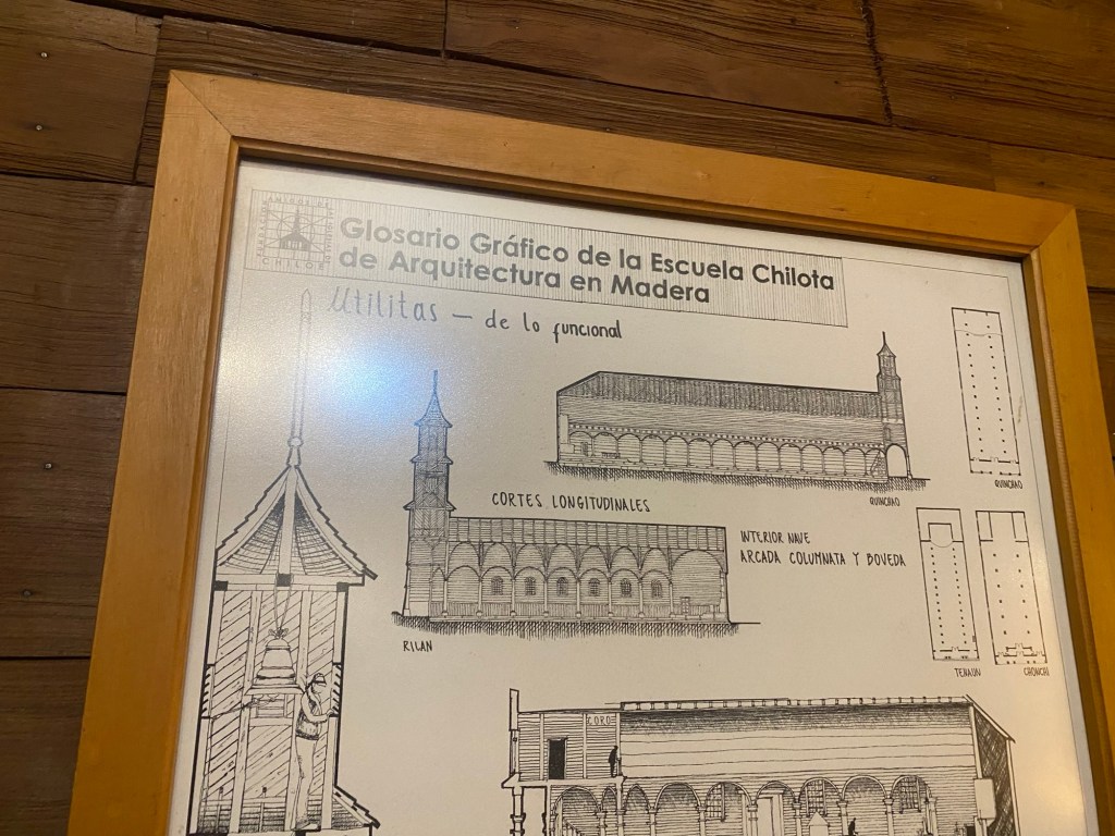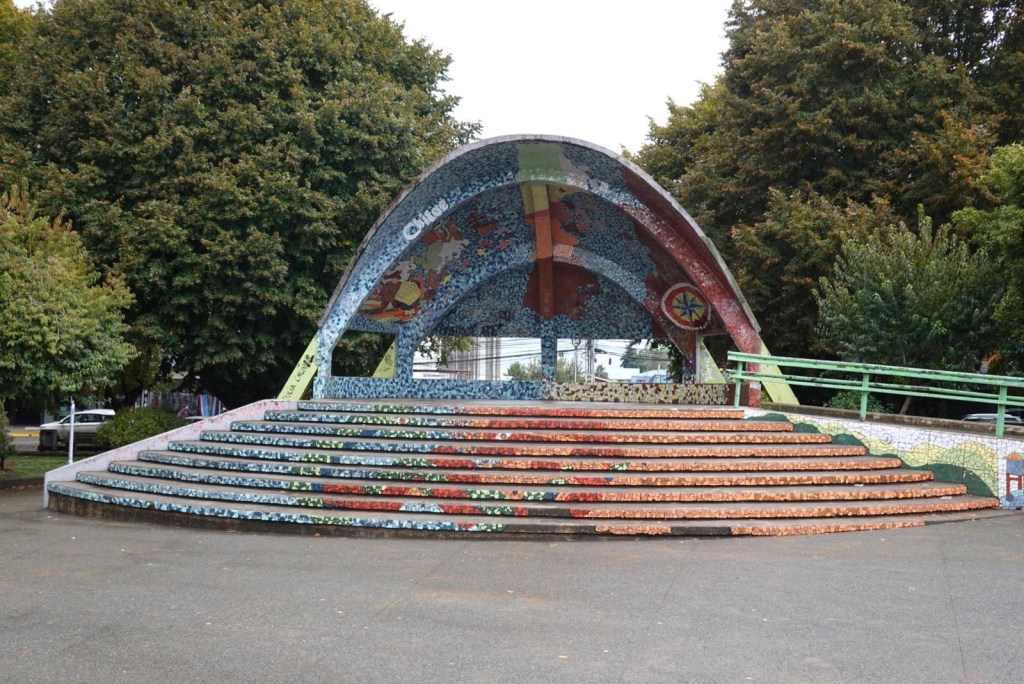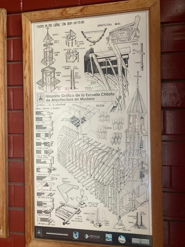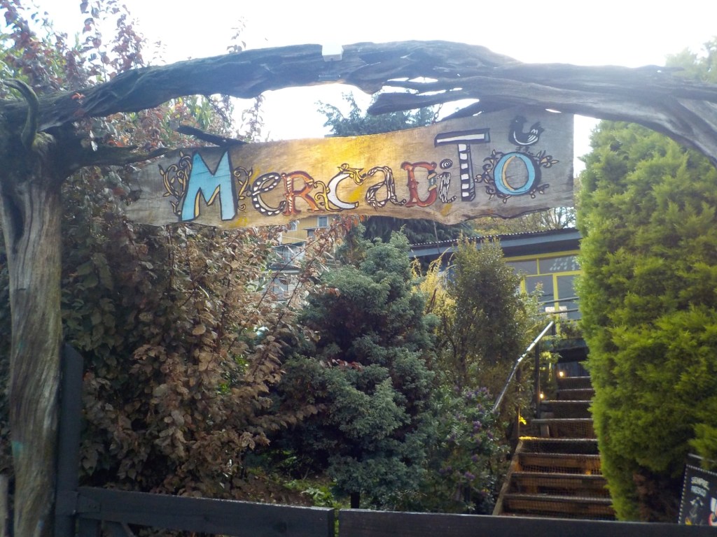 The rain cleared a bit in the late afternoon and we walked up the very steep hill into the centre of town and to the San Francisco church – we just managed to get inside before they closed it but were too late for the museum inside the church. One of the altars has a depiction of Arch angel Michael defeating the devil. We took some pictures of the park in Plaza de Armas and the fountain with a statue of the water spirit La Pincoya and the Castro sign.