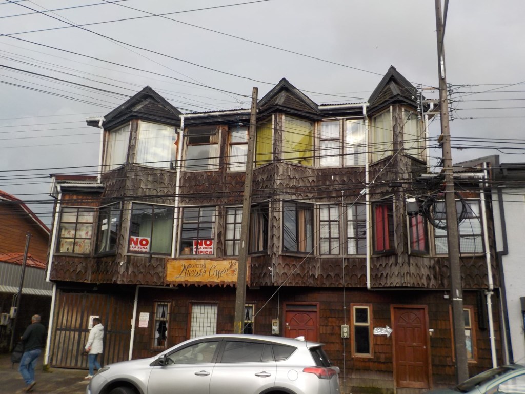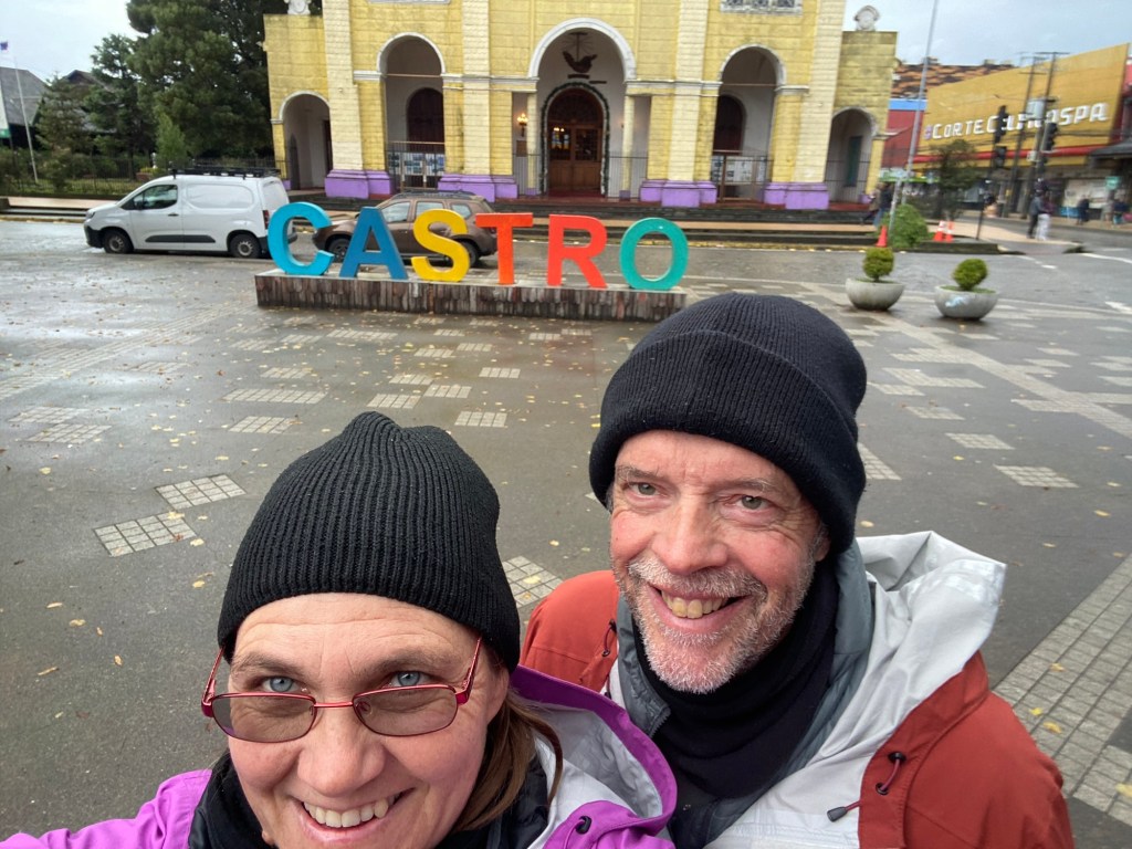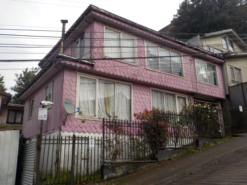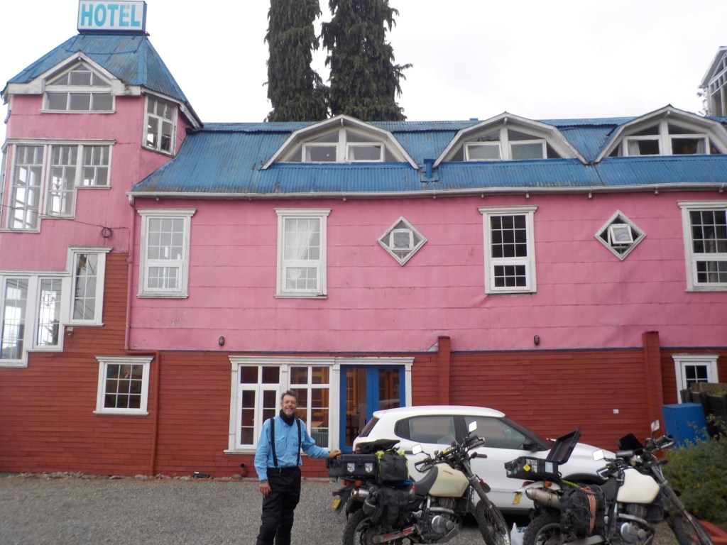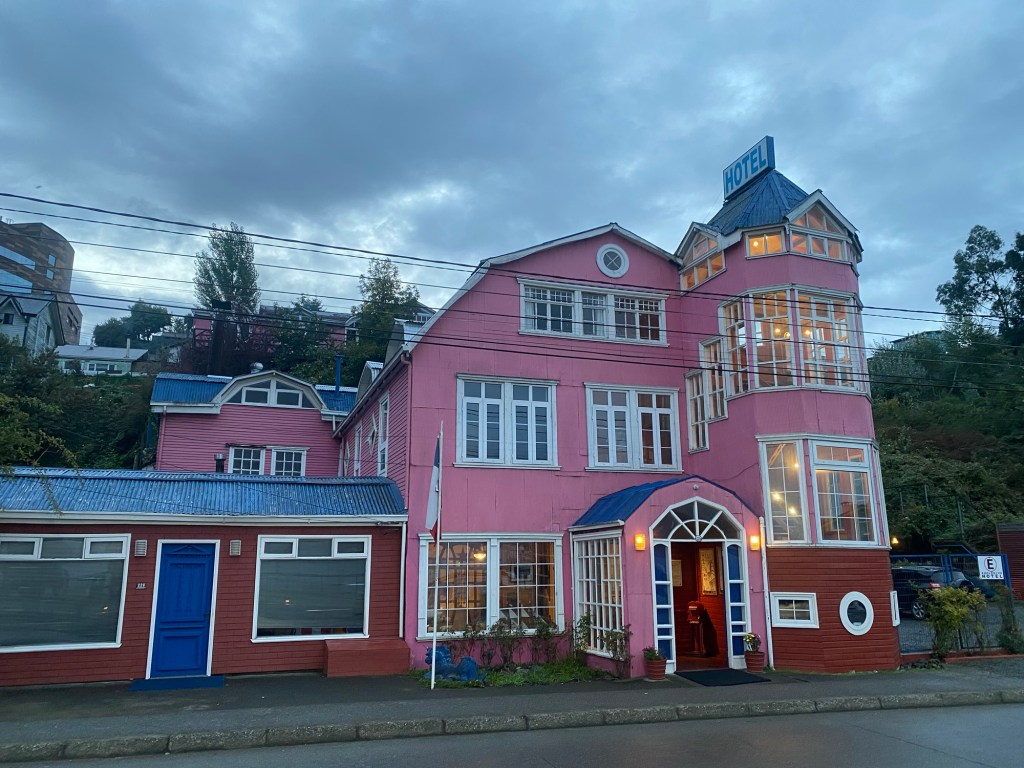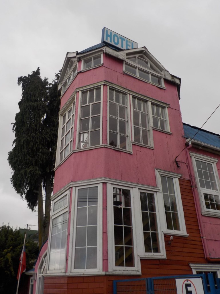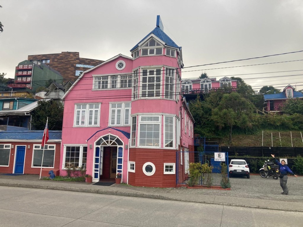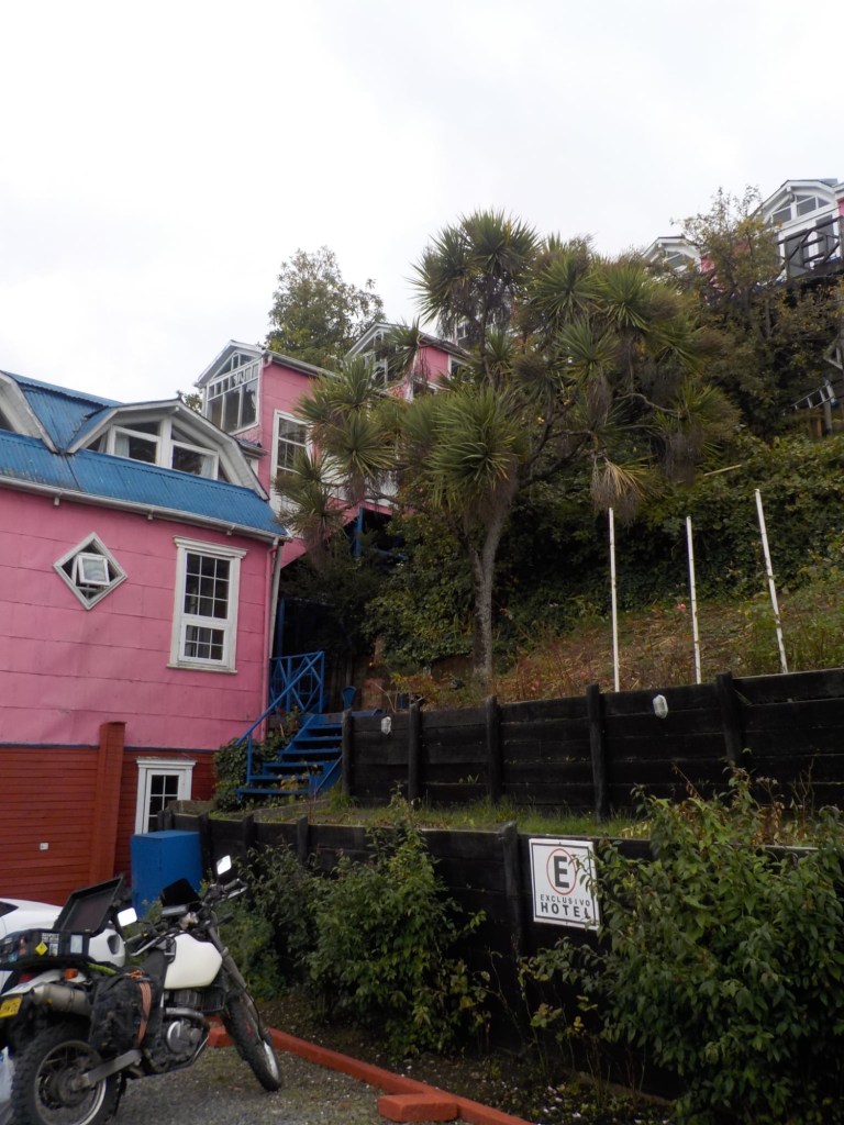 It was a rainy night and we went into the pizzeria for our breakfast and ordered their coffee and tea as it was too wet to fire up our gas stove and there was no shelter over the picnic table at the campsite so everything was very wet. The sun came out eventually and we used the break between showers to pack up and got most of the camping gear pretty dried out and packed. We eventually left well after lunch wearing full wet weather gear and the dirt road out was in surprisingly good condition after all that rain. We rode into and through Cucao to the National Park entry where we turned around and then stopped for a late lunch in one of the restaurants. We both had fresh hake. We continued to Castro where we had booked in a pink hotel for two nights. We arrived and it just started raining again as we unloaded the bikes which were parked in the open carpark next to the hotel. The hotel looked a bit run down and needs a new coat of paint but it had character and reminded me of the Villa Kunterbunt from Pippi Longstocking (book and movies from Astrid Lindgren which I watched as a child but Andrew had not heard about – so we did watch the movie 😉)