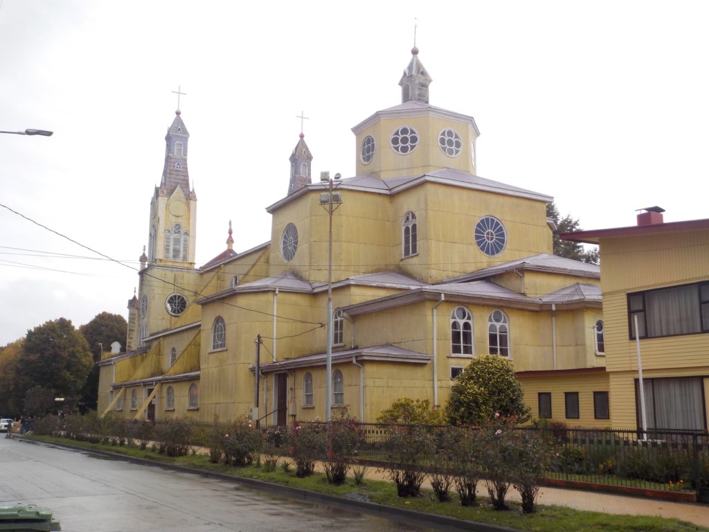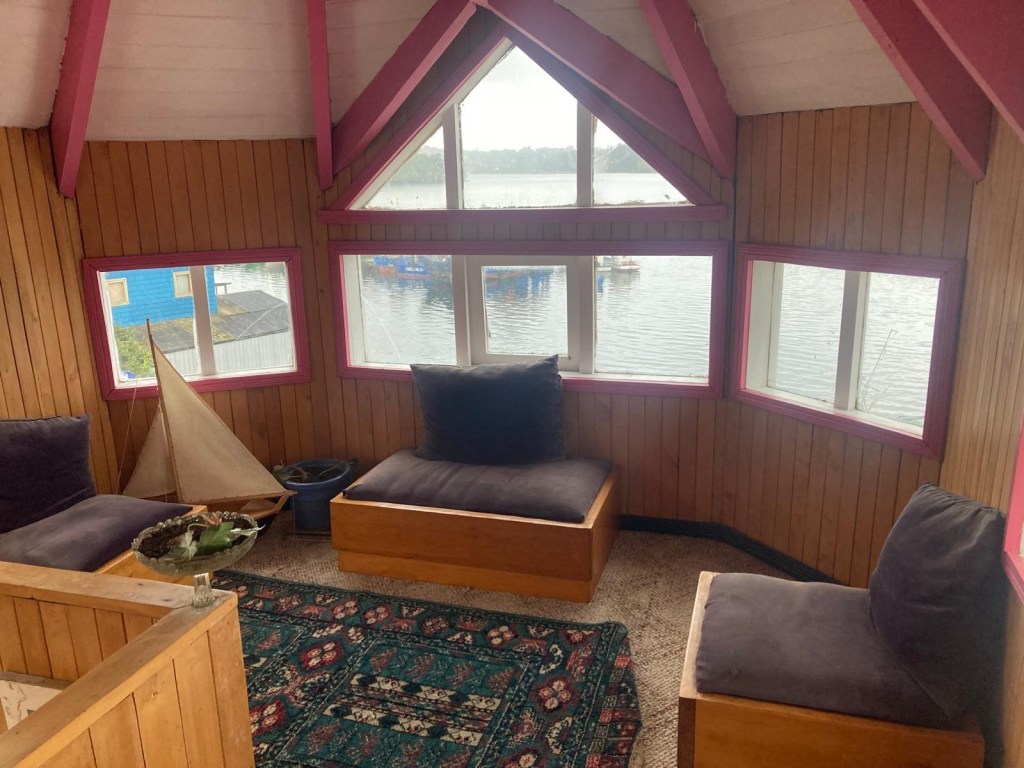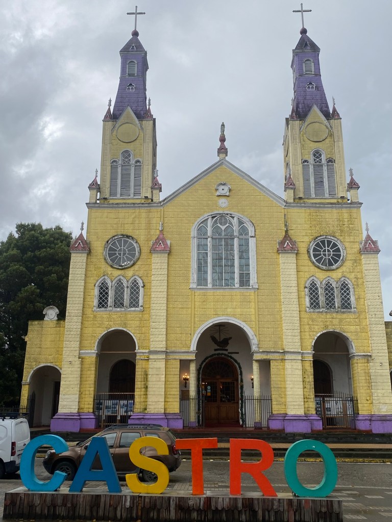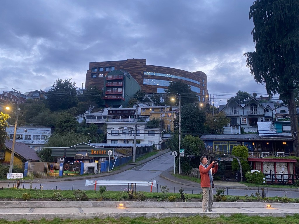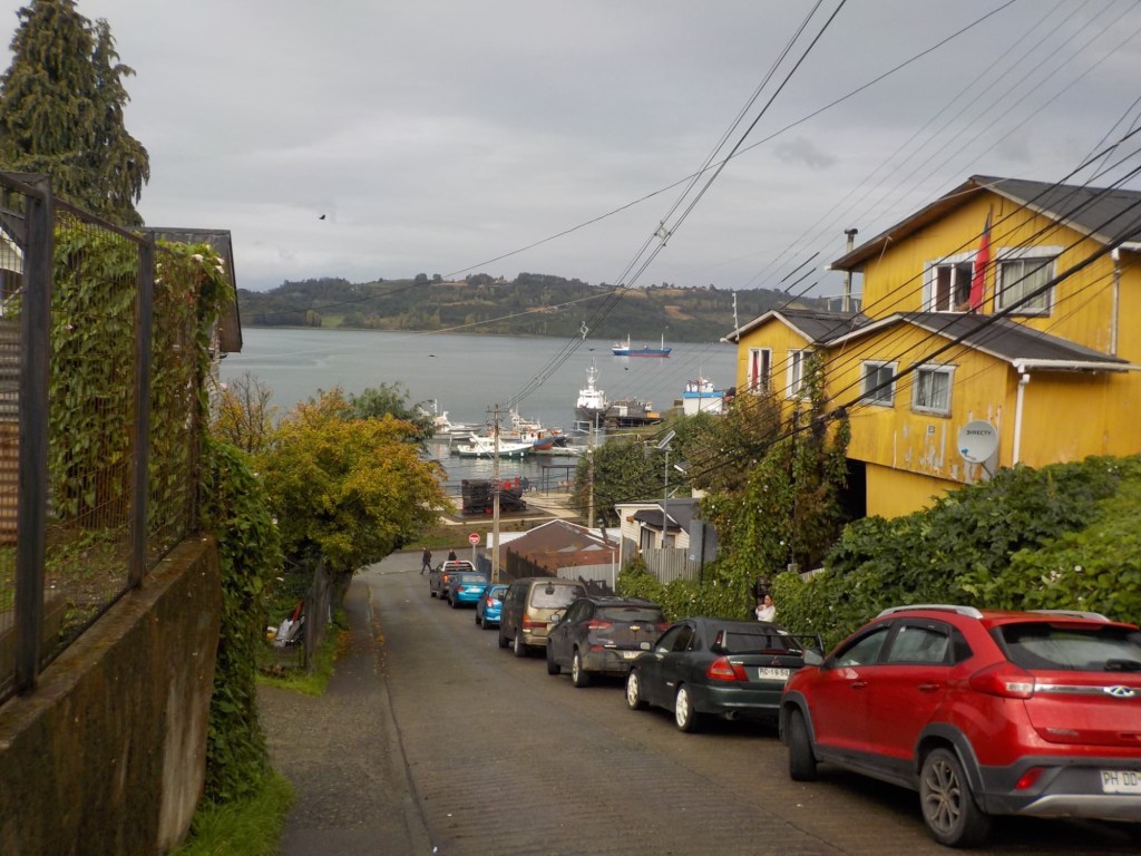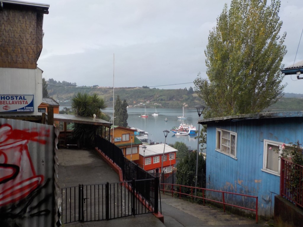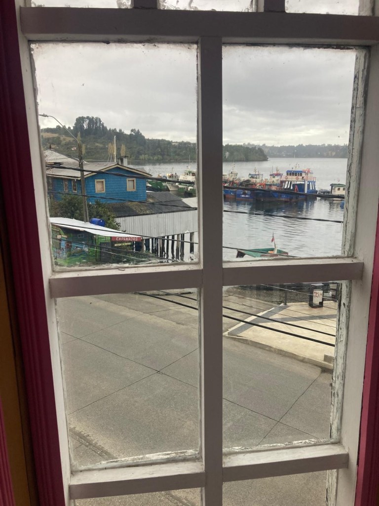 It was a rainy night and we went into the pizzeria for our breakfast and ordered their coffee and tea as it was too wet to fire up our gas stove and there was no shelter over the picnic table at the campsite so everything was very wet. The sun came out eventually and we used the break between showers to pack up and got most of the camping gear pretty dried out and packed. We eventually left well after lunch wearing full wet weather gear and the dirt road out was in surprisingly good condition after all that rain. We rode into and through Cucao to the National Park entry where we turned around and then stopped for a late lunch in one of the restaurants. We both had fresh hake. We continued to Castro where we had booked in a pink hotel for two nights. We arrived and it just started raining again as we unloaded the bikes which were parked in the open carpark next to the hotel. The hotel looked a bit run down and needs a new coat of paint but it had character and reminded me of the Villa Kunterbunt from Pippi Longstocking (book and movies from Astrid Lindgren which I watched as a child but Andrew had not heard about – so we did watch the movie 😉)