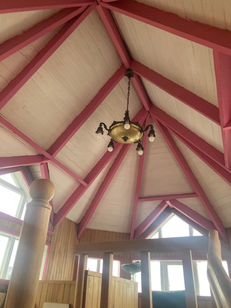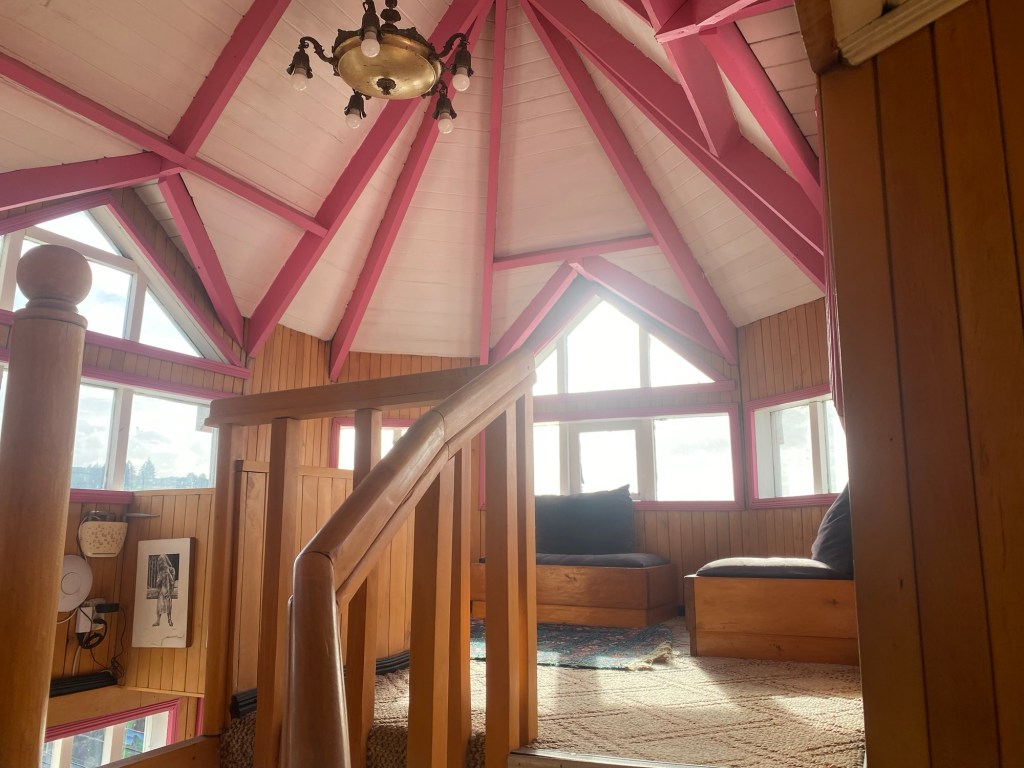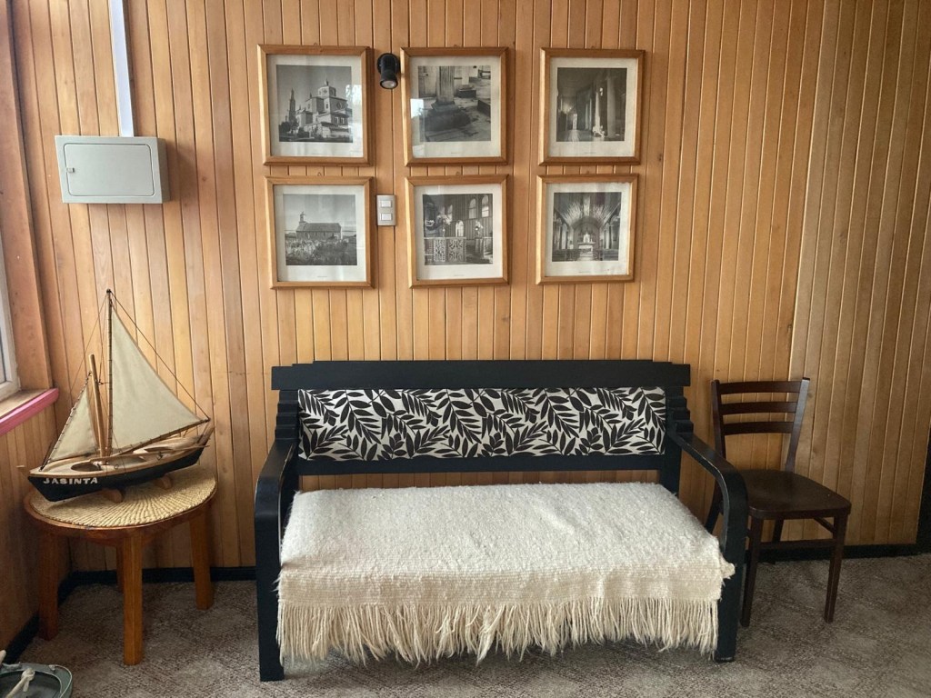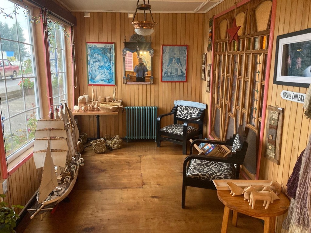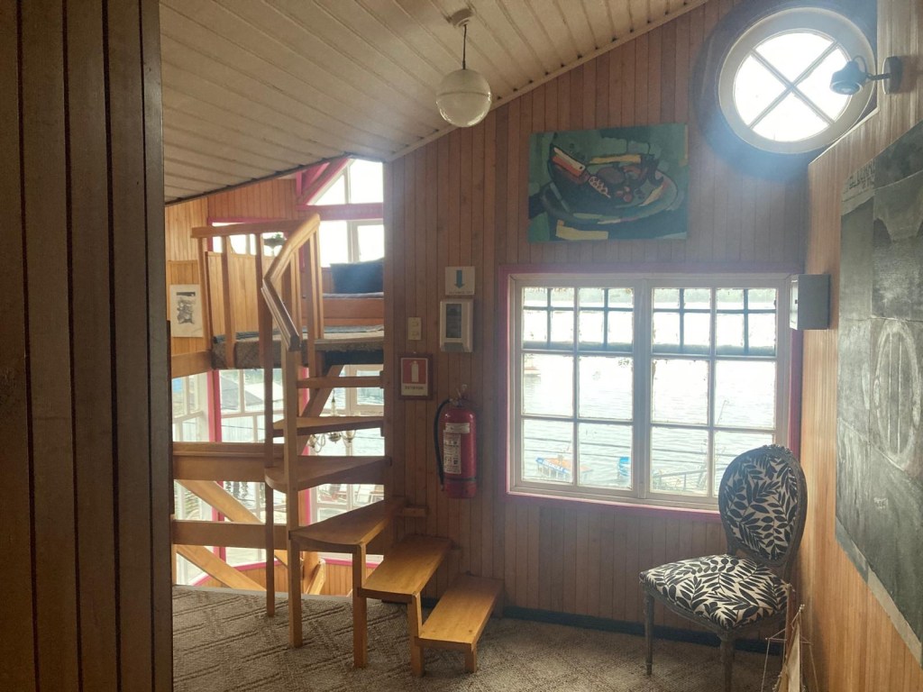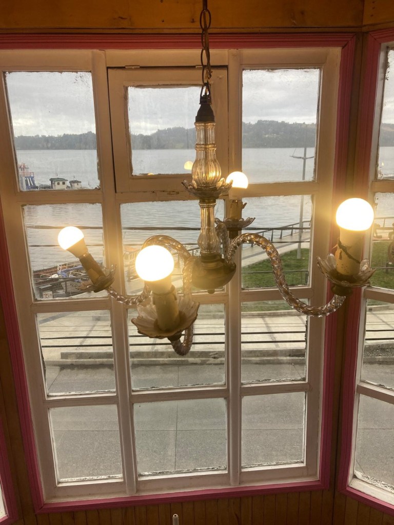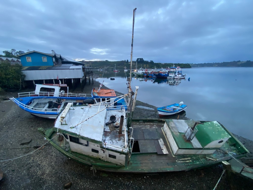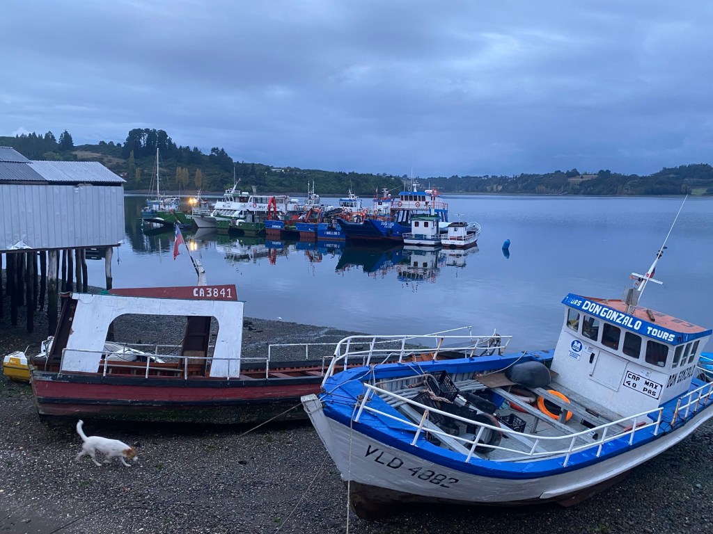 It was a rainy night and we went into the pizzeria for our breakfast and ordered their coffee and tea as it was too wet to fire up our gas stove and there was no shelter over the picnic table at the campsite so everything was very wet. The sun came out eventually and we used the break between showers to pack up and got most of the camping gear pretty dried out and packed. We eventually left well after lunch wearing full wet weather gear and the dirt road out was in surprisingly good condition after all that rain. We rode into and through Cucao to the National Park entry where we turned around and then stopped for a late lunch in one of the restaurants. We both had fresh hake. We continued to Castro where we had booked in a pink hotel for two nights. We arrived and it just started raining again as we unloaded the bikes which were parked in the open carpark next to the hotel. The hotel looked a bit run down and needs a new coat of paint but it had character and reminded me of the Villa Kunterbunt from Pippi Longstocking (book and movies from Astrid Lindgren which I watched as a child but Andrew had not heard about – so we did watch the movie 😉)