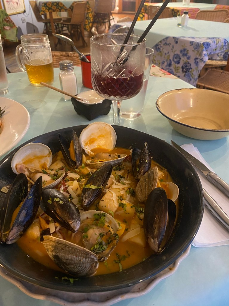 The town felt scetchy and we returned down the hill to a seafood restaurant for dinner – the good place from the night before was closed so we had to try a new place – I had an amazing pot of stewed mussels with homemade gnocchi and Andrew ate a pork dish with red cabbage and apple stew. When we returned to our room, I talked to my daughter and we had a successful 3 way conversation with the insurance company to sort out CTP insurance for my car back in Australia. Andrew edited the GoPro footage for the next blog and then said he was feeling sick and hastily headed for the bathroom – he emptied all of his stomach contents in 3 sessions – we think the pork was either not fully cooked or off- poor Andrew🥺🤮
