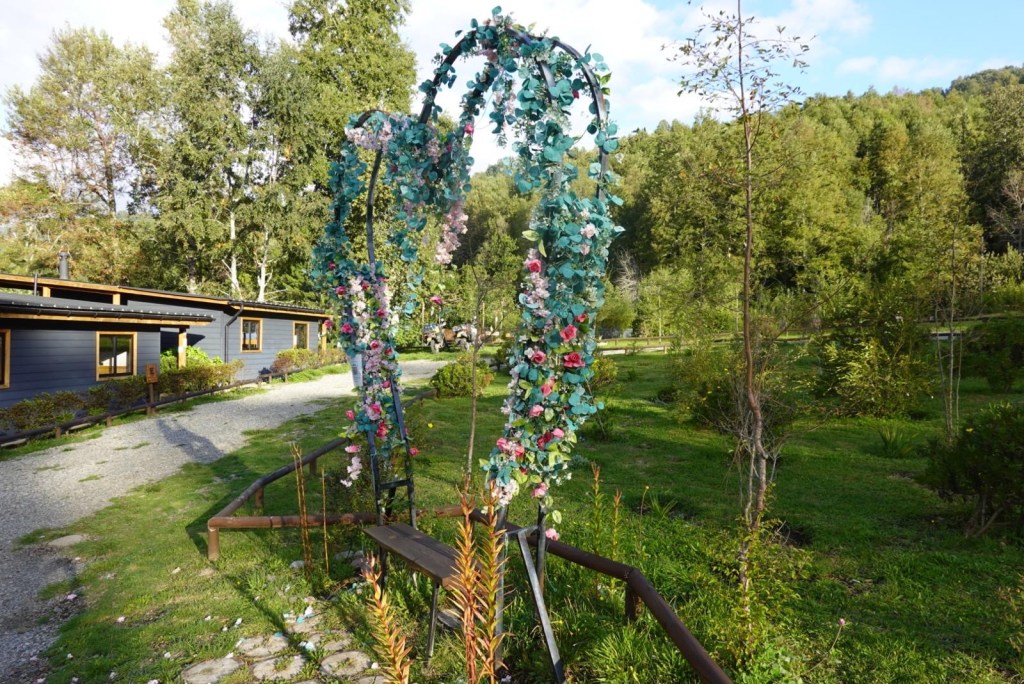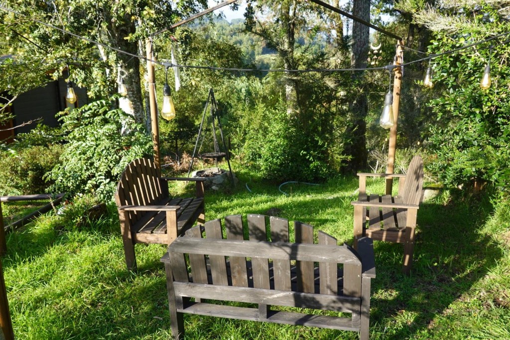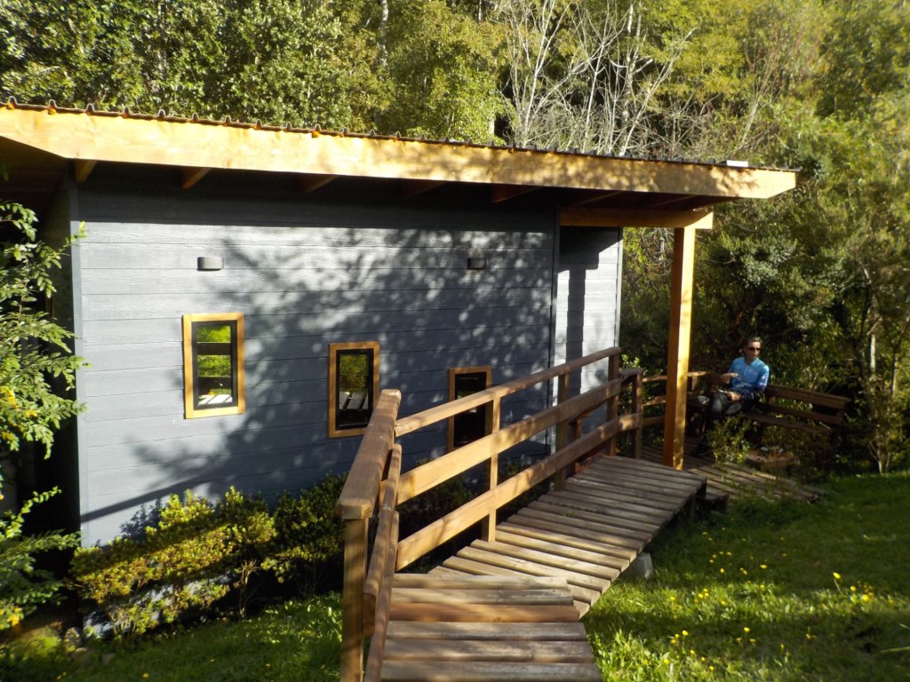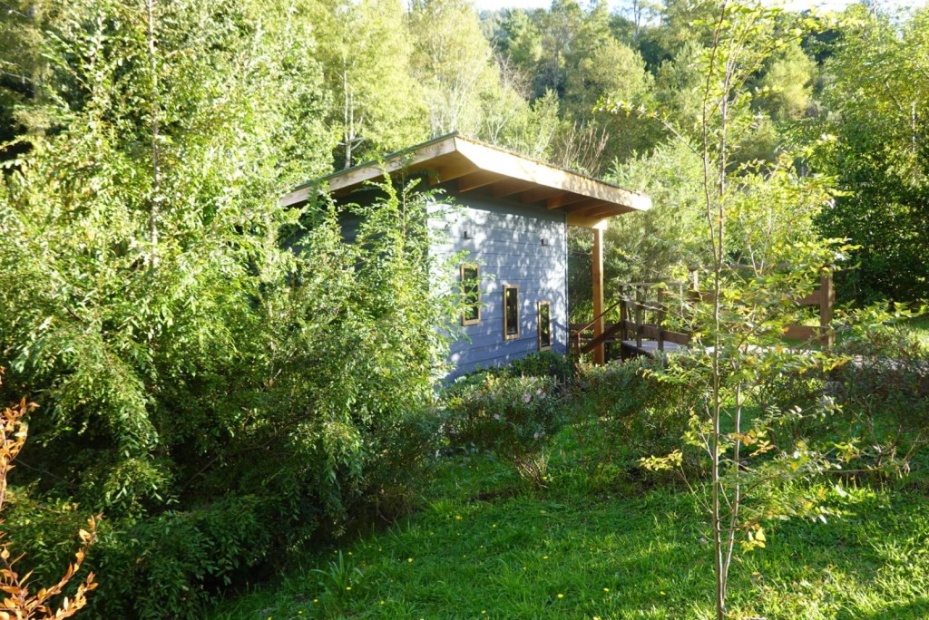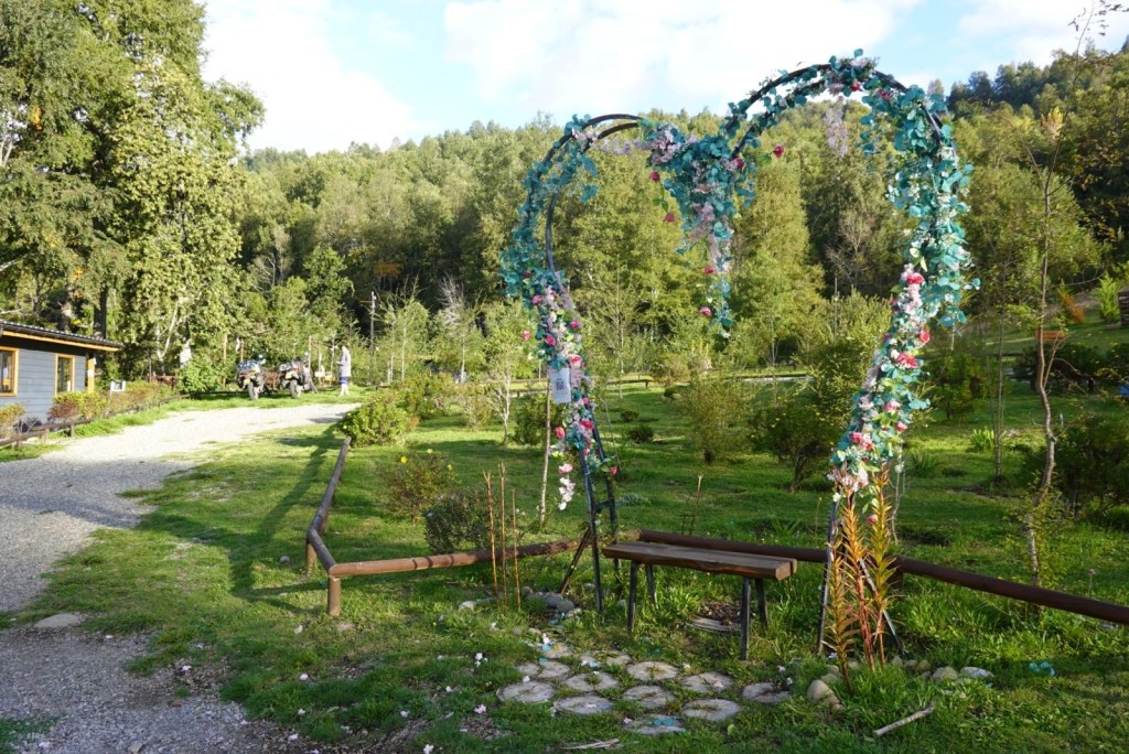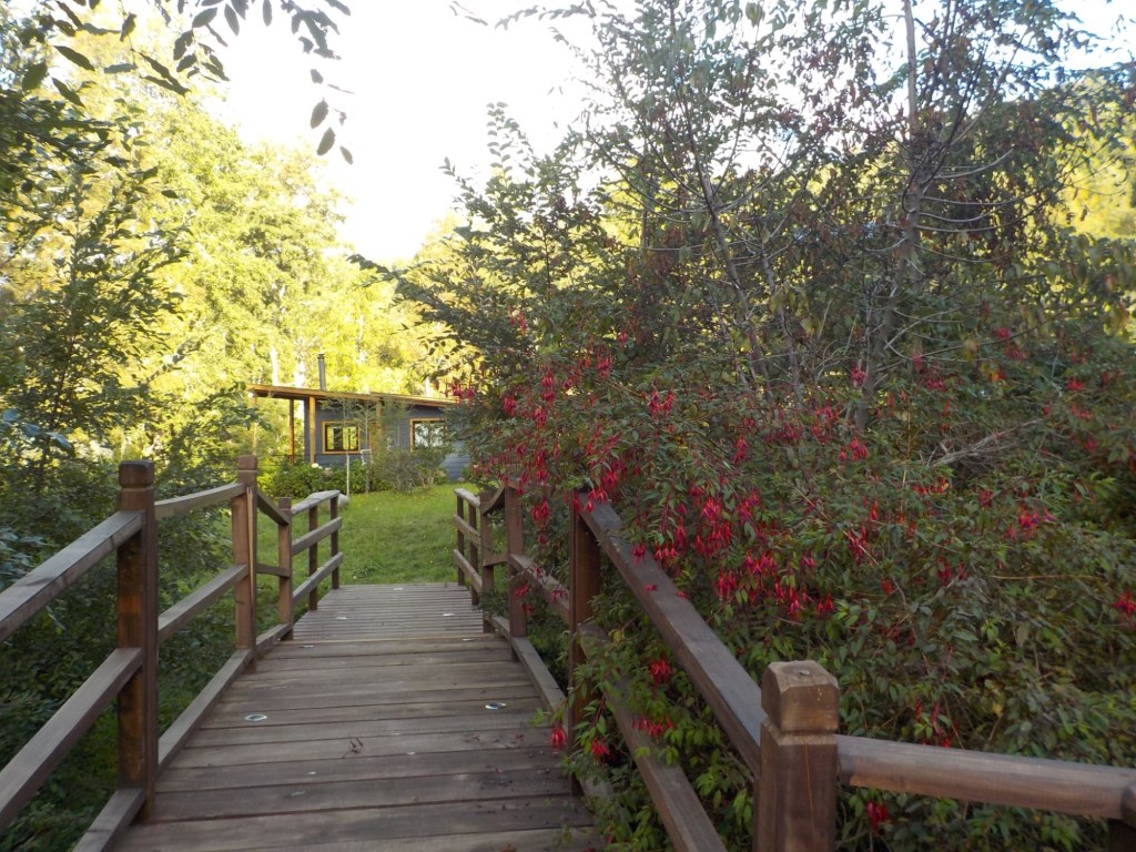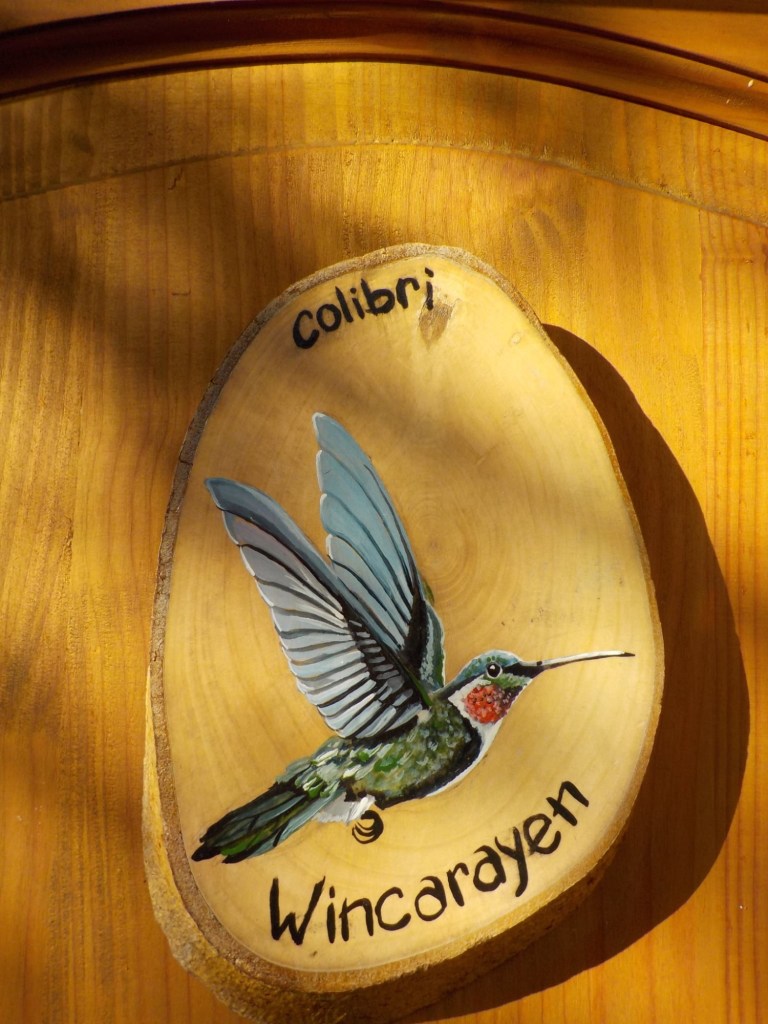 We left the shops, refuelled and hoped to find a nice place by the lake to have our bread rolls but in Panguipulli at the waterfront was no parking and we continued to Mirador Pulinque where we stopped briefly and then decided to continue straight to the Cabañas only a few minutes further. We turned at a sign of a Mapuche comunidad, up a steep gravel road and the cabanas were behind a locked gate. We waited until Hernán came to open the gates and we rode to where Valentina showed us to park the bikes. They welcomed us warmly and showed us our Cabaña which had a large window looking over the forest and was built over a stream and you could hear flowing water underneath. We had arranged for them to get an outdoor hot tub ready for us for the evening – same style as we did not get to use in Chaitén with the unfriendly old grumpy lady. It took 6-8 hours to get the water heated with a wood-fired stove. We unpacked and had our lunch outside and walked around the lovely garden and I found another Fuchsia bush with hummingbirds which they call “colibri” – same as the German word and I took more video footage – they are becoming my favourite birds on the trip so far – together with the pink flamingoes 🤗 And I am yet to see one of the colourful kingfishers🤞.
