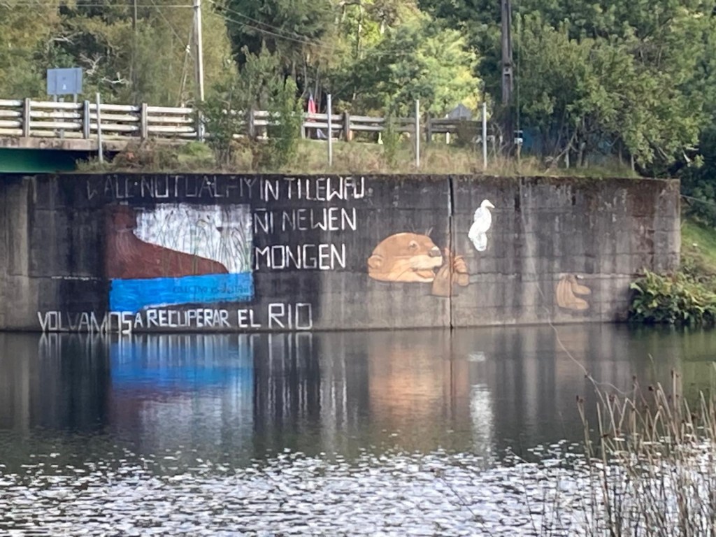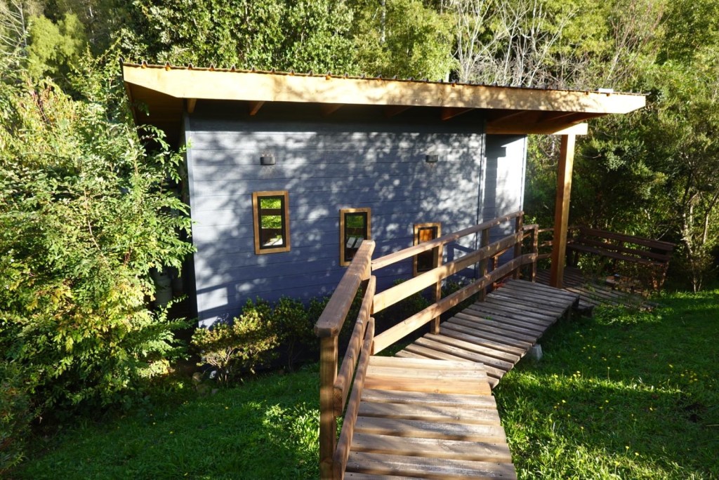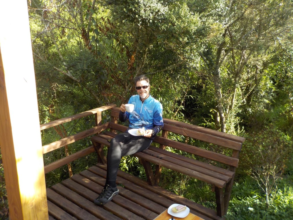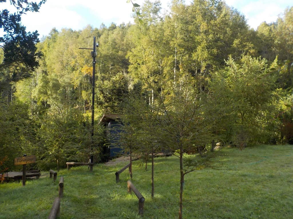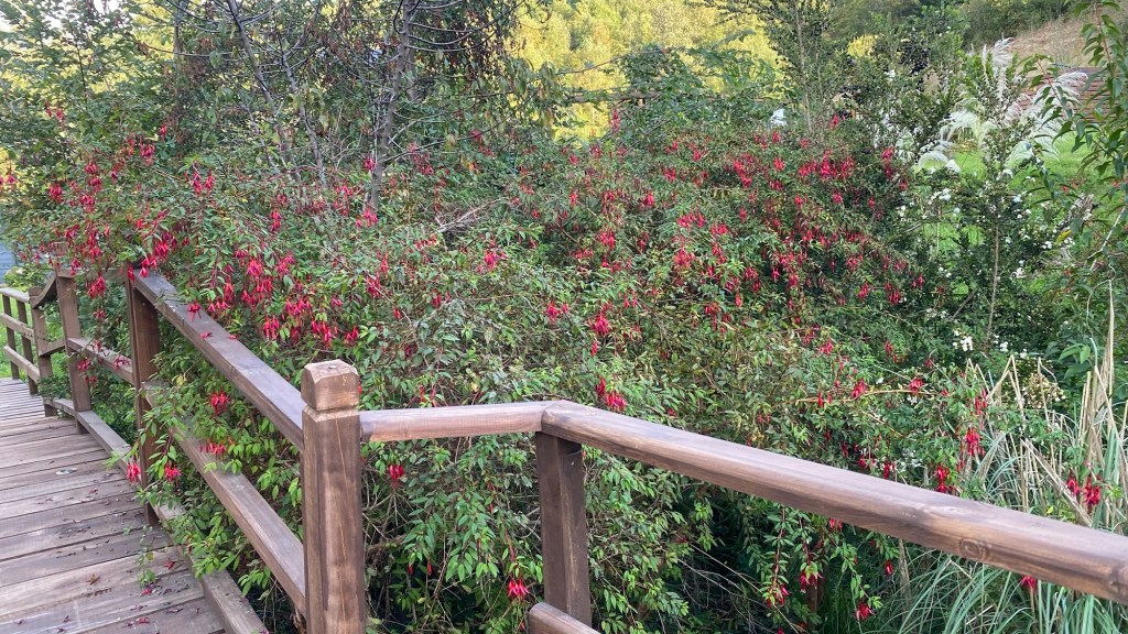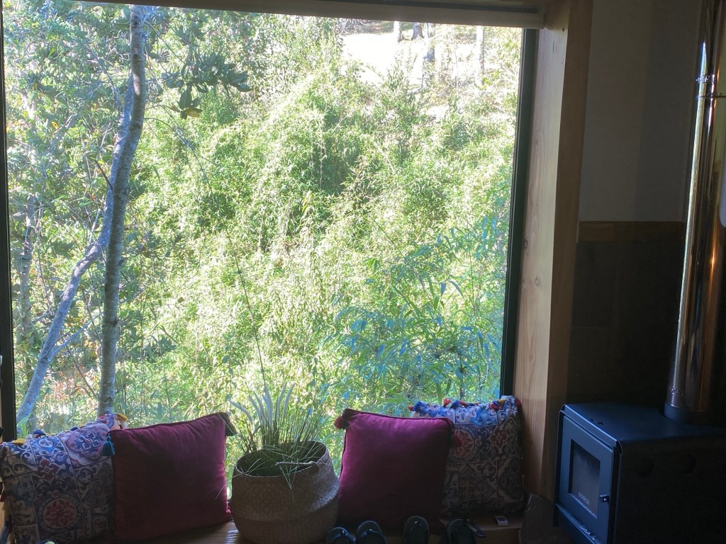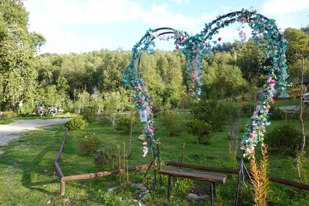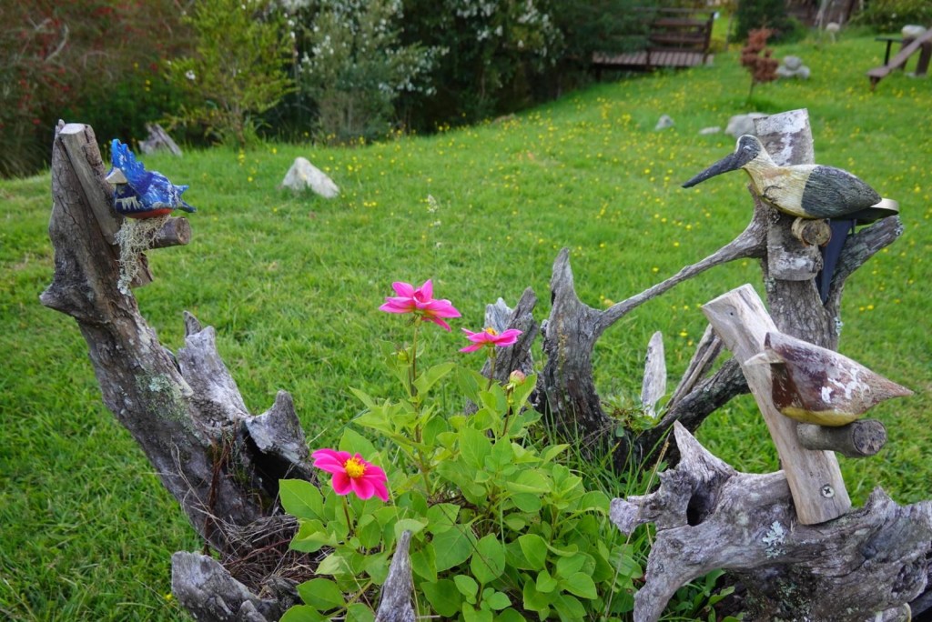 We left the shops, refuelled and hoped to find a nice place by the lake to have our bread rolls but in Panguipulli at the waterfront was no parking and we continued to Mirador Pulinque where we stopped briefly and then decided to continue straight to the Cabañas only a few minutes further. We turned at a sign of a Mapuche comunidad, up a steep gravel road and the cabanas were behind a locked gate. We waited until Hernán came to open the gates and we rode to where Valentina showed us to park the bikes. They welcomed us warmly and showed us our Cabaña which had a large window looking over the forest and was built over a stream and you could hear flowing water underneath. We had arranged for them to get an outdoor hot tub ready for us for the evening – same style as we did not get to use in Chaitén with the unfriendly old grumpy lady. It took 6-8 hours to get the water heated with a wood-fired stove. We unpacked and had our lunch outside and walked around the lovely garden and I found another Fuchsia bush with hummingbirds which they call “colibri” – same as the German word and I took more video footage – they are becoming my favourite birds on the trip so far – together with the pink flamingoes 🤗 And I am yet to see one of the colourful kingfishers🤞.
