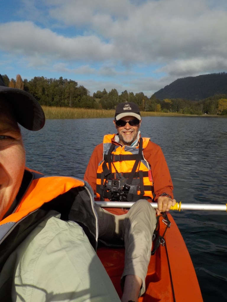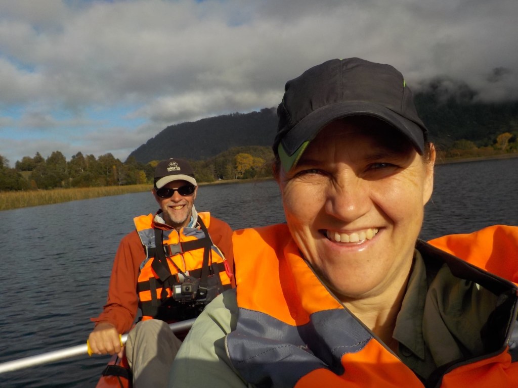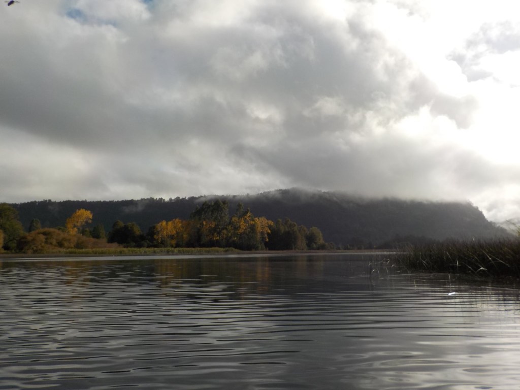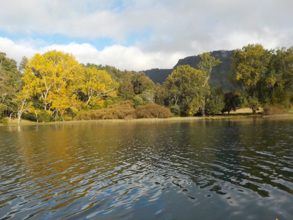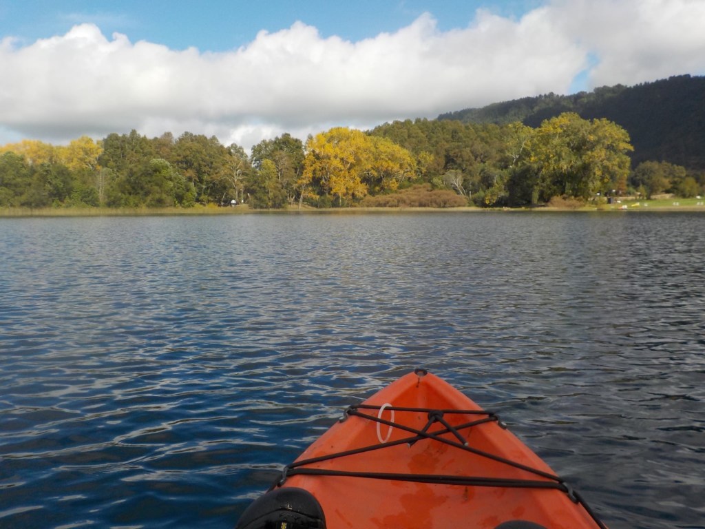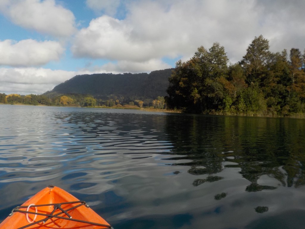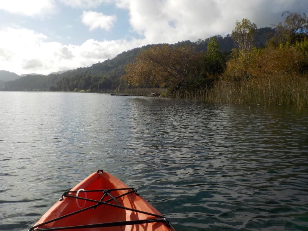 After breakfast, we got a lift in the Ute of our hosts to the same lookout where we had stopped on our way to the Cabañas the day before where we put the open double kayak in the water. We had two hours to explore the lake on our own. It was magical with steam rising over the lake, autumn coloured leaves falling and we really enjoyed the two hours on the water. We paddled 6km in total and made it a fair way across the lake and we managed to get a glimpse of the top of volcan Villarrica when the clouds lifted enough to briefly see the peak. We were back by 12:00 noon and our lovely hosts came to pick us up.