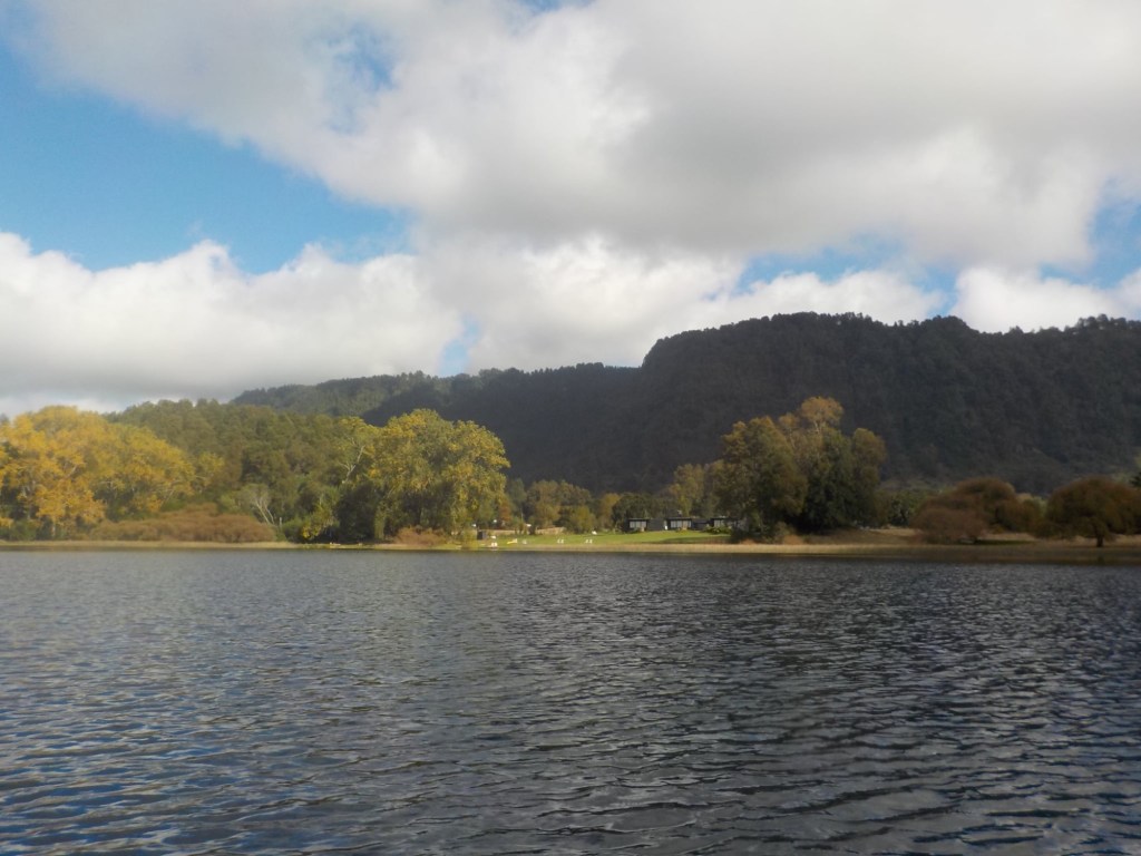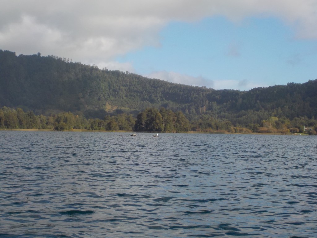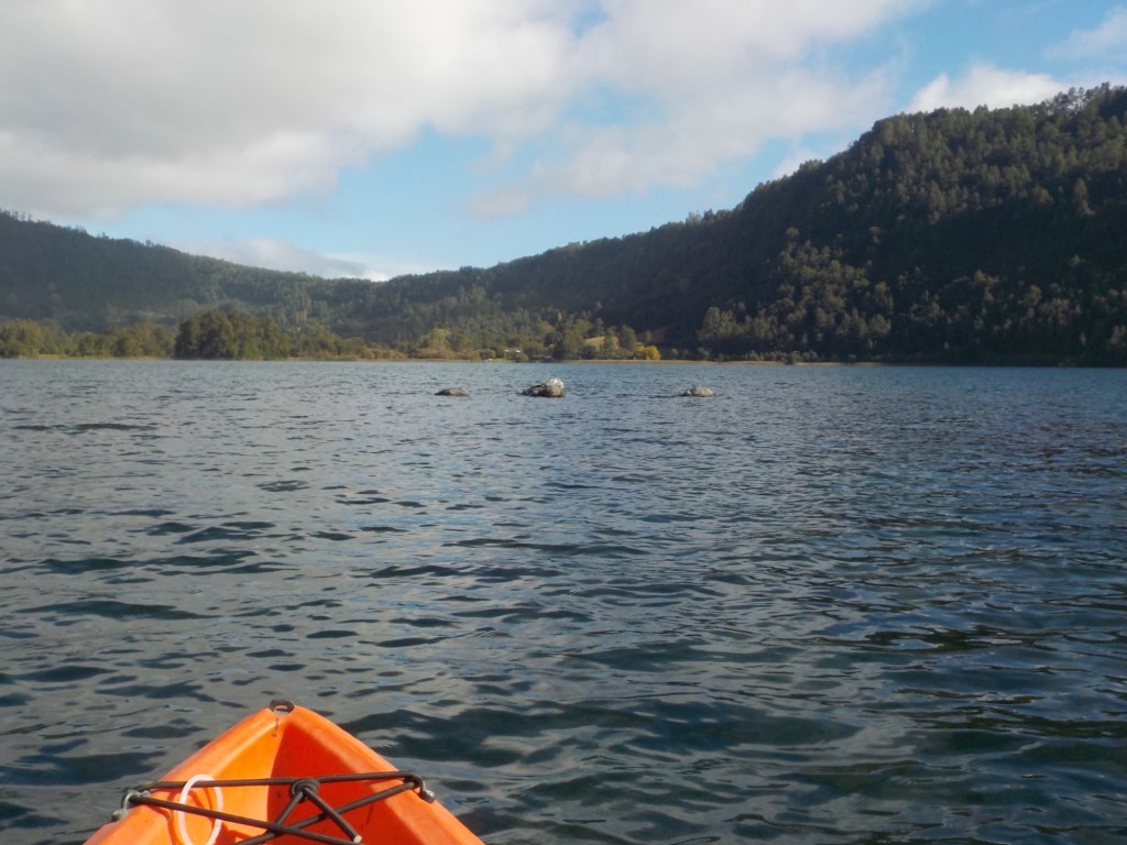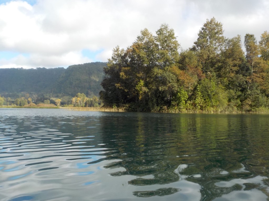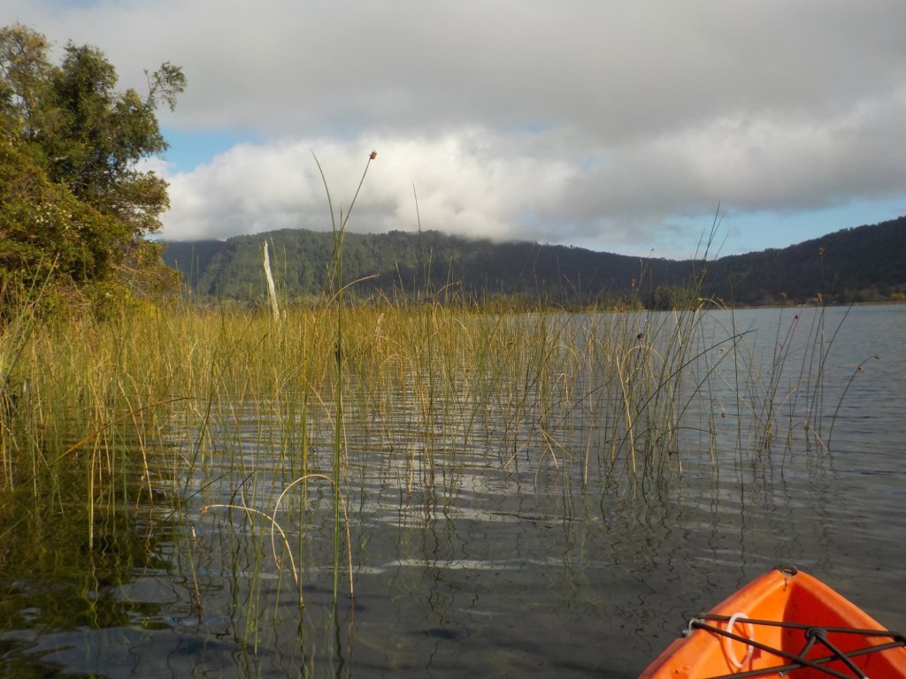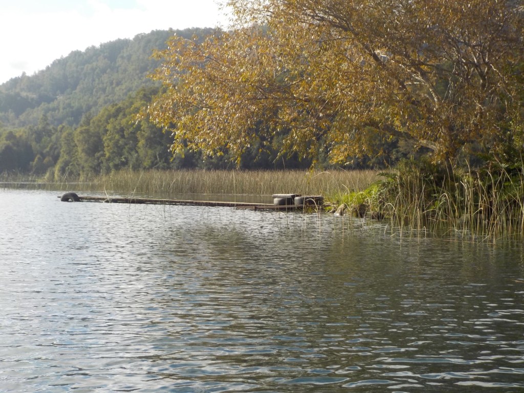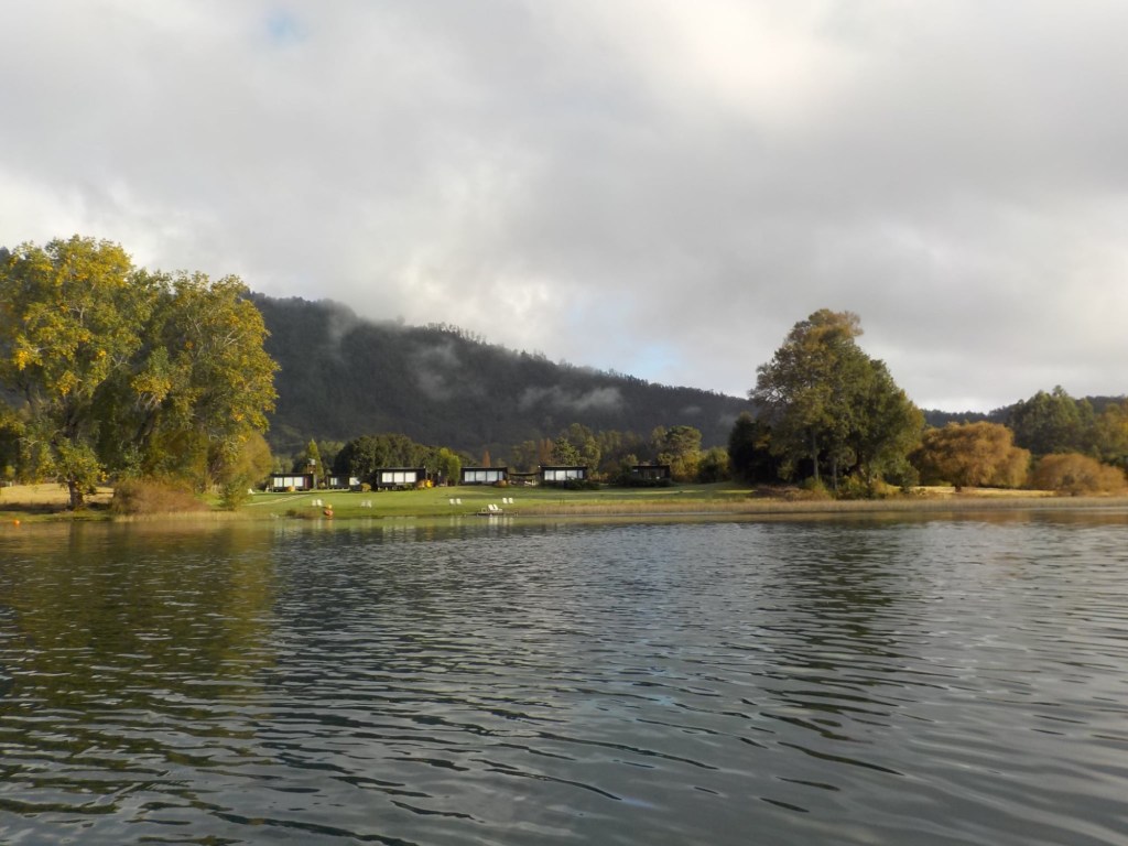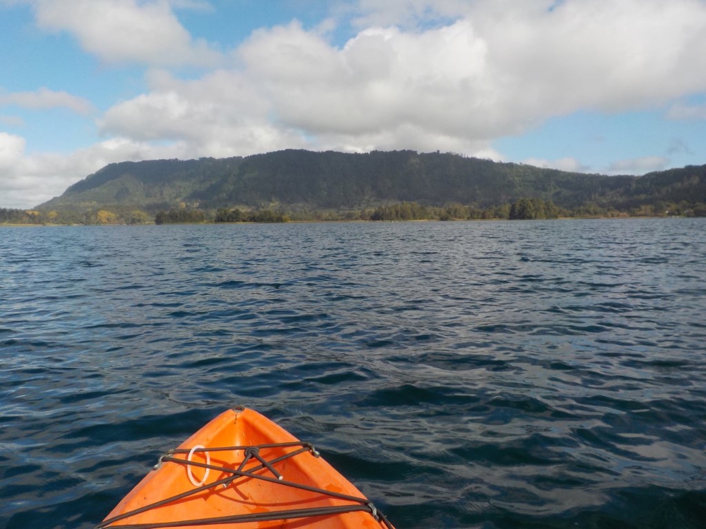 After breakfast, we got a lift in the Ute of our hosts to the same lookout where we had stopped on our way to the Cabañas the day before where we put the open double kayak in the water. We had two hours to explore the lake on our own. It was magical with steam rising over the lake, autumn coloured leaves falling and we really enjoyed the two hours on the water. We paddled 6km in total and made it a fair way across the lake and we managed to get a glimpse of the top of volcan Villarrica when the clouds lifted enough to briefly see the peak. We were back by 12:00 noon and our lovely hosts came to pick us up.