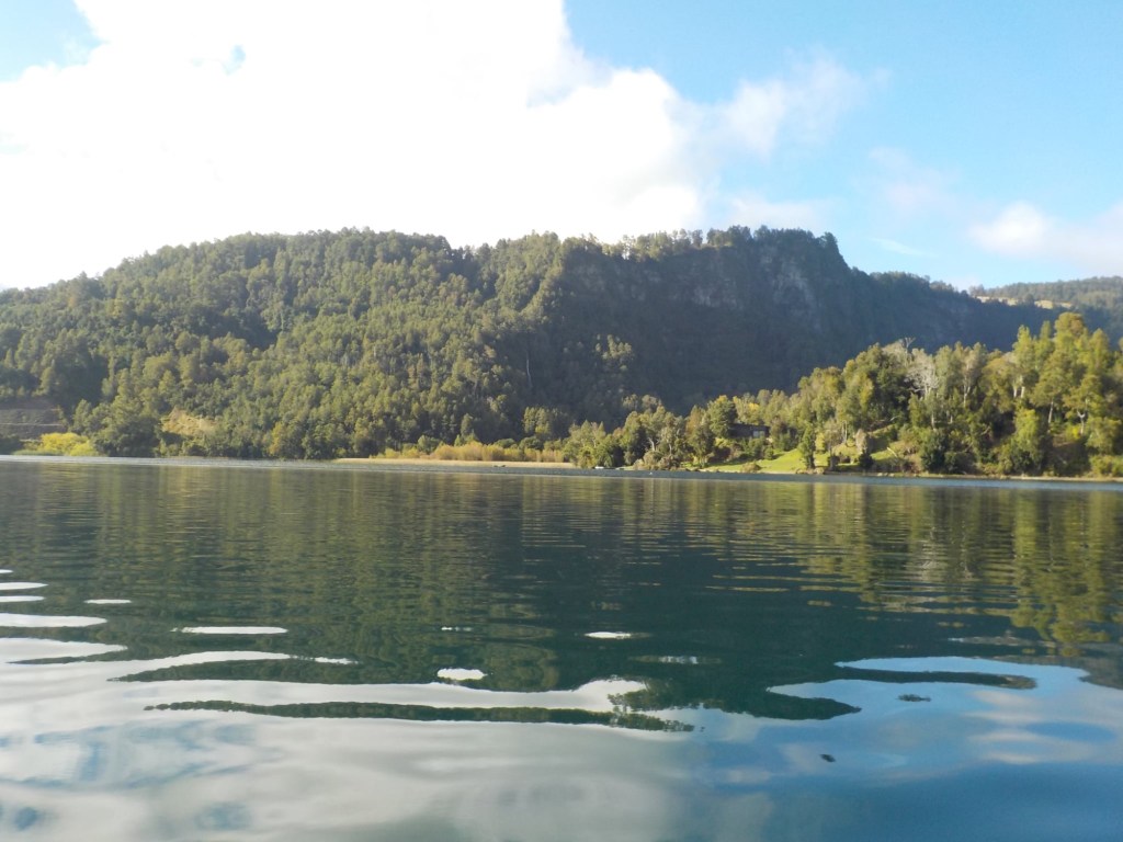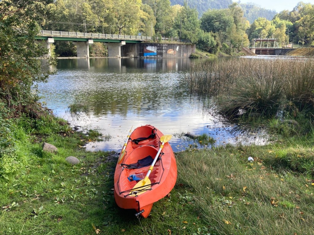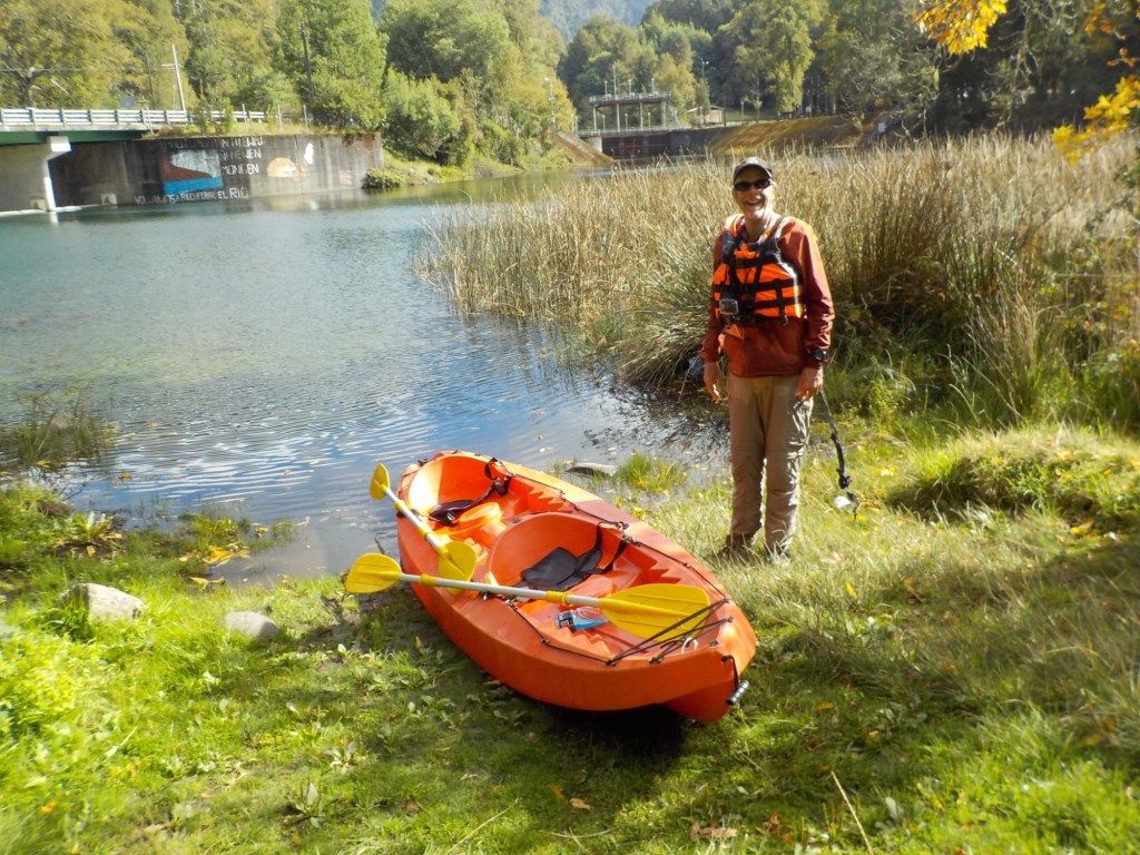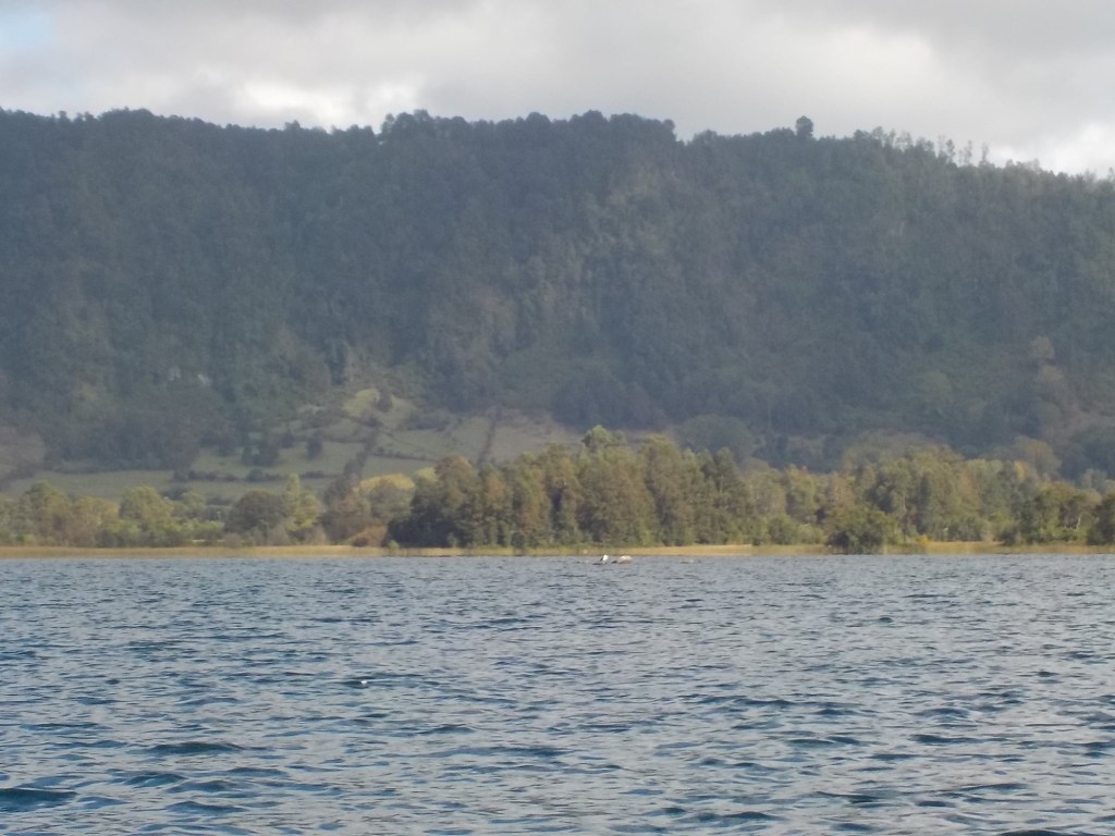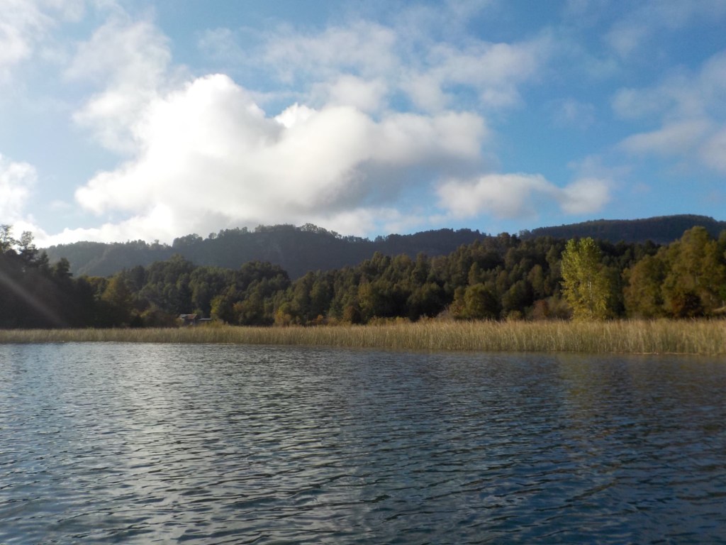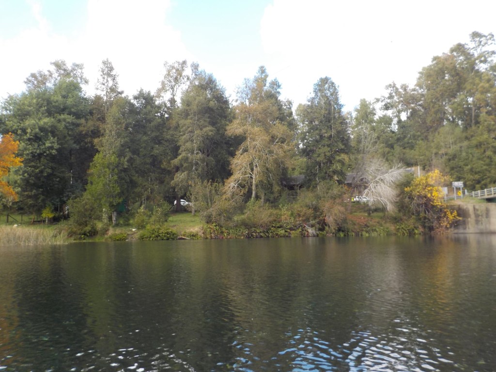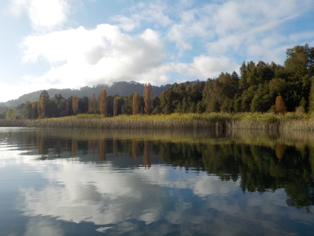 After breakfast, we got a lift in the Ute of our hosts to the same lookout where we had stopped on our way to the Cabañas the day before where we put the open double kayak in the water. We had two hours to explore the lake on our own. It was magical with steam rising over the lake, autumn coloured leaves falling and we really enjoyed the two hours on the water. We paddled 6km in total and made it a fair way across the lake and we managed to get a glimpse of the top of volcan Villarrica when the clouds lifted enough to briefly see the peak. We were back by 12:00 noon and our lovely hosts came to pick us up.