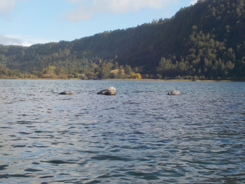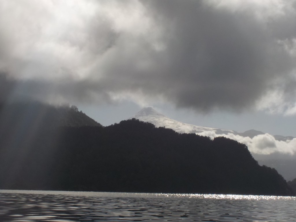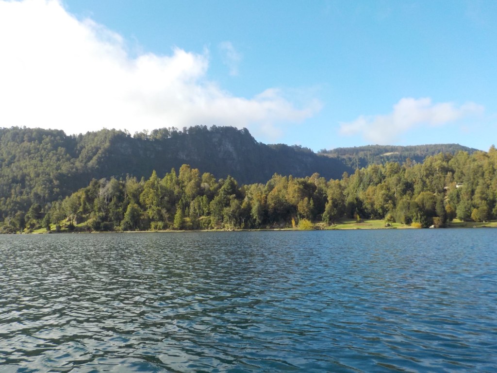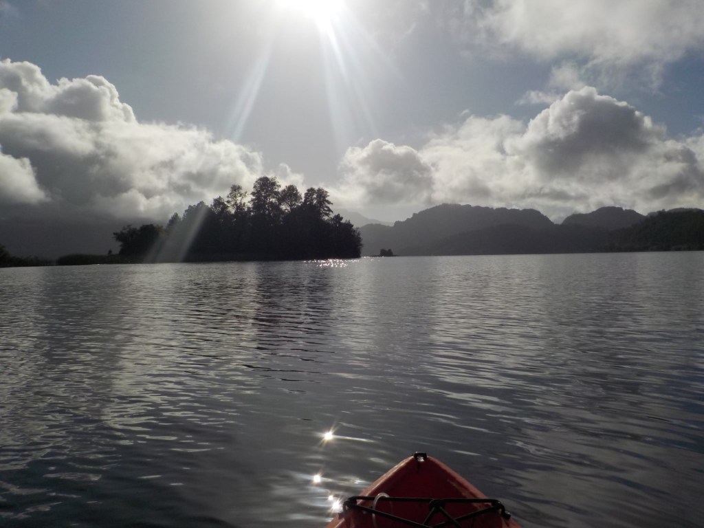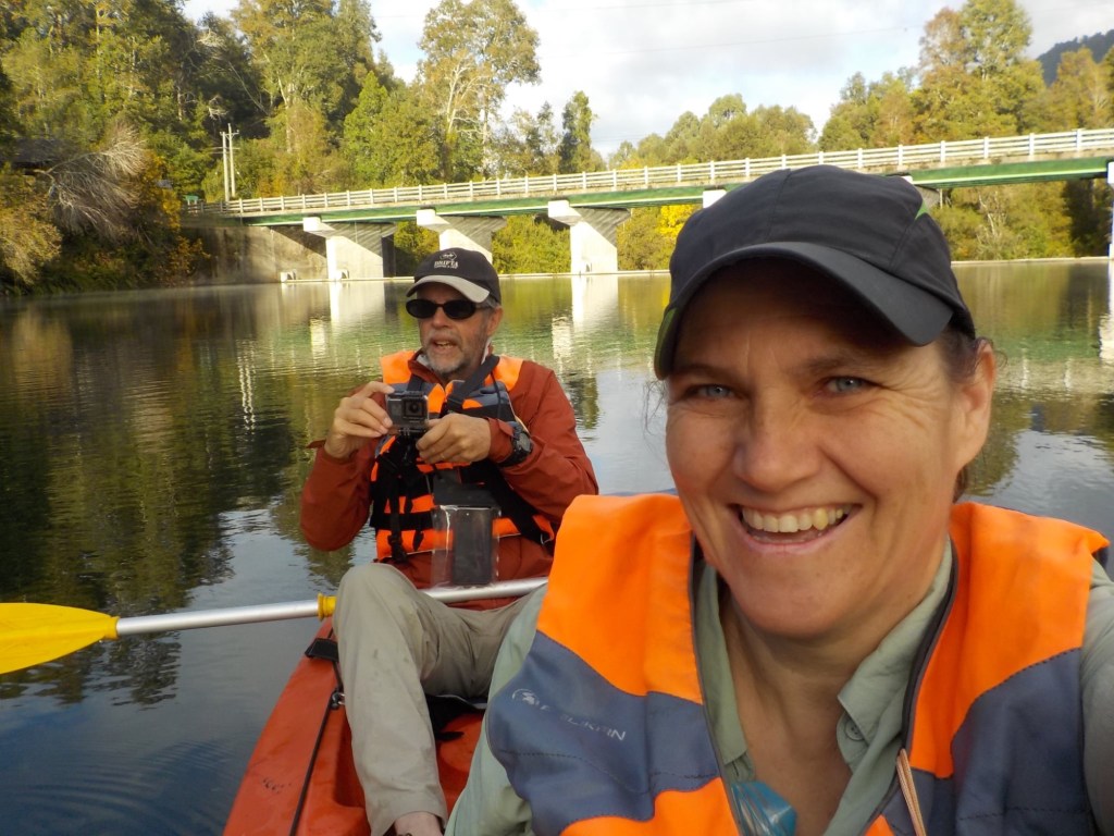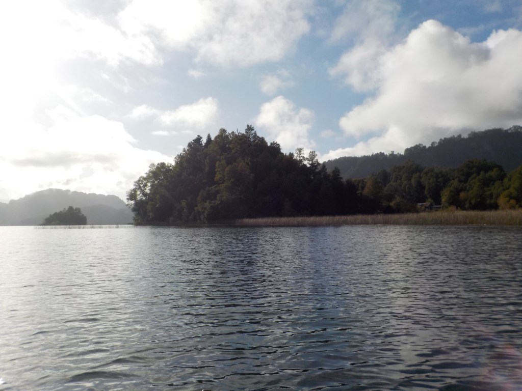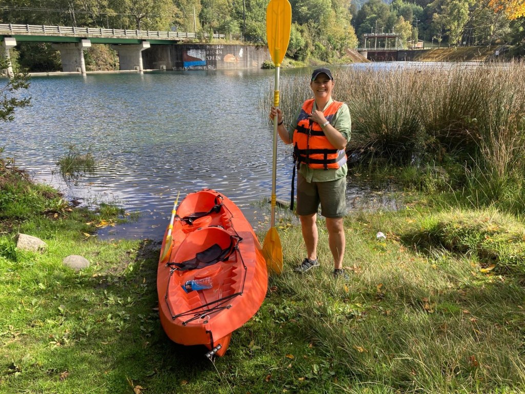 After breakfast, we got a lift in the Ute of our hosts to the same lookout where we had stopped on our way to the Cabañas the day before where we put the open double kayak in the water. We had two hours to explore the lake on our own. It was magical with steam rising over the lake, autumn coloured leaves falling and we really enjoyed the two hours on the water. We paddled 6km in total and made it a fair way across the lake and we managed to get a glimpse of the top of volcan Villarrica when the clouds lifted enough to briefly see the peak. We were back by 12:00 noon and our lovely hosts came to pick us up.
