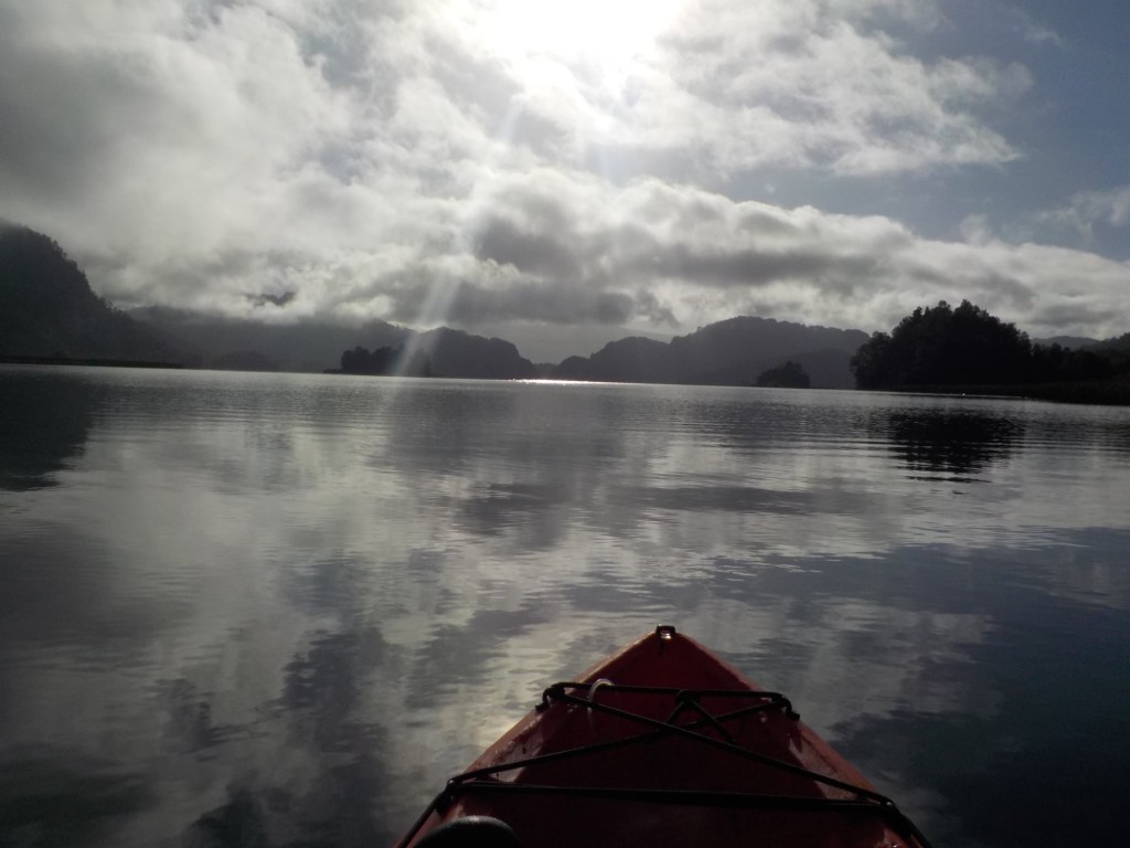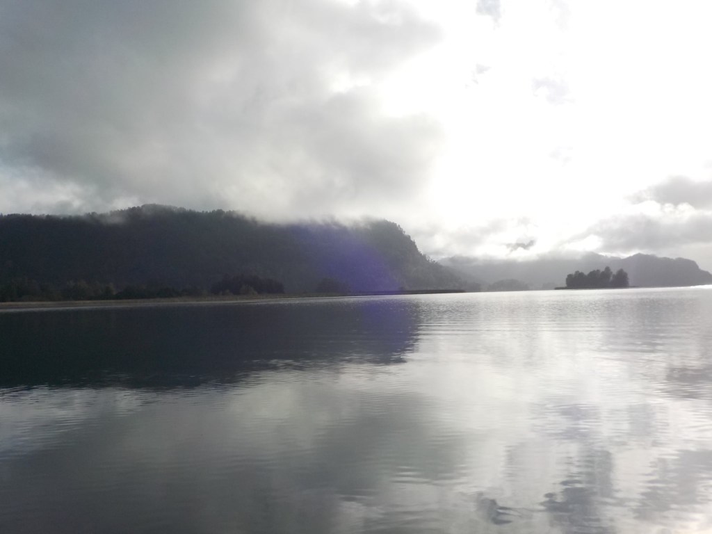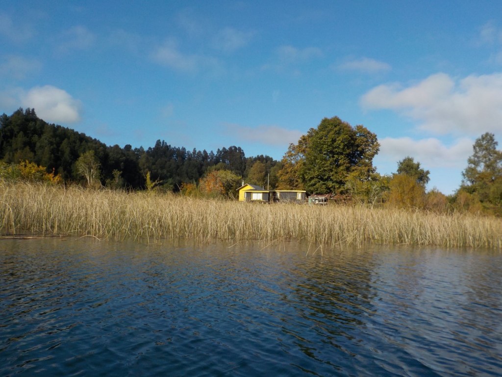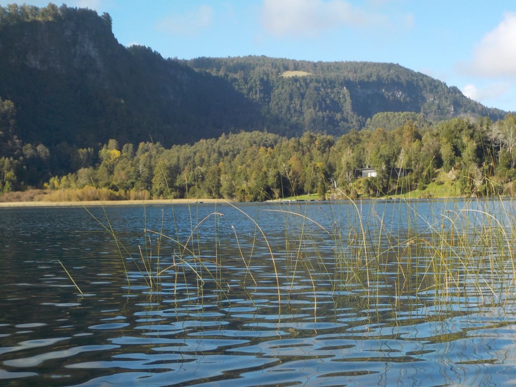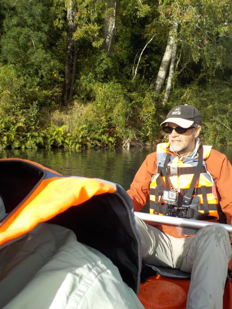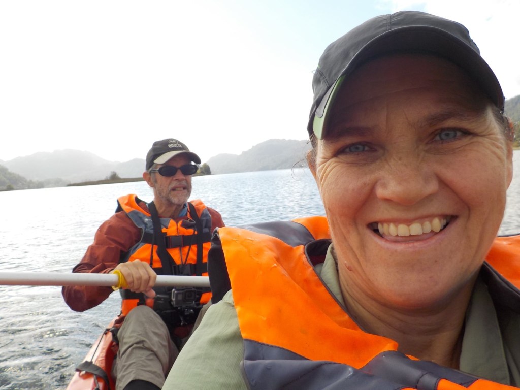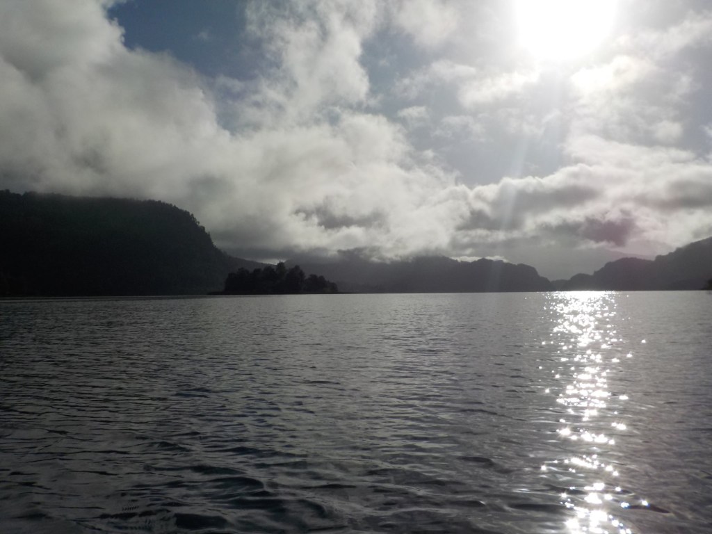 After breakfast, we got a lift in the Ute of our hosts to the same lookout where we had stopped on our way to the Cabañas the day before where we put the open double kayak in the water. We had two hours to explore the lake on our own. It was magical with steam rising over the lake, autumn coloured leaves falling and we really enjoyed the two hours on the water. We paddled 6km in total and made it a fair way across the lake and we managed to get a glimpse of the top of volcan Villarrica when the clouds lifted enough to briefly see the peak. We were back by 12:00 noon and our lovely hosts came to pick us up.
