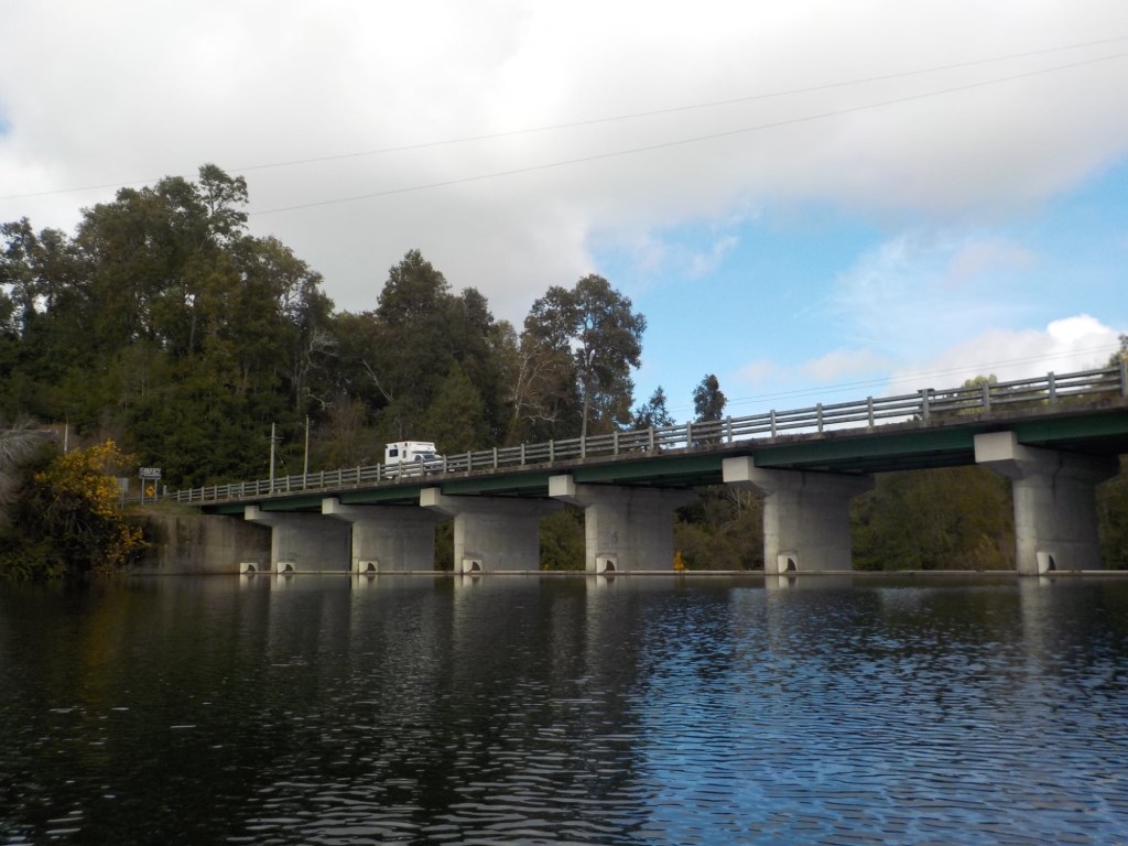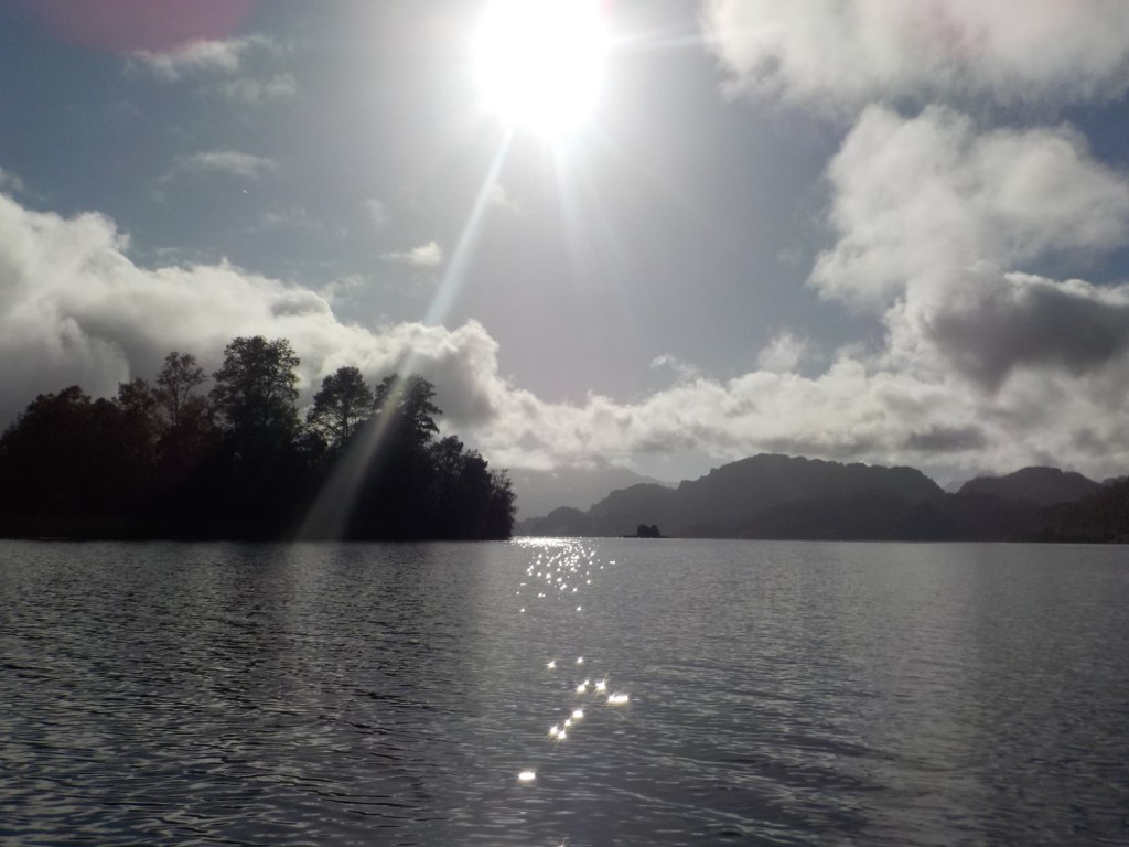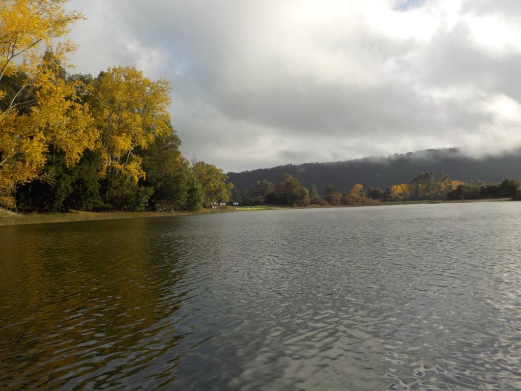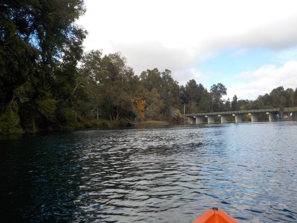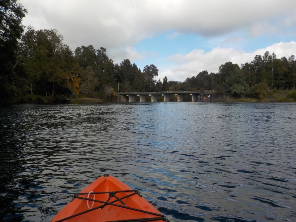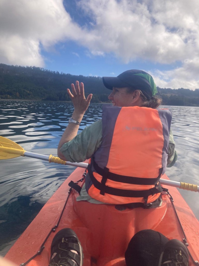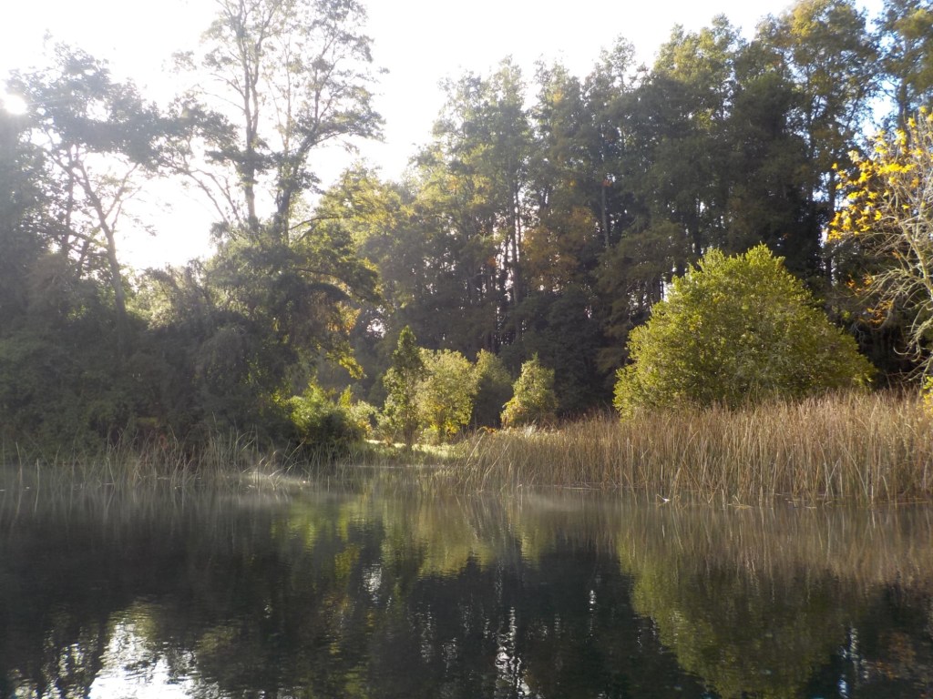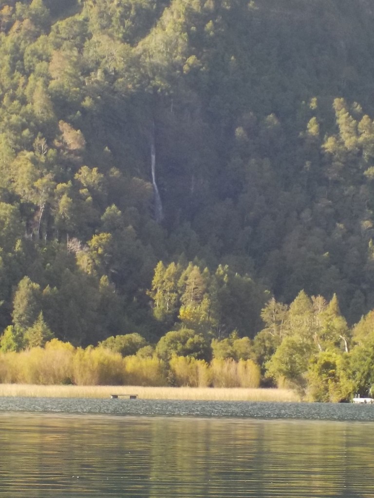 After breakfast, we got a lift in the Ute of our hosts to the same lookout where we had stopped on our way to the Cabañas the day before where we put the open double kayak in the water. We had two hours to explore the lake on our own. It was magical with steam rising over the lake, autumn coloured leaves falling and we really enjoyed the two hours on the water. We paddled 6km in total and made it a fair way across the lake and we managed to get a glimpse of the top of volcan Villarrica when the clouds lifted enough to briefly see the peak. We were back by 12:00 noon and our lovely hosts came to pick us up.
