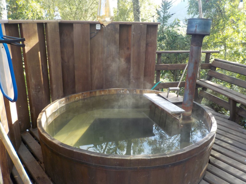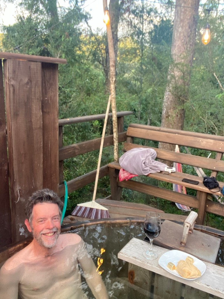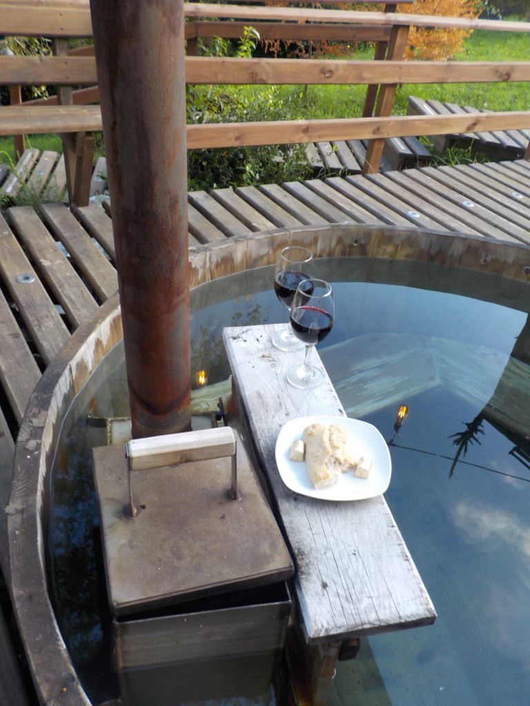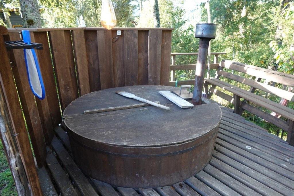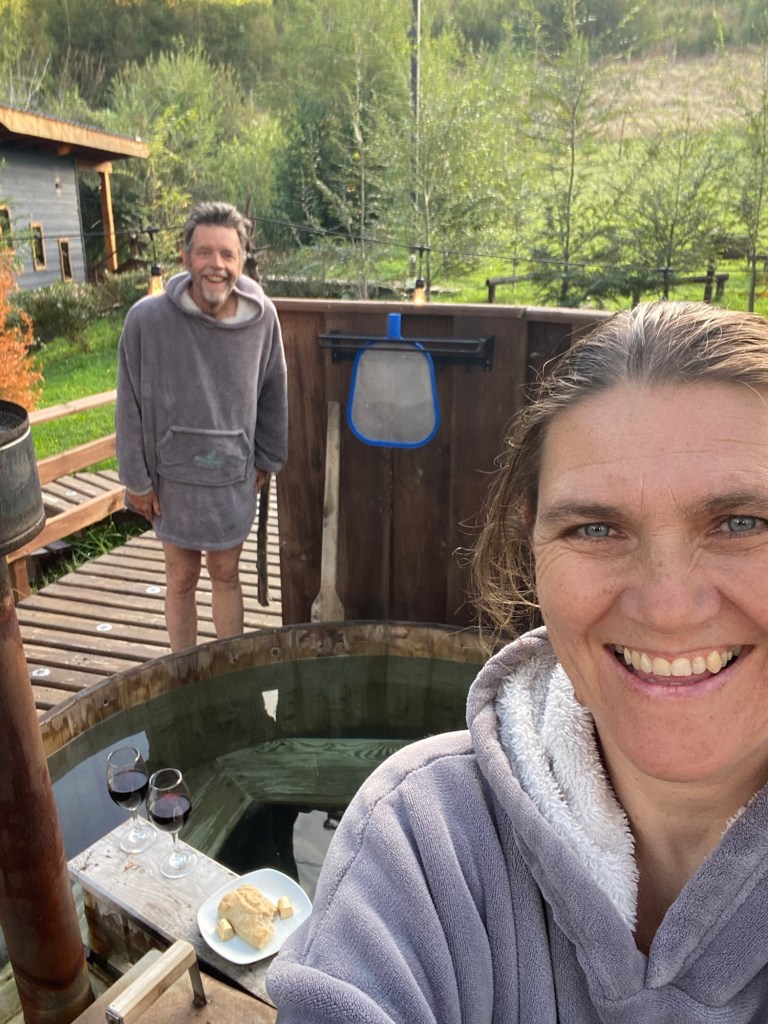 We then went to the hot tub in their nice and warm hoodies and slippers they provide and had to put quite a bit of extra cold water in before we managed to get in – it was so hot that our skin turned very red 😂 but we got the temperature right and enjoyed the hot tub until the late evening when the full moon was out – so relaxing and wonderful and we had the place to ourselves – no other guests. Hernán came and lit the wood fired stove for us in the Cabaña and we quickly decided that we would stay a second night here and also organised kayaking for the next morning at 9:00 am with our lovely hosts.