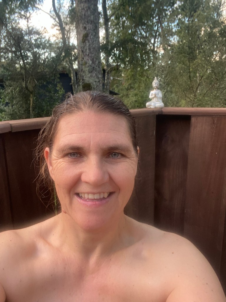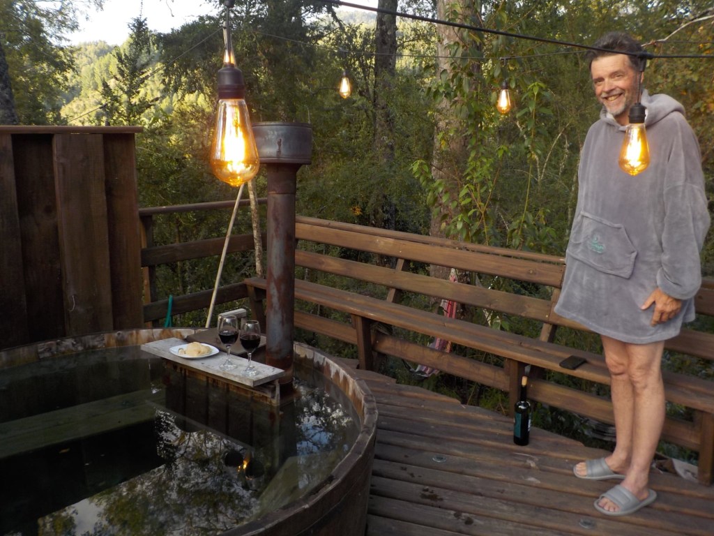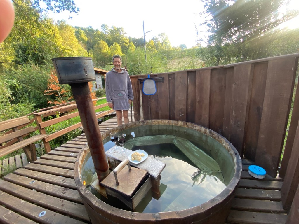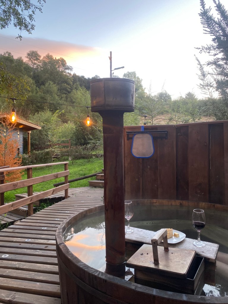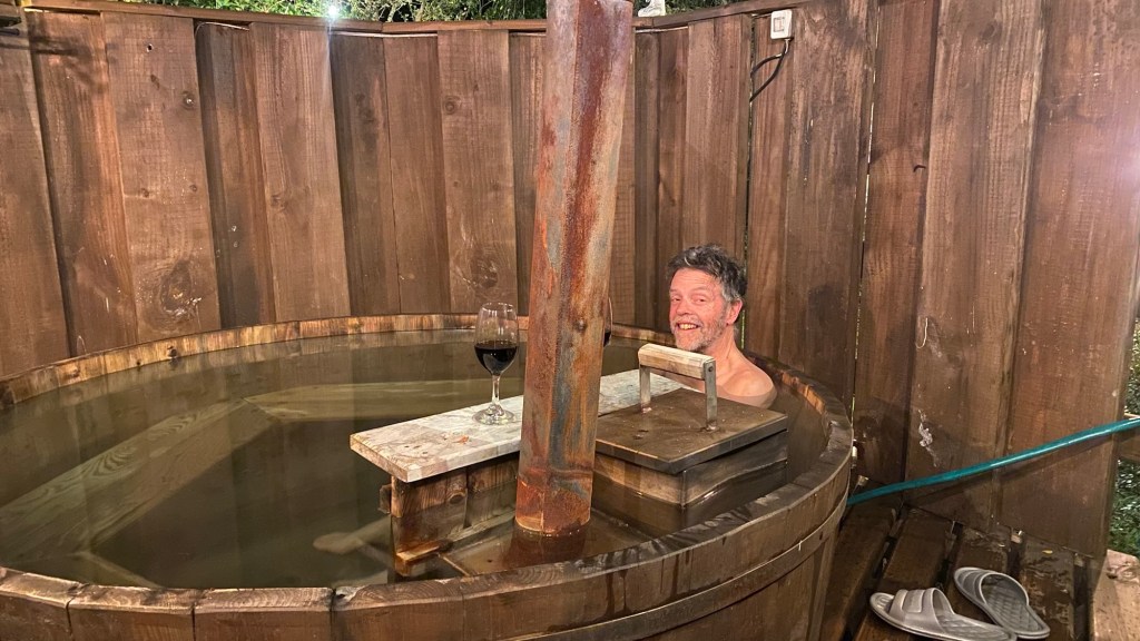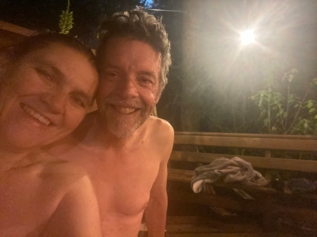 We then went to the hot tub in their nice and warm hoodies and slippers they provide and had to put quite a bit of extra cold water in before we managed to get in – it was so hot that our skin turned very red 😂 but we got the temperature right and enjoyed the hot tub until the late evening when the full moon was out – so relaxing and wonderful and we had the place to ourselves – no other guests. Hernán came and lit the wood fired stove for us in the Cabaña and we quickly decided that we would stay a second night here and also organised kayaking for the next morning at 9:00 am with our lovely hosts.