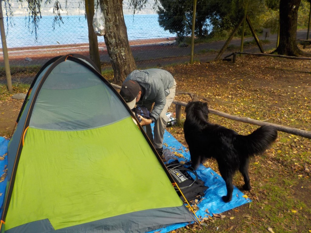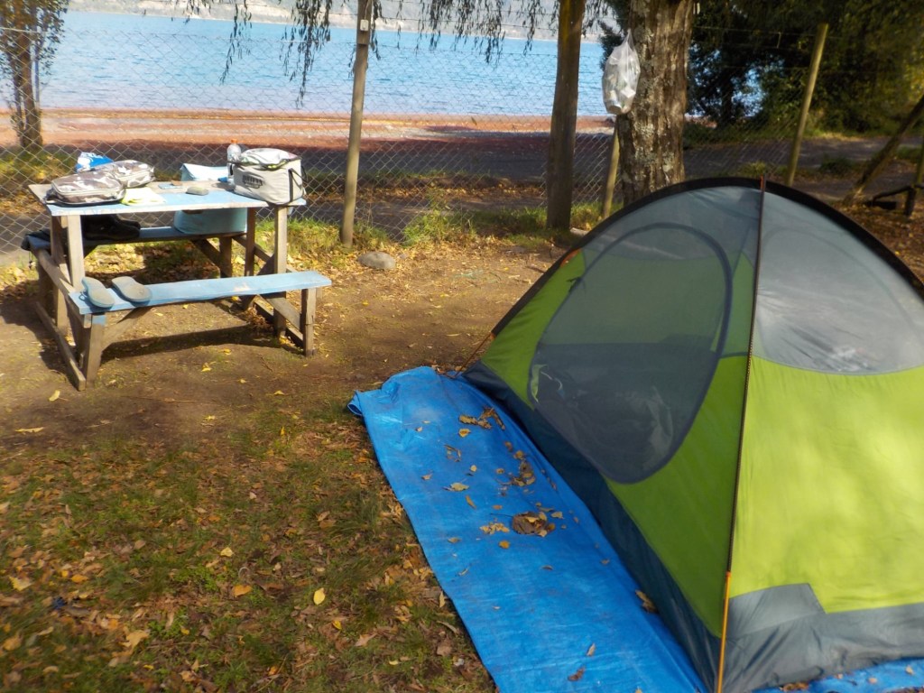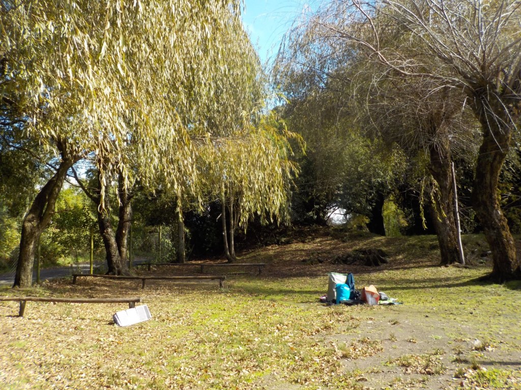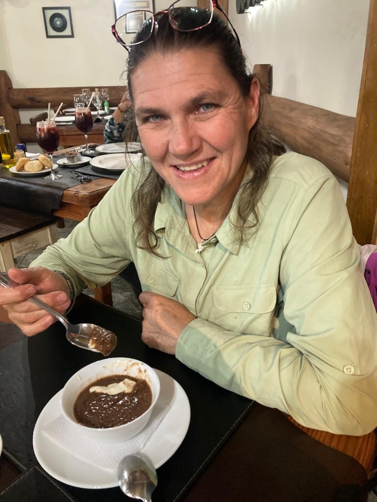We tried to get going and pack up in the morning, but there was a lot of dew and the tent was very wet. We took our time drying everything before packing it up and Andrew was not feeling well with severe abdominal pain and I felt light-headed for the second day in a row 🥺, so it took us a while to pack everything up and get ready to leave. We said good-bye to our hostess and the dog and left after lunch on a sunny Autumn day. We rode past the Fortin Mapuche museum which was open but we decided to head to Temuco without stopping as Andrew did not feel well. The trip was uneventful and there is no GoPro footage and we arrived in the afternoon at the same hotel we had stayed in January on our way South. The bikes were locked in a gated area in front of the hotel and we were in the same room as in January 😉. Andrew had a rest and an afternoon nap before we headed for dinner at the same place we had eaten in January. We checked out the “postres” (desserts) this time and I found something with castañas on the menu (which in German are called “Kastanien” – horse chestnuts) and they are my favourite dessert in Austria – so I ordered one. What I got was not quite prepared as the Kastanienreis in Vienna and looked not very appealing, but it tasted much better than it looked and I am glad I tried it 😉🤗. We had an early night after dinner.