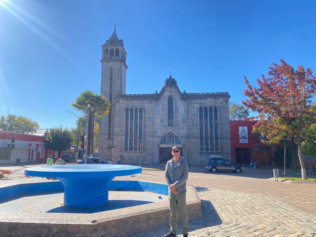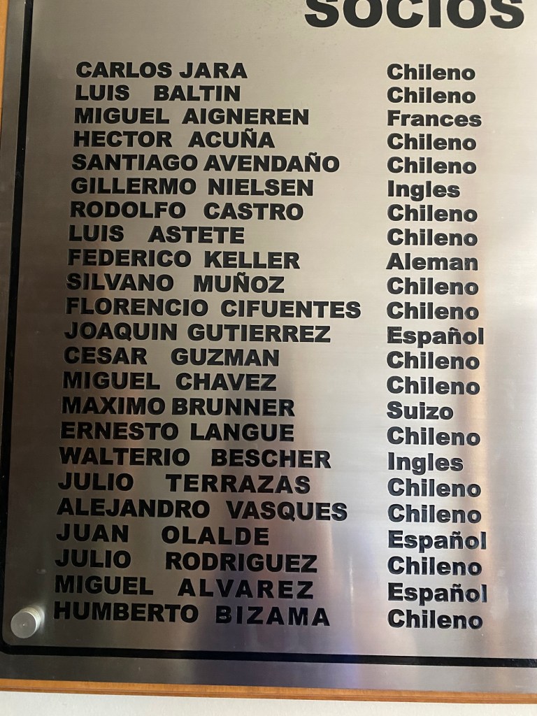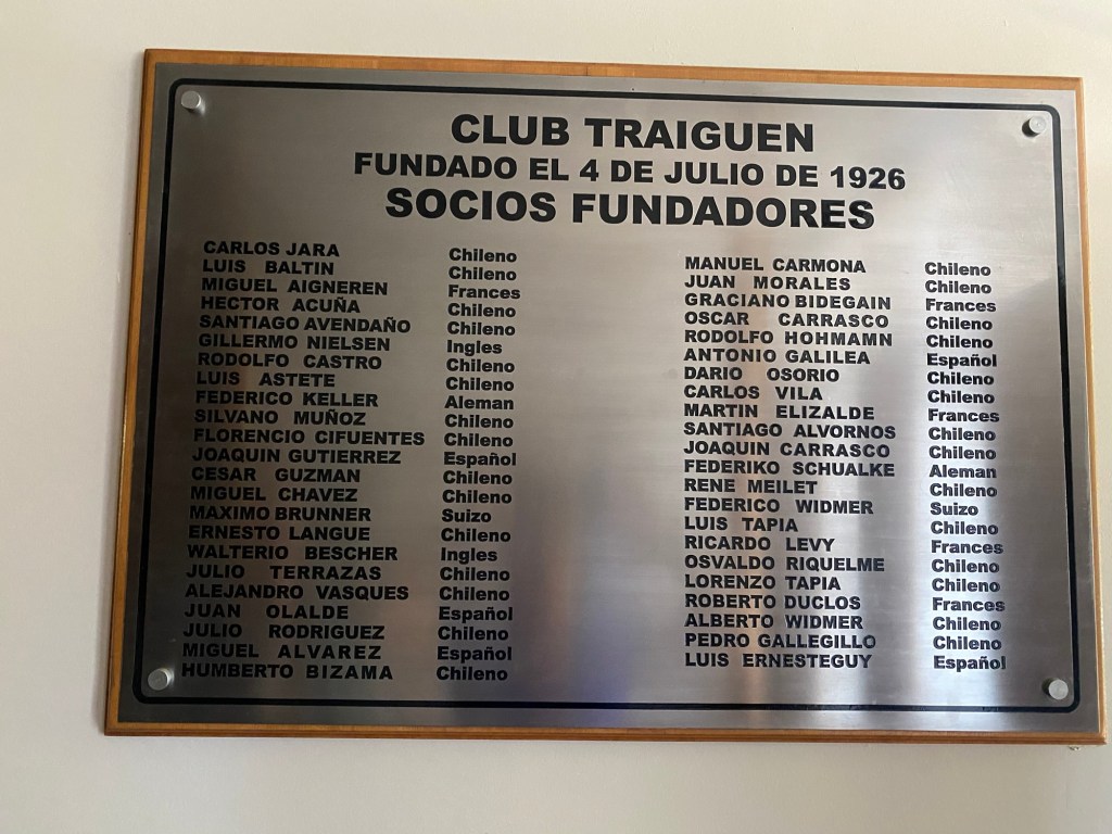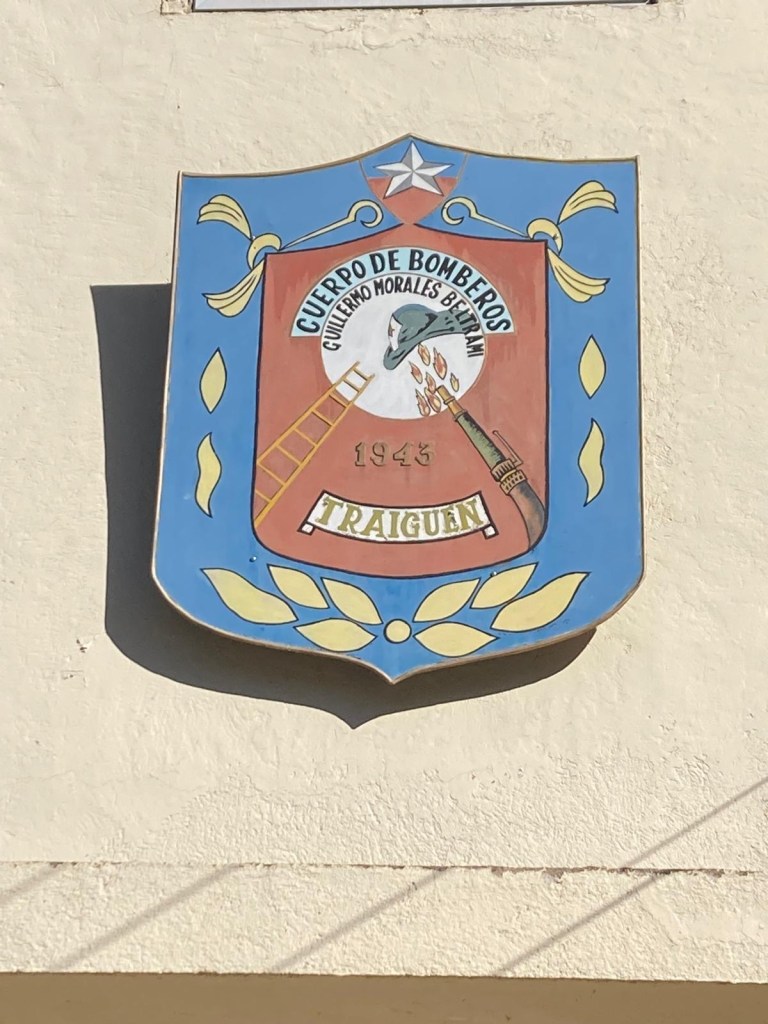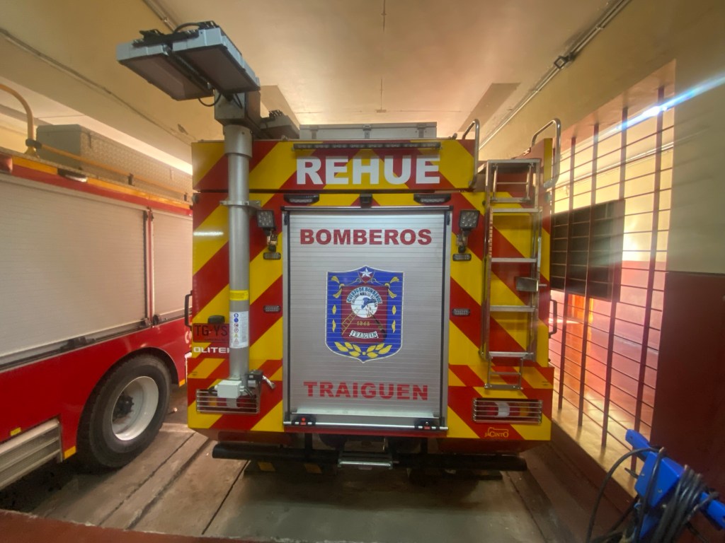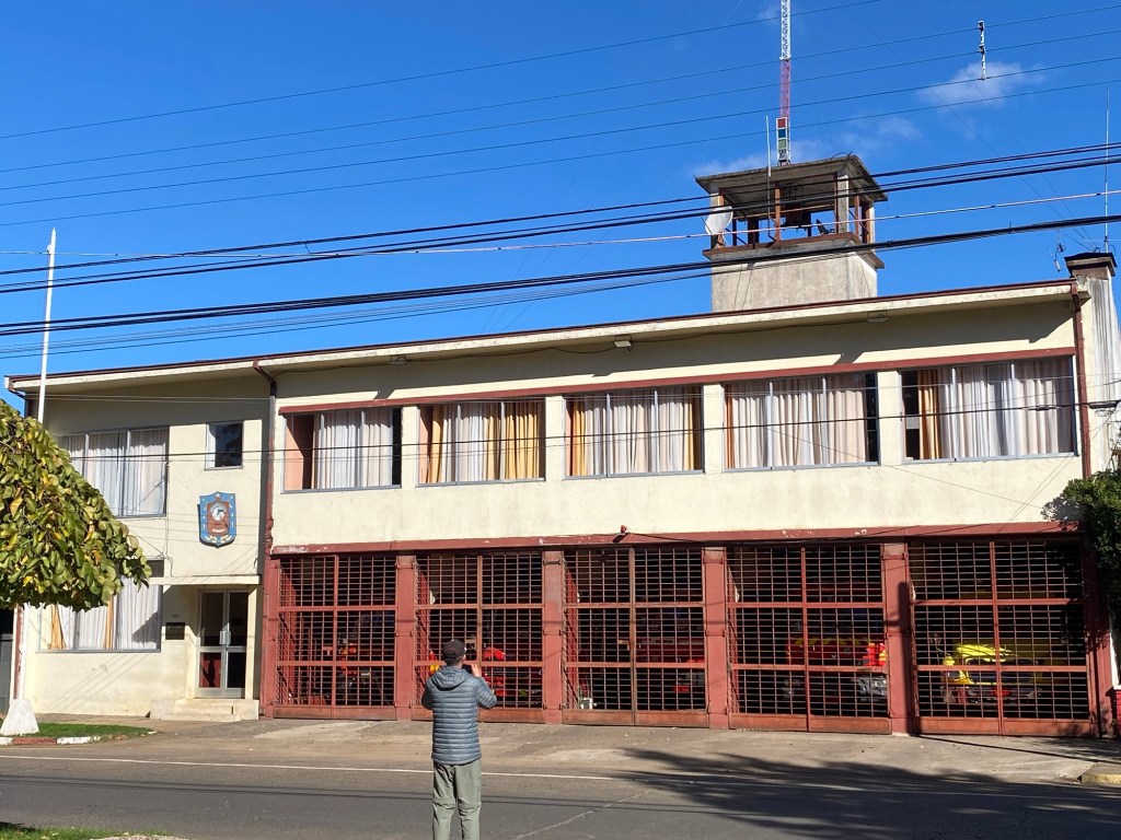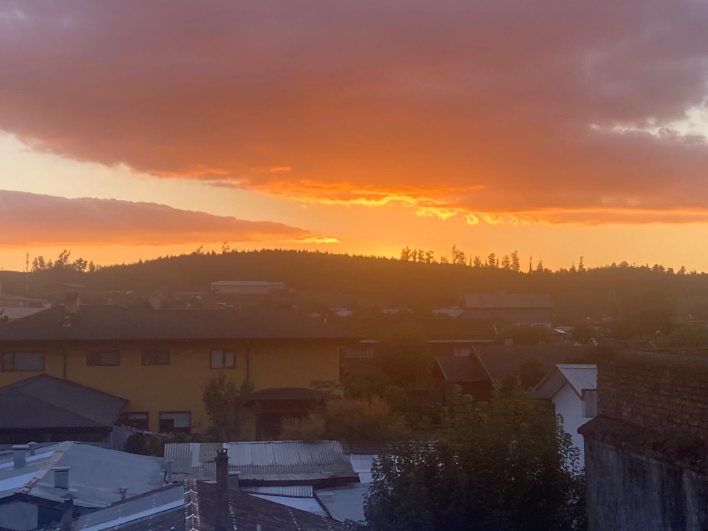 We were then shown to our room which had a large window overlooking the busy intersection below. There was a common room with windows overlooking the town and with tea and coffee facilities and a microwave. Our room had an electronic keypad (no key required to get in just a number code) and in order to get access to the bikes we had to ring the buzzer on the front door and say in Spanish “open the roller door”. We got just the things we needed off our bikes and then headed to the main plaza of the town in the search for some lunch. We passed a fire station and Andrew started taking pictures of the fire trucks when a lady came out and we managed to explain that my brother in law is a volunteer firefighter in Austria and we take pictures of fire stations and trucks for him and so she invited us in and gave us a private tour of the fire station which also is a volunteer firefighter station with 3 separate volunteer groups – we showed her pictures and videos from the Austrian station in Hornstein. We thanked her and left the station to get lunch at the club social next door – we had a salad with smoked salmon and fresh raspberry fruit juice and on the way out took pictures of the names of the founders of the Club as well as the past presidents, which were from Germany, Switzerland and France. We went back to our room and sat in the common room, had coffee and worked on the blog until a guy with two young girls arrived who were quite excited and loud and tried the older girl tried to keep talking to us in Spanish. We went back to our room after taking pictures of a nice sunset over town and decided to try the “König Bierhaus” for dinner which was across the road. It was fairly busy inside and we got the last table in the middle of the restaurant. We had just ordered when a young woman came up to us and asked where we were from – it must be obvious that we are foreigners 😂). She was one of the owners of the place and spoke English and she told us that they had just opened the restaurant a few days ago. She introduced us to her brother and co-owner Tomás and her wife who was in the kitchen cooking. There was a beer garden outside with an open fire place and she invited us to join them after dinner. As they had forgotten about Andrew’s beer and only brought it to the table after we had finished our dinner, I ordered a mojito and we joined the owners and another couple outside around the fire. We had some great conversations and learned a lot including the story of the red wine Carménère – we had not heard about that type of red wine or tried it yet , so they brought us a glass of a good Carménère to try “on the house” – it was great to chat and learn more about the town, the region and their business and lots of insight and stories including the struggles with the indigenous Mapuche tribes. They confirmed that it was not safe to travel to the coast South of Concepción, which we had also been told in Frutillar. We stayed to the end of the opening hours of their restaurant and shared WhatsApp details and took some pictures of us together at the fireplace before returning to our room. We had had a great evening and enjoyed meeting more wonderful people who add to our great experiences in Chile.