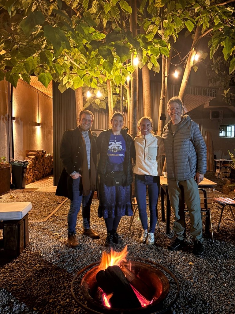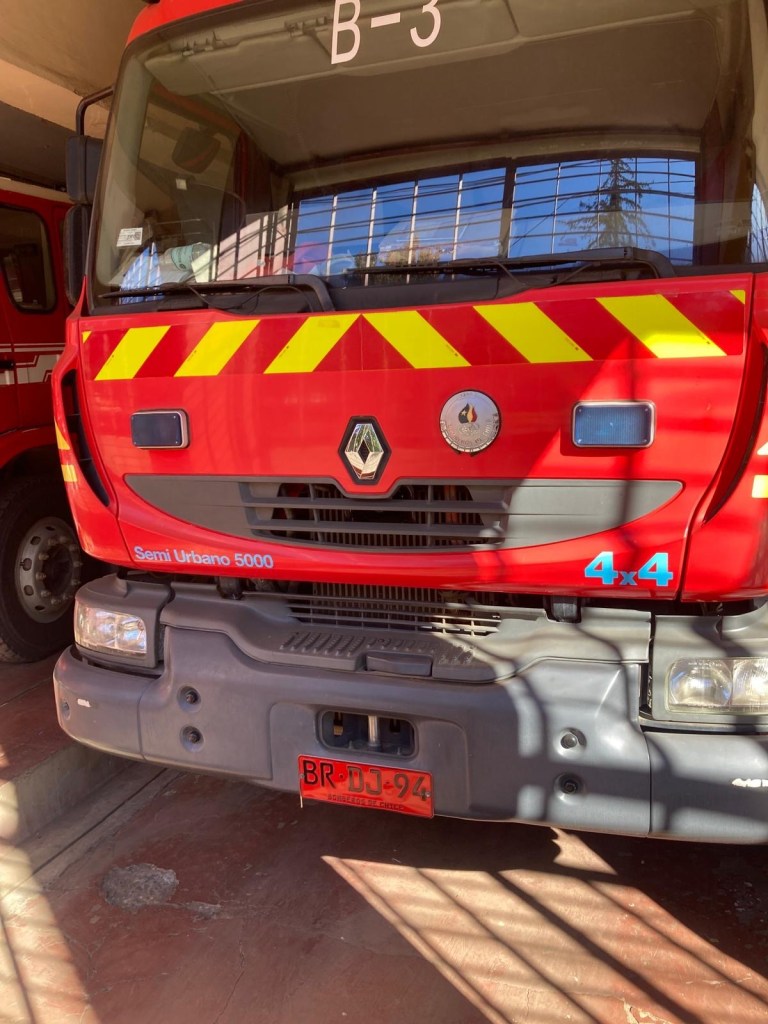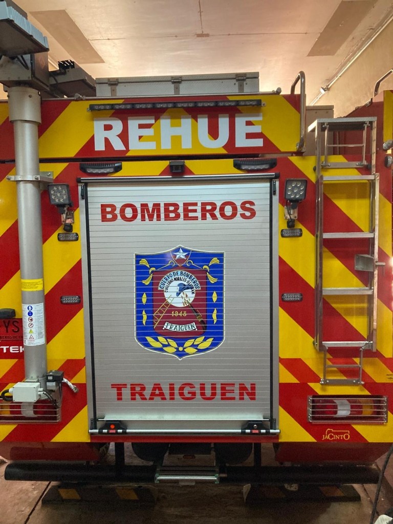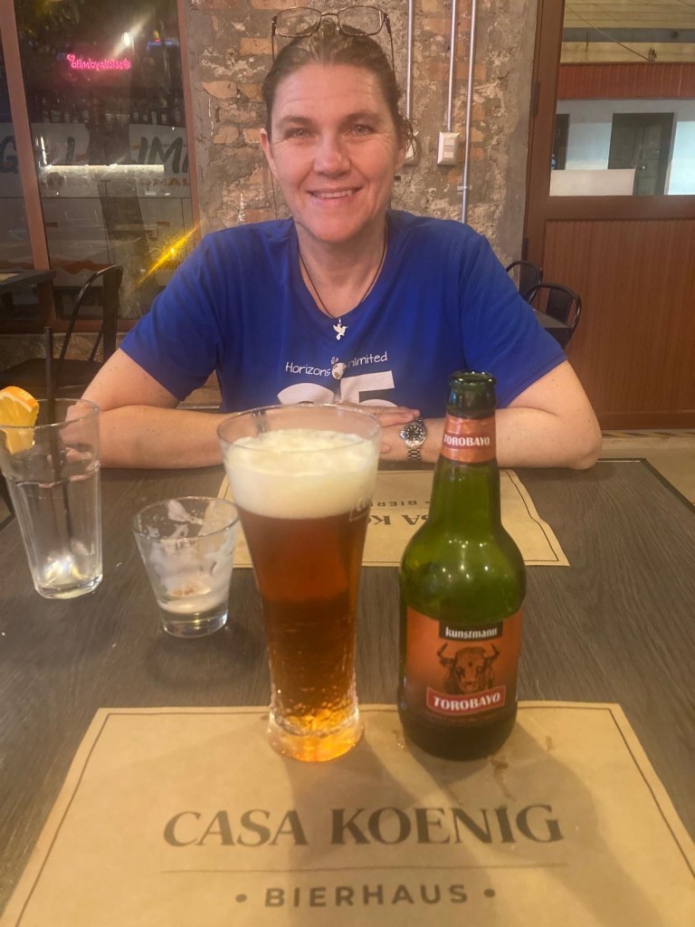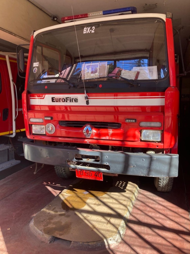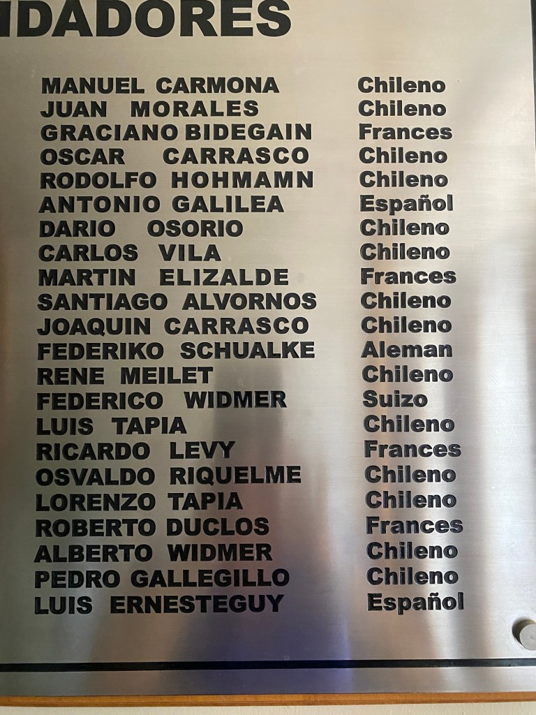 We were then shown to our room which had a large window overlooking the busy intersection below. There was a common room with windows overlooking the town and with tea and coffee facilities and a microwave. Our room had an electronic keypad (no key required to get in just a number code) and in order to get access to the bikes we had to ring the buzzer on the front door and say in Spanish “open the roller door”. We got just the things we needed off our bikes and then headed to the main plaza of the town in the search for some lunch. We passed a fire station and Andrew started taking pictures of the fire trucks when a lady came out and we managed to explain that my brother in law is a volunteer firefighter in Austria and we take pictures of fire stations and trucks for him and so she invited us in and gave us a private tour of the fire station which also is a volunteer firefighter station with 3 separate volunteer groups – we showed her pictures and videos from the Austrian station in Hornstein. We thanked her and left the station to get lunch at the club social next door – we had a salad with smoked salmon and fresh raspberry fruit juice and on the way out took pictures of the names of the founders of the Club as well as the past presidents, which were from Germany, Switzerland and France. We went back to our room and sat in the common room, had coffee and worked on the blog until a guy with two young girls arrived who were quite excited and loud and tried the older girl tried to keep talking to us in Spanish. We went back to our room after taking pictures of a nice sunset over town and decided to try the “König Bierhaus” for dinner which was across the road. It was fairly busy inside and we got the last table in the middle of the restaurant. We had just ordered when a young woman came up to us and asked where we were from – it must be obvious that we are foreigners 😂). She was one of the owners of the place and spoke English and she told us that they had just opened the restaurant a few days ago. She introduced us to her brother and co-owner Tomás and her wife who was in the kitchen cooking. There was a beer garden outside with an open fire place and she invited us to join them after dinner. As they had forgotten about Andrew’s beer and only brought it to the table after we had finished our dinner, I ordered a mojito and we joined the owners and another couple outside around the fire. We had some great conversations and learned a lot including the story of the red wine Carménère – we had not heard about that type of red wine or tried it yet , so they brought us a glass of a good Carménère to try “on the house” – it was great to chat and learn more about the town, the region and their business and lots of insight and stories including the struggles with the indigenous Mapuche tribes. They confirmed that it was not safe to travel to the coast South of Concepción, which we had also been told in Frutillar. We stayed to the end of the opening hours of their restaurant and shared WhatsApp details and took some pictures of us together at the fireplace before returning to our room. We had had a great evening and enjoyed meeting more wonderful people who add to our great experiences in Chile.