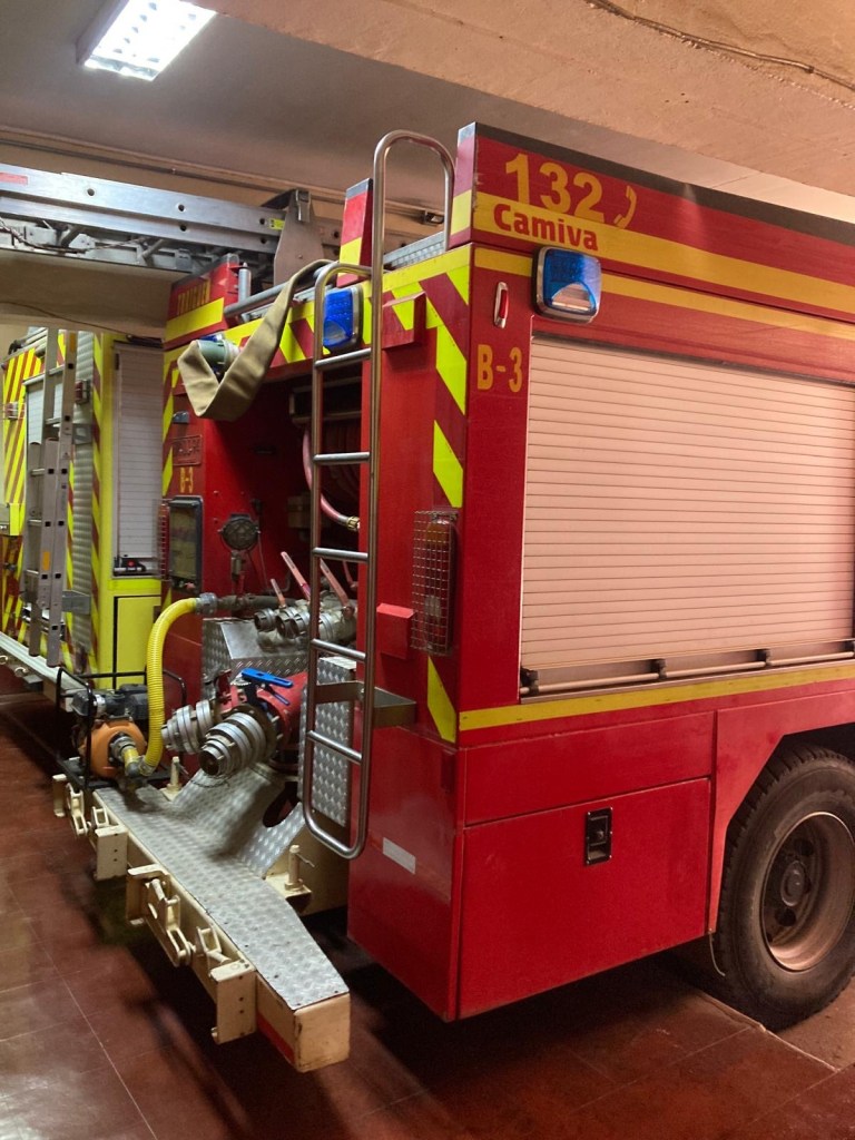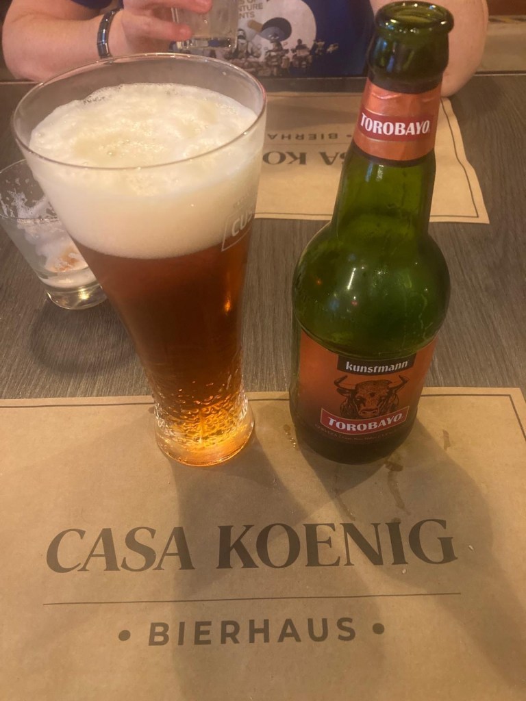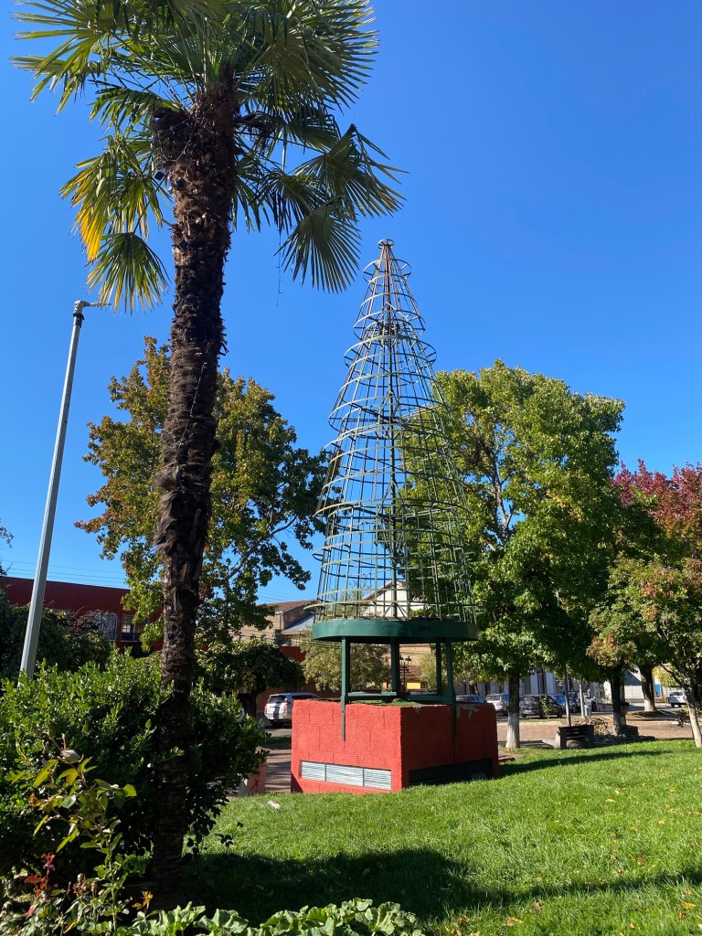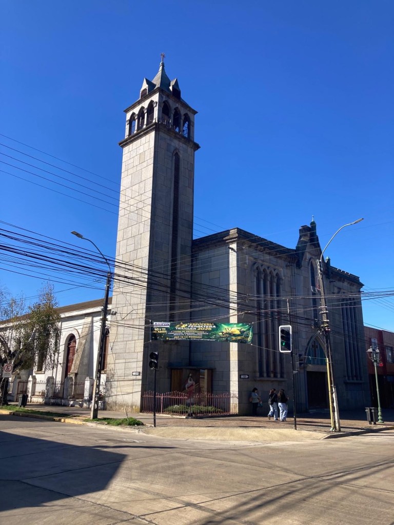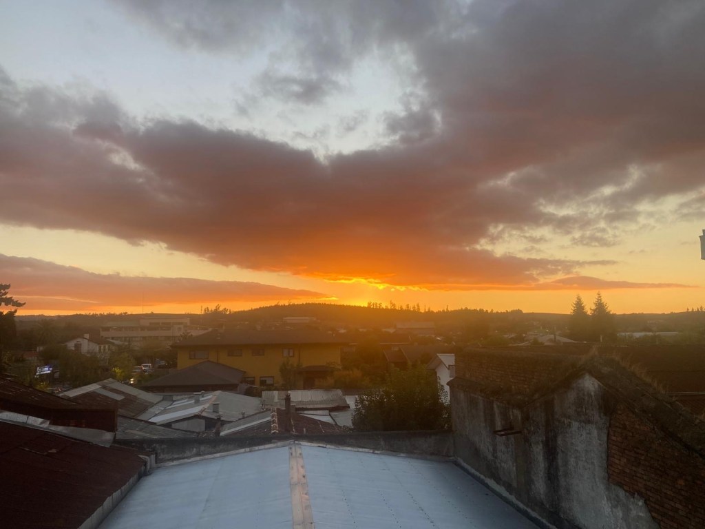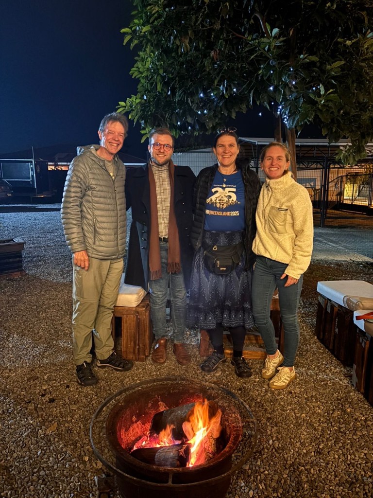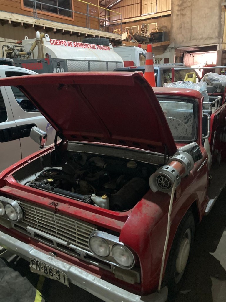 We were then shown to our room which had a large window overlooking the busy intersection below. There was a common room with windows overlooking the town and with tea and coffee facilities and a microwave. Our room had an electronic keypad (no key required to get in just a number code) and in order to get access to the bikes we had to ring the buzzer on the front door and say in Spanish “open the roller door”. We got just the things we needed off our bikes and then headed to the main plaza of the town in the search for some lunch. We passed a fire station and Andrew started taking pictures of the fire trucks when a lady came out and we managed to explain that my brother in law is a volunteer firefighter in Austria and we take pictures of fire stations and trucks for him and so she invited us in and gave us a private tour of the fire station which also is a volunteer firefighter station with 3 separate volunteer groups – we showed her pictures and videos from the Austrian station in Hornstein. We thanked her and left the station to get lunch at the club social next door – we had a salad with smoked salmon and fresh raspberry fruit juice and on the way out took pictures of the names of the founders of the Club as well as the past presidents, which were from Germany, Switzerland and France. We went back to our room and sat in the common room, had coffee and worked on the blog until a guy with two young girls arrived who were quite excited and loud and tried the older girl tried to keep talking to us in Spanish. We went back to our room after taking pictures of a nice sunset over town and decided to try the “König Bierhaus” for dinner which was across the road. It was fairly busy inside and we got the last table in the middle of the restaurant. We had just ordered when a young woman came up to us and asked where we were from – it must be obvious that we are foreigners 😂). She was one of the owners of the place and spoke English and she told us that they had just opened the restaurant a few days ago. She introduced us to her brother and co-owner Tomás and her wife who was in the kitchen cooking. There was a beer garden outside with an open fire place and she invited us to join them after dinner. As they had forgotten about Andrew’s beer and only brought it to the table after we had finished our dinner, I ordered a mojito and we joined the owners and another couple outside around the fire. We had some great conversations and learned a lot including the story of the red wine Carménère – we had not heard about that type of red wine or tried it yet , so they brought us a glass of a good Carménère to try “on the house” – it was great to chat and learn more about the town, the region and their business and lots of insight and stories including the struggles with the indigenous Mapuche tribes. They confirmed that it was not safe to travel to the coast South of Concepción, which we had also been told in Frutillar. We stayed to the end of the opening hours of their restaurant and shared WhatsApp details and took some pictures of us together at the fireplace before returning to our room. We had had a great evening and enjoyed meeting more wonderful people who add to our great experiences in Chile.