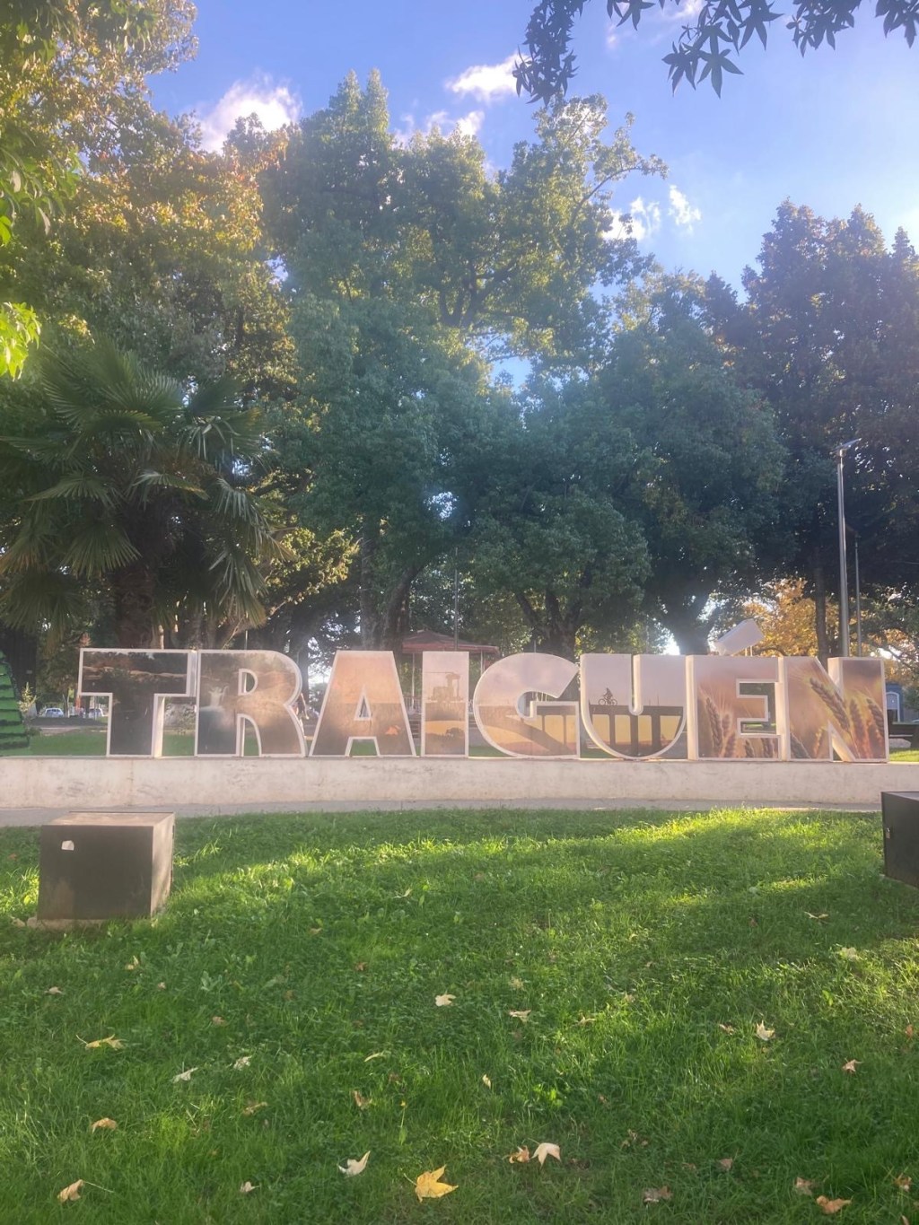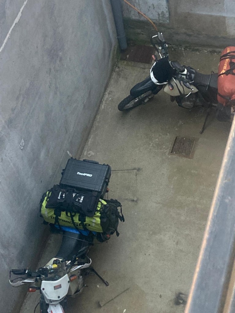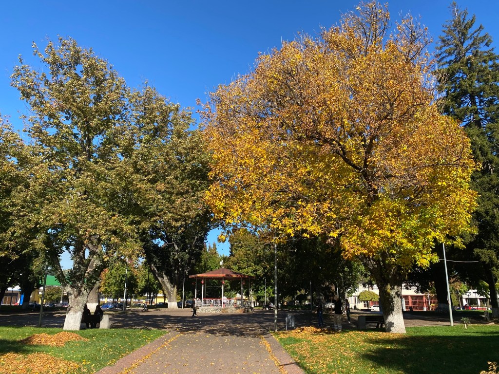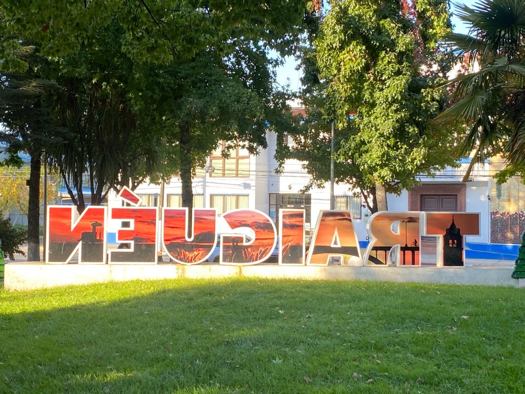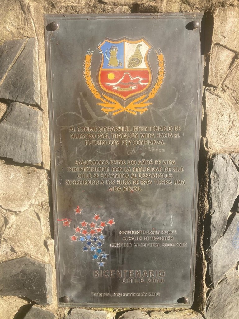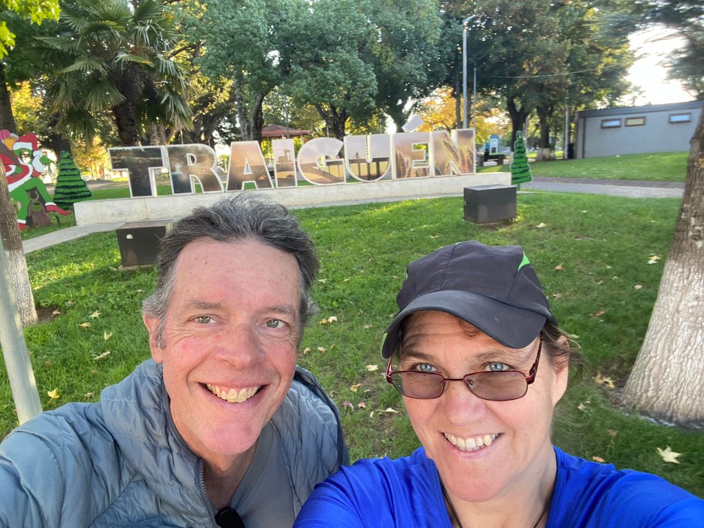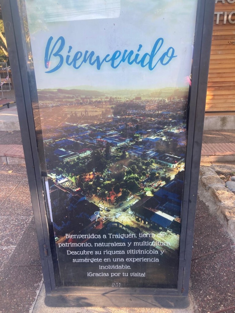 Andrew felt much better in the morning after a good night’s sleep. We had breakfast and left Temuco by lunch time – it was only a short 85km trip to our next overnight stay in Traiguén. We had passed through Traiguén in January and took pictures of the town sign which appeared to have German speaking influence and one of Andrew’s work colleagues mentioned that his mother-in-law came from that town which is why we decided to stay one night there on our way back. We had booked a studio (Herco suites) in the middle of town and when we arrived at the address we could not see anywhere to park – we pulled over on the side of the road when a lady came out and directed us to a roller door around the corner which she opened for us and we were able to ride the bikes on the pavement against a one way street into a small enclosed courtyard where we could securely park the bikes. We only took the essentials off and the lady was going to show us to our room – as we entered the street, 5 highschool girls went passed and asked where we were from and got very excited when we said Australia and they wanted to take a picture – so we posed for our celebrity shot 😉🤗 with four of the girls while the fifth one took the picture of them with us.