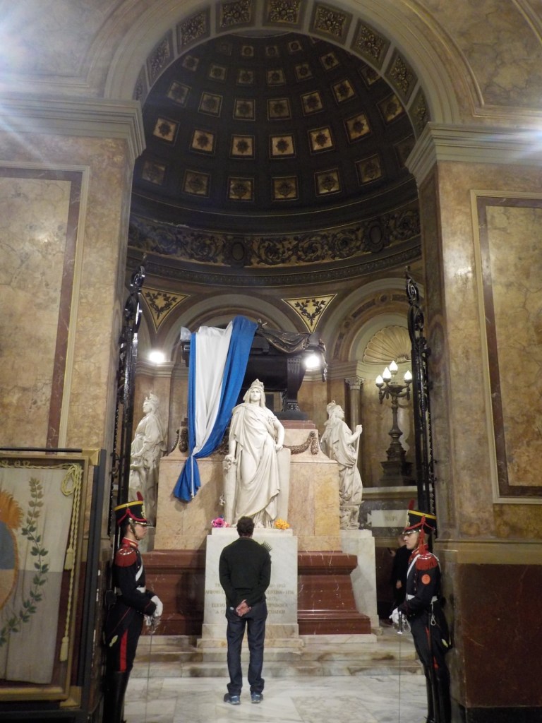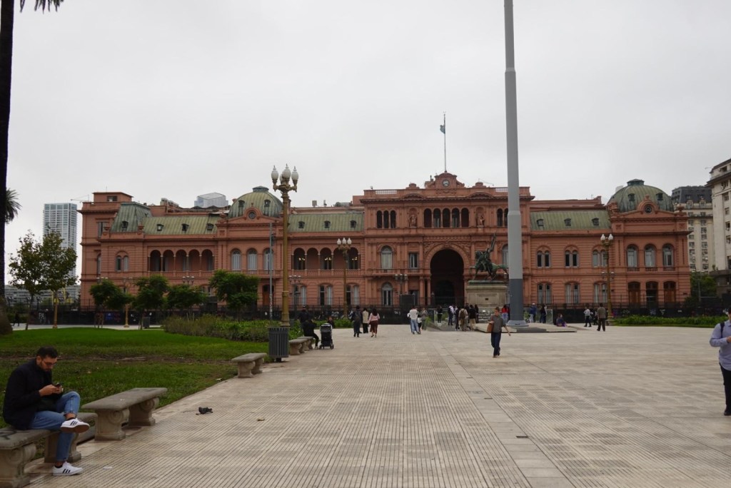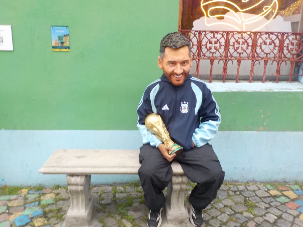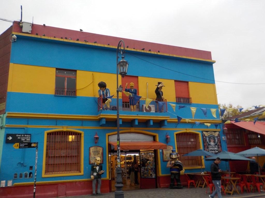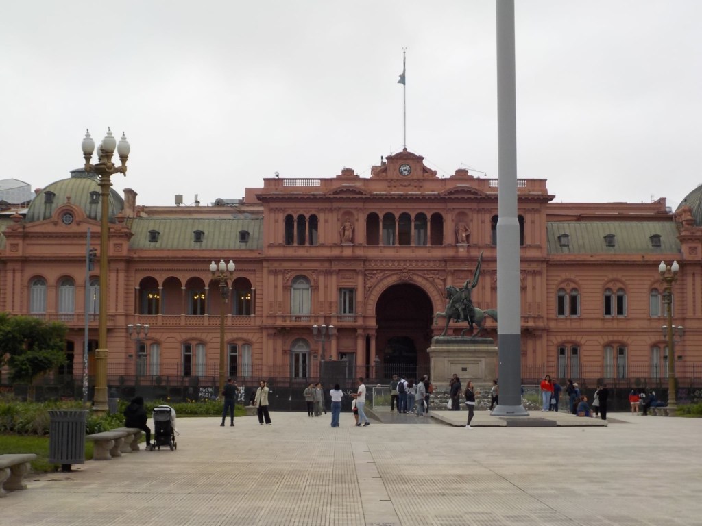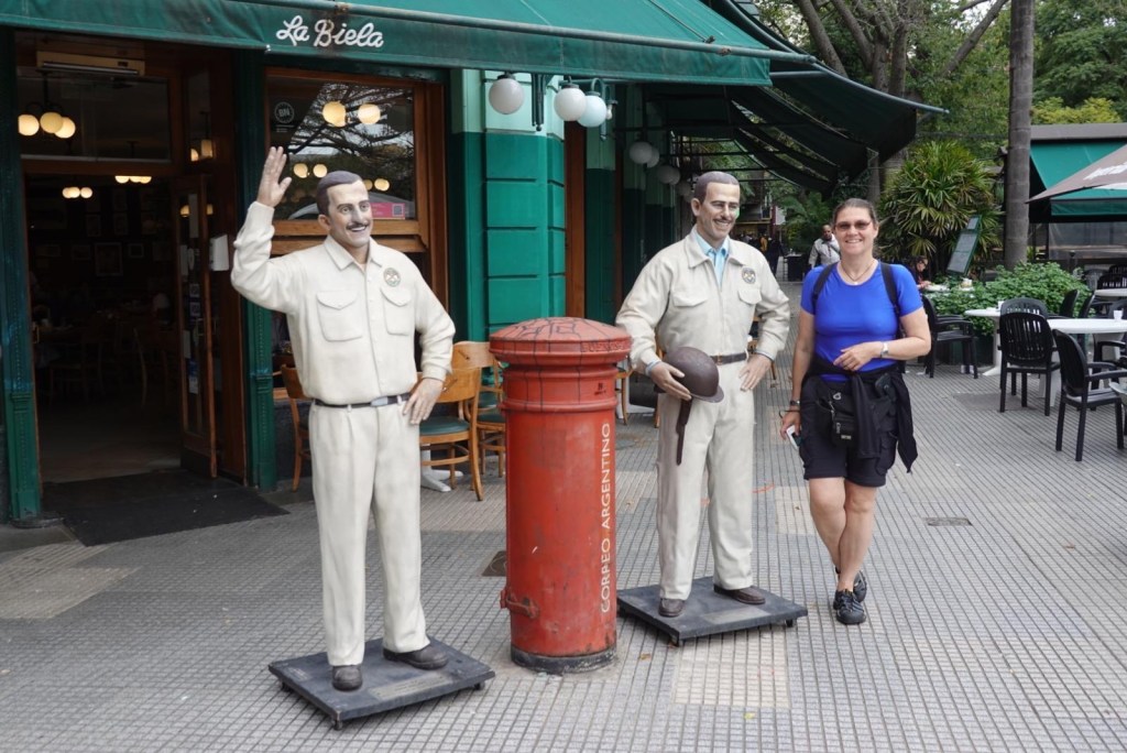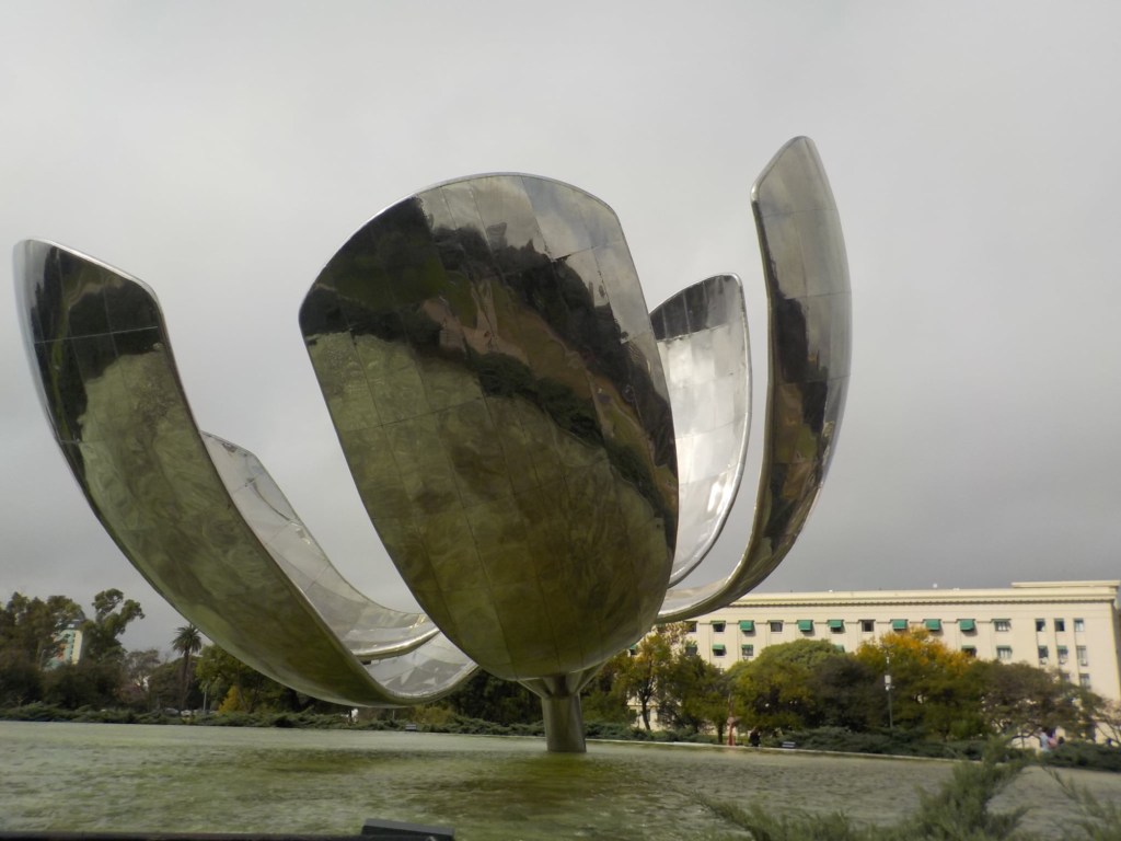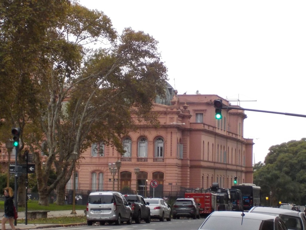 We walked back to the hotel taking more pictures of the beautiful pink flowers and large green fruit of the Silk Floss Tree – locally known as Palo Borracho (Ceiba speciosa). We just had enough time to charge the cameras and phones a bit more before we went downstairs to wait to be picked up for our tour. Gisela was our tour guide and we travelled in a small commuter bus and there were only 5 including us, a couple from Peru and a younger guy from Brazil. The tour was very informative and Gisela was very passionate and fluently switched between Spanish and English to explain all the sites and history. We stopped 6 times including at a large sculpture of a flower (Florales Genérica) made of 18 tons of steel which used to open and close but the mechanism is broken and can’t be fixed – so the flower is stuck half open. We stopped at the famous La Recoleta cementary and at the Basilica Nuestra Senora del Pilar. The next stop was at the plaza de Mayo with the cathedral and the pink Parliament House. We had time to walk around and go inside the cathedral where the mausoleum of the Argentinian father of the Nation, General José de San Martin, is guarded by two National guard grenadiers. Then we visited the La Boca part of town which is known for the colourful painted houses made of whatever material was available from the ship yard. The next stop was at a wine tasting place, followed by a stop in La Boca where all houses are colourful and put together from whatever was available from the nearby shipyards. It is also a place of street art, colourful murals honouring firefighters and lots of football paraphernalia and statues of Diego Maradona, Eva Perón, a famous tango dancer, Carlos Gardel, and the Argentinien pope Francis – an interesting combination 😂😉