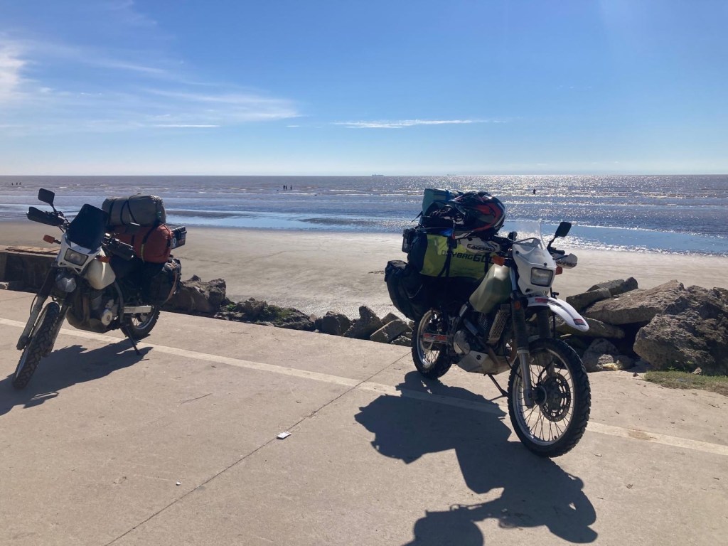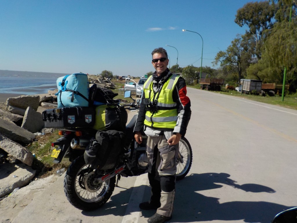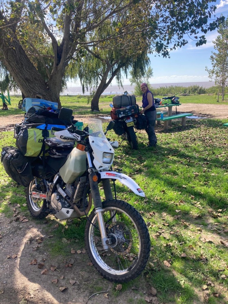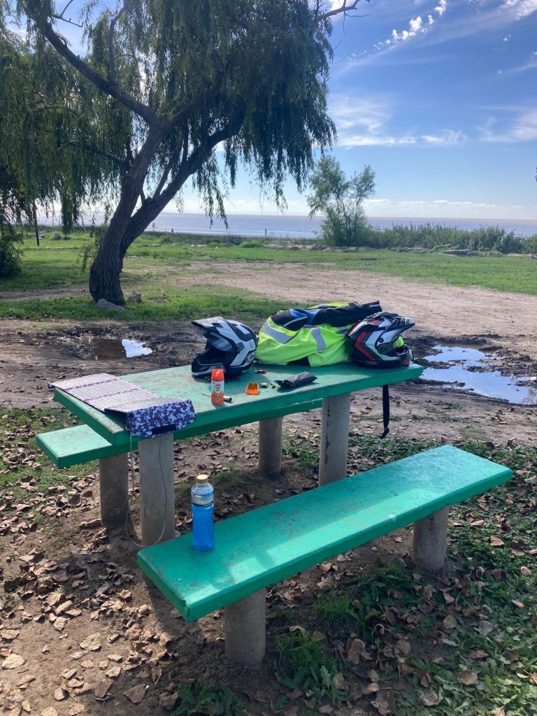 We rode to the end of the road and decided to stop at one of the picnic areas on the waterfront to fix my left indicator at the back which had stopped working and have some lunch before heading to Buenos Aires where we could only check in after 3:00pm. We pulled into a shady spot and I got all our spare parts out (luckily without having to completely take everything off) and Andrew got a Philips head screwdriver out of the original tool kit and I even managed to get to the screws without having to take my panniers off 😉👍 I was kneeling in the grass when I realised that the mosquitoes had found me and I had been bitten several times – these mosquitoes not only leave very itchy welts but when they sting it is as painful as a horse fly bite 😳 – after covering myself in repellent, I continued to get the bulb out and when inspecting what bulbs we had with us as spares, the ones that were the same size bulb were for the break light but smaller ones we had fitted- we put a new one in and tested it and it worked fine 👍🙂- when I inspected the old bulb, the element looked not broken so we tried the old bulb and it worked too- must have just rattled loose in the fitting – while we were working on the bike a guy with his son came over to say hello and ask where we were from. We had a chat and he wanted to know all about the bikes including what the “roo whistle” was for😂. We gave his son some stickers of Australian animals which he really liked – as it was Sunday lunch time, the place was bustling with locals grilling meat and fishing in the very brown water of the La Plata delta. After we put everything back together and packed up, we had our last bread, avocado and tuna sandwich. We had just finished eating when a couple came over with a wooden bread board with bread and grilled sausages and lemon and a dip they wanted us to have. They took photos of us (we seem to be a bit of a novelty with the locals at some of the places off the beaten path and they must not often get to see tourist travellers😉) and we really enjoyed the nice flavour of the grilled meat. Such nice people everywhere 🤗