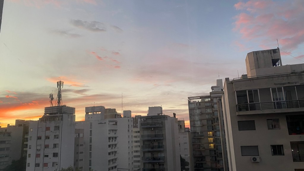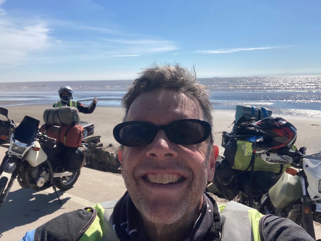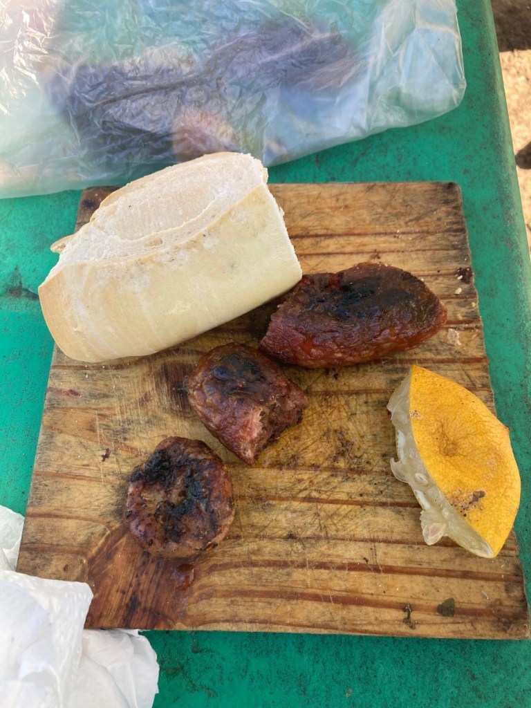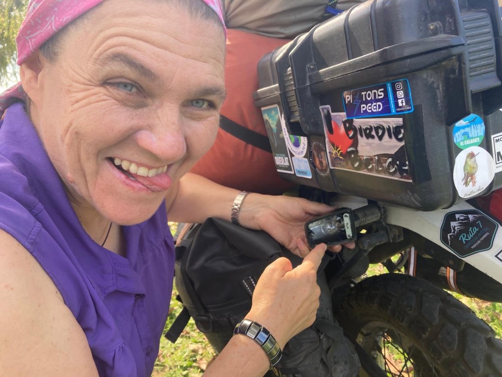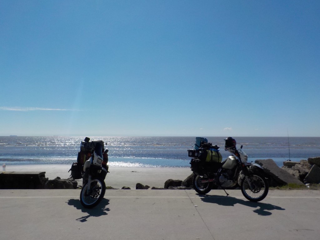 We rode to the end of the road and decided to stop at one of the picnic areas on the waterfront to fix my left indicator at the back which had stopped working and have some lunch before heading to Buenos Aires where we could only check in after 3:00pm. We pulled into a shady spot and I got all our spare parts out (luckily without having to completely take everything off) and Andrew got a Philips head screwdriver out of the original tool kit and I even managed to get to the screws without having to take my panniers off 😉👍 I was kneeling in the grass when I realised that the mosquitoes had found me and I had been bitten several times – these mosquitoes not only leave very itchy welts but when they sting it is as painful as a horse fly bite 😳 – after covering myself in repellent, I continued to get the bulb out and when inspecting what bulbs we had with us as spares, the ones that were the same size bulb were for the break light but smaller ones we had fitted- we put a new one in and tested it and it worked fine 👍🙂- when I inspected the old bulb, the element looked not broken so we tried the old bulb and it worked too- must have just rattled loose in the fitting – while we were working on the bike a guy with his son came over to say hello and ask where we were from. We had a chat and he wanted to know all about the bikes including what the “roo whistle” was for😂. We gave his son some stickers of Australian animals which he really liked – as it was Sunday lunch time, the place was bustling with locals grilling meat and fishing in the very brown water of the La Plata delta. After we put everything back together and packed up, we had our last bread, avocado and tuna sandwich. We had just finished eating when a couple came over with a wooden bread board with bread and grilled sausages and lemon and a dip they wanted us to have. They took photos of us (we seem to be a bit of a novelty with the locals at some of the places off the beaten path and they must not often get to see tourist travellers😉) and we really enjoyed the nice flavour of the grilled meat. Such nice people everywhere 🤗